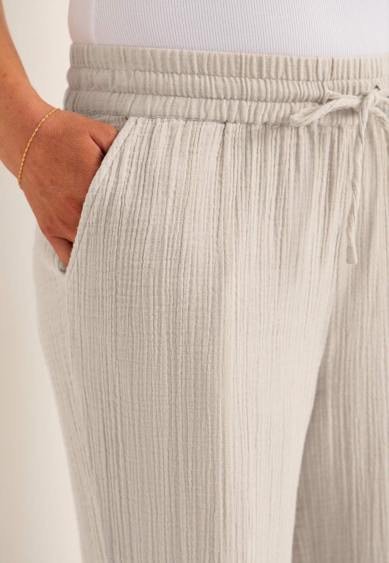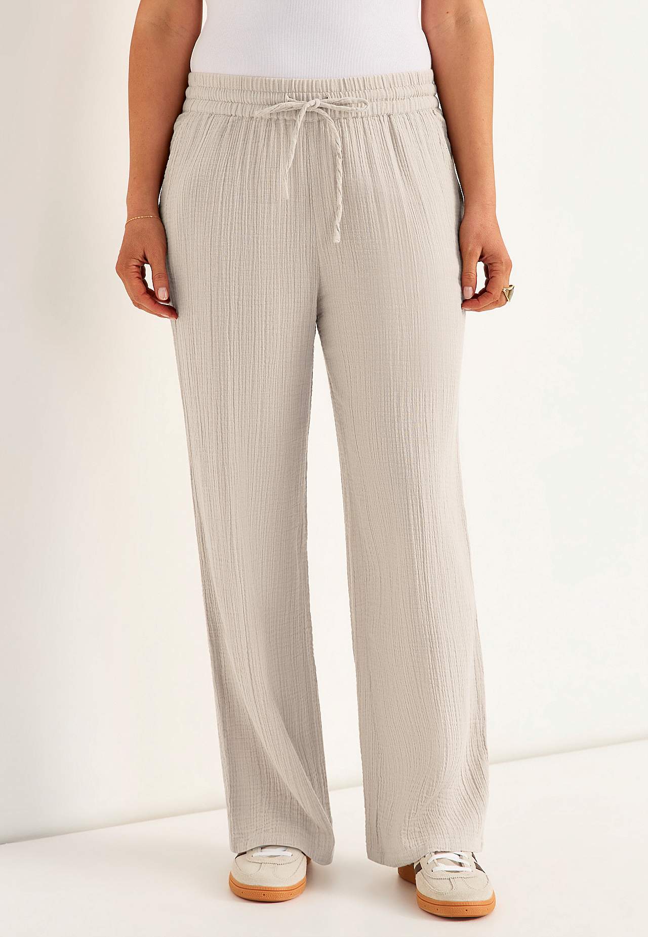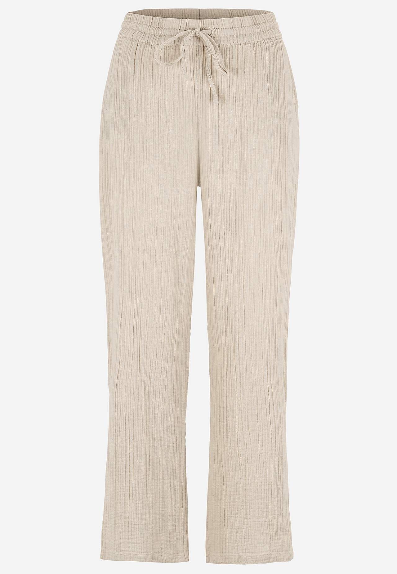 Broek van aardig katoenen gaas met naturel structuur. Gevlochten en zacht materiaal met verkoelend en luchtig gevoel. Wijde en zachte elastische tailleband met trekkoord. Schuine broekzakken aan de voorkant. Lange en wijde benen. De binnenbeenlengte is ​​bij alle maten ca. 73 cm.