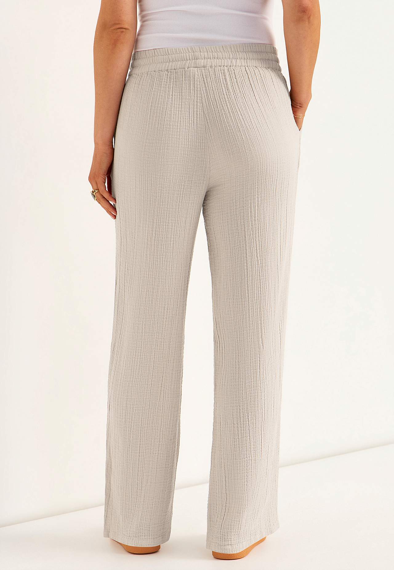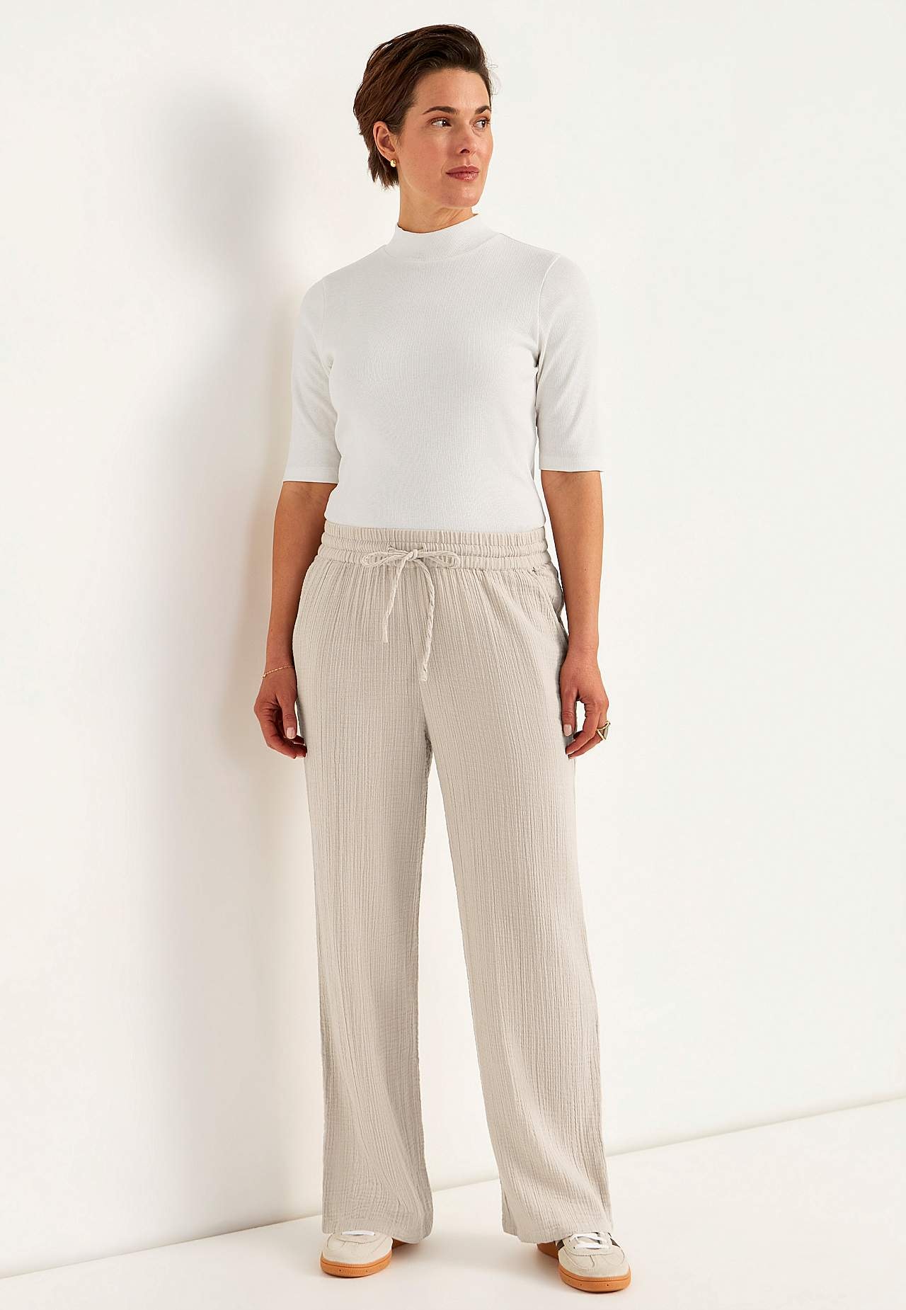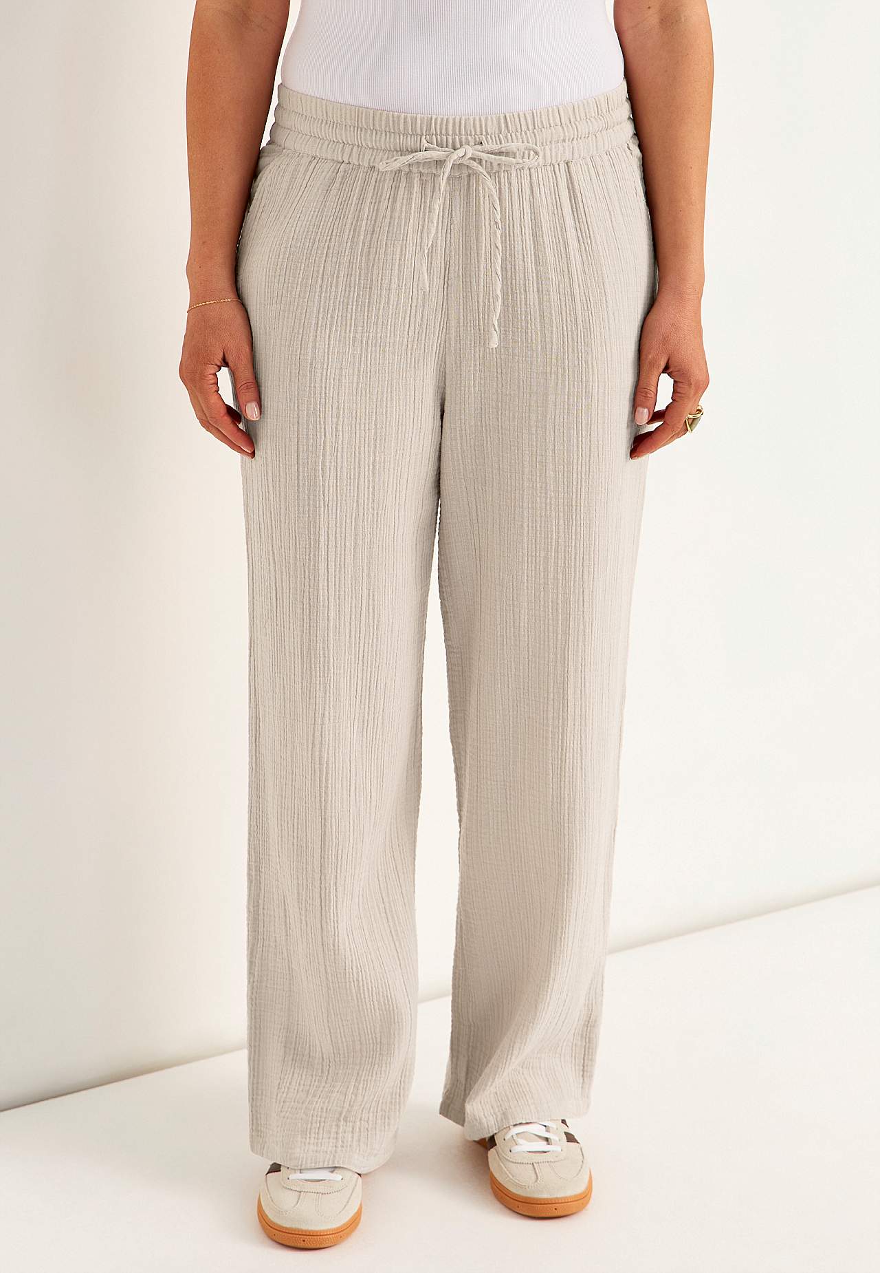 Broek van aardig katoenen gaas met naturel structuur. Gevlochten en zacht materiaal met verkoelend en luchtig gevoel. Wijde en zachte elastische tailleband met trekkoord. Schuine broekzakken aan de voorkant. Lange en wijde benen. De binnenbeenlengte is ​​bij alle maten ca. 73 cm.