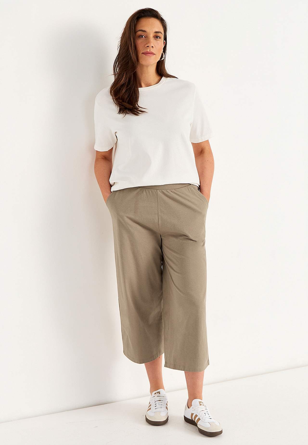 Culotte van zacht en organisch katoen. Jersey broek met wijde en rechte benen. Informele pasvorm. Hoog taille met brede en comfortabelle elastische tailleband. Schuine zijzakken. Combineer met 702634. De binnenbeenlengte varieert afhankelijk van de maat: ongeveer 57-59 cm. De voorkant varieert met de maat: ongeveer 29-39 cm... Meer lezen
