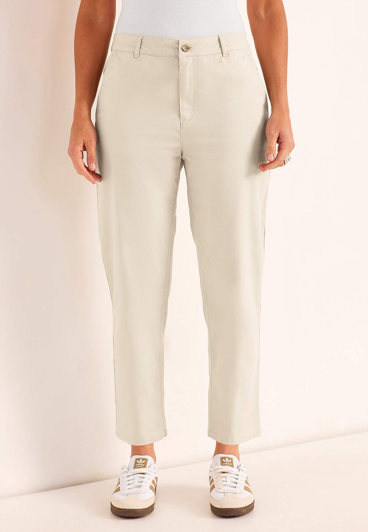 Comfortabelle broeken van gevlochten katoen met rek. Strak design, relaxed maar toch verfijnd. Gemakkelijk te combineren met een T-shirt, blouse of blazer. Informele pasvorm met rechte lichtjes toelopende broekspijpen. Normale taille met riem lussen. Rits met rits. Schuine steekzakken. Namaak steekzakken op het achterpand. ... Meer lezen
