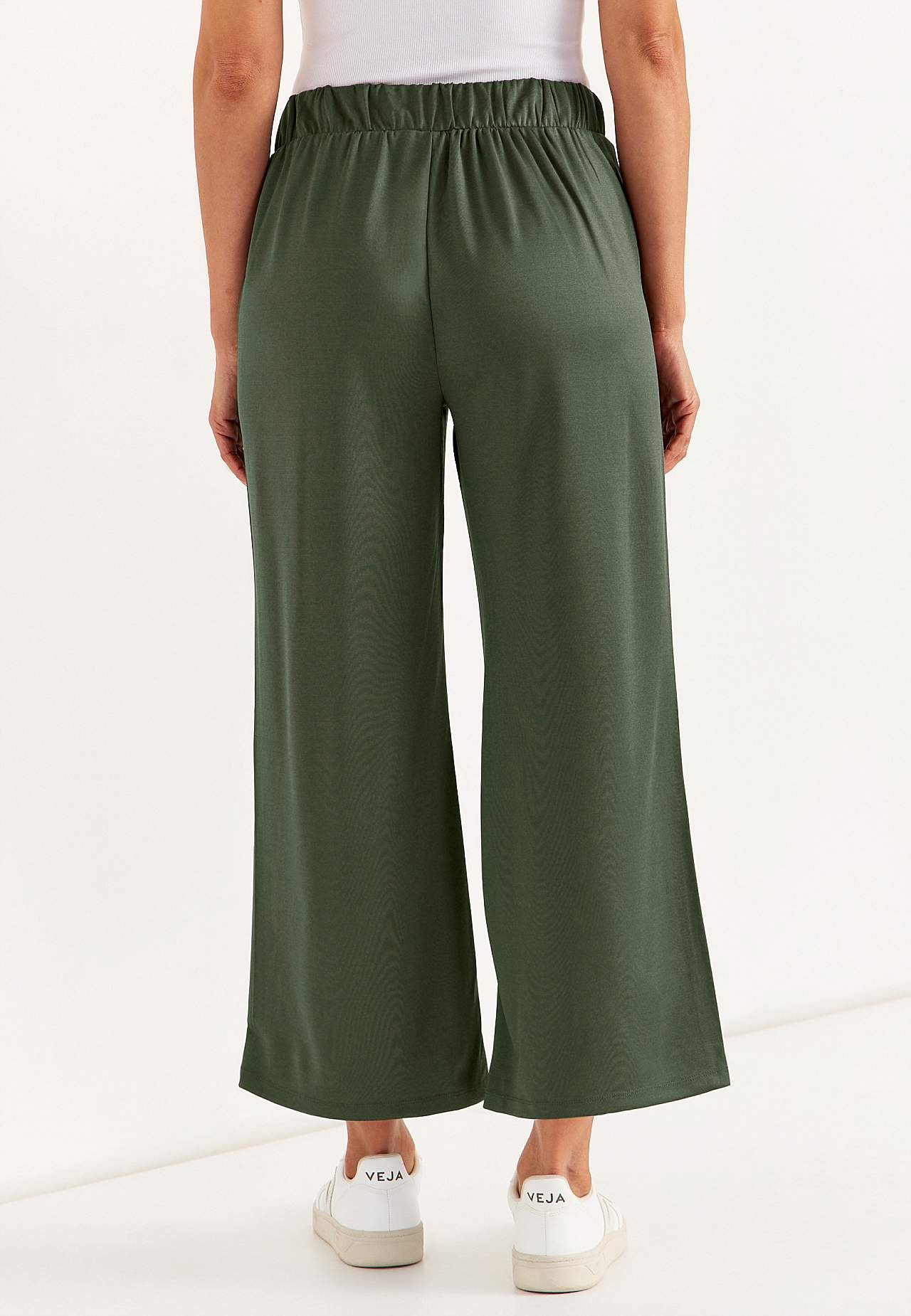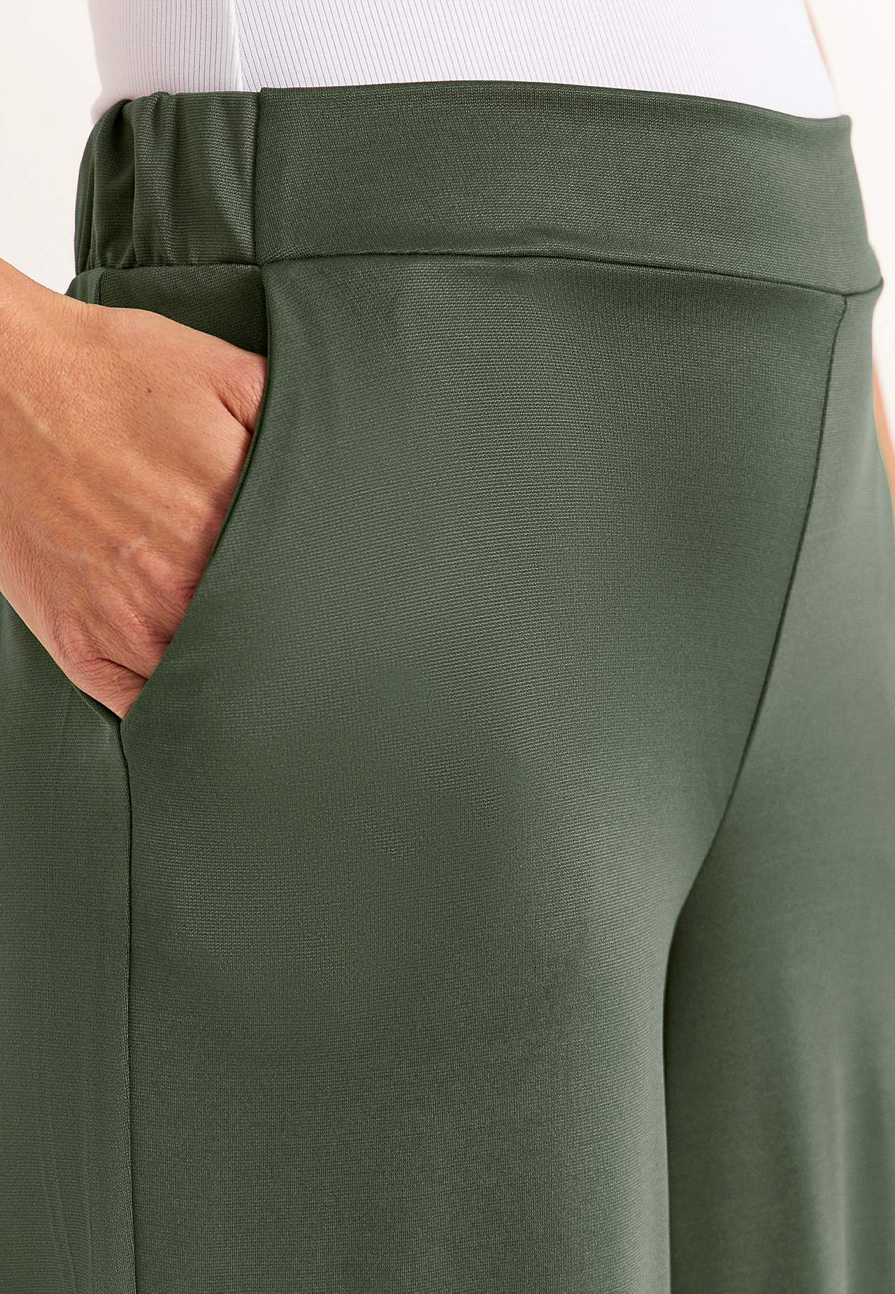 Enkelbroek met wijde benen. Elastische en gladde jersey met mooie glans. Brede ceintuur met verborgen elastiek achter. Zijnaad zakken. De binnenbeenlengte is bij alle maten ca. 62 cm. De voorkant varieert met de maat: ongeveer 26-37 cm.