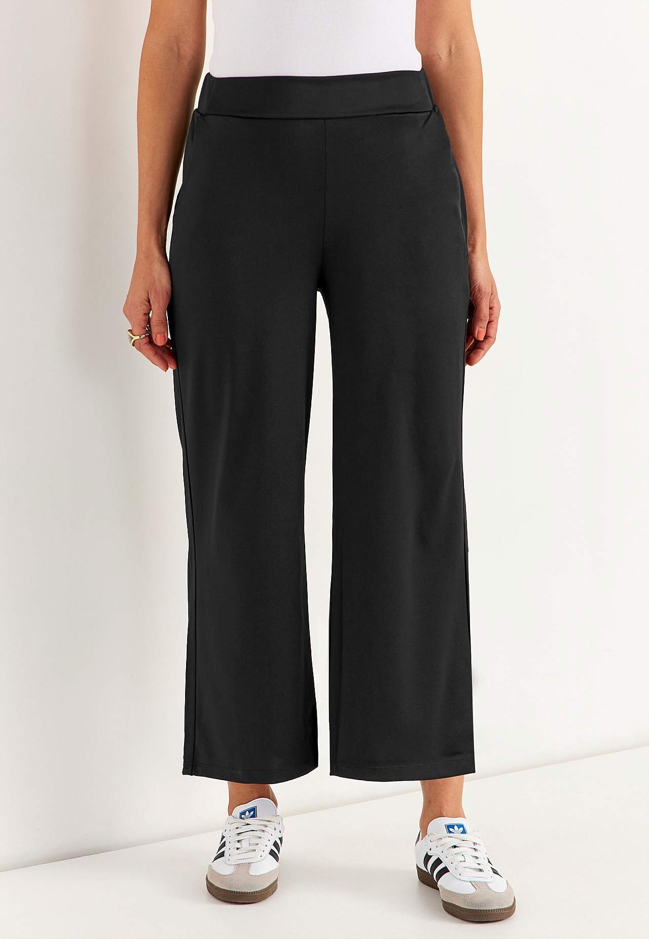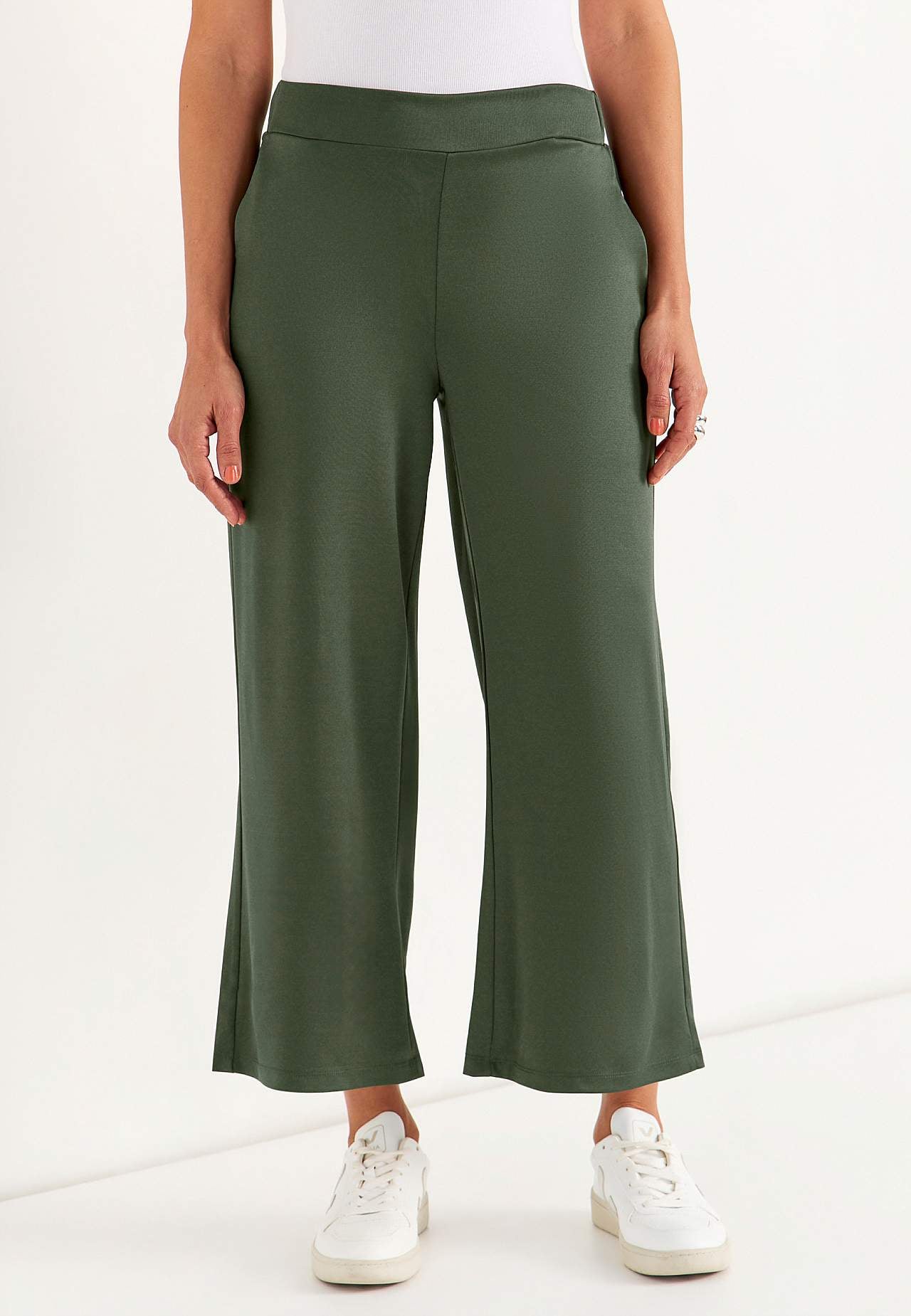 Enkelbroek met wijde benen. Elastische en gladde jersey met mooie glans. Brede ceintuur met verborgen elastiek achter. Zijnaad zakken. De binnenbeenlengte is bij alle maten ca. 62 cm. De voorkant varieert met de maat: ongeveer 26-37 cm.