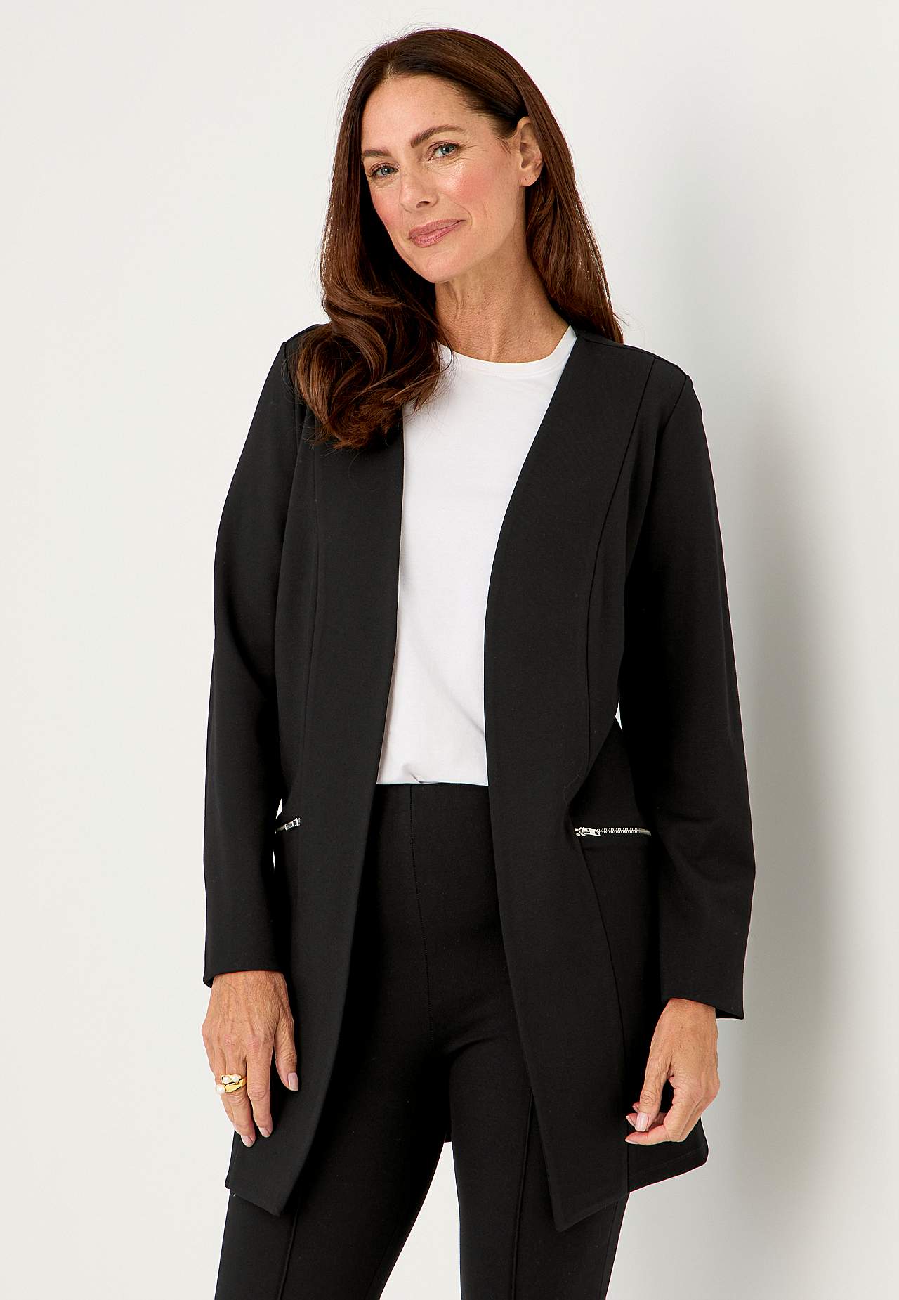 Informele en open colbert. Zware en elastische jersey-kwaliteit. Comfortabel en lang model. Zakken met zilverkleurige ritsen. Lange en rechte mouwen. Lichte ronde zoom. Ongelijnd. De ruglengte varieert per maat: ca. 78-89 cm.