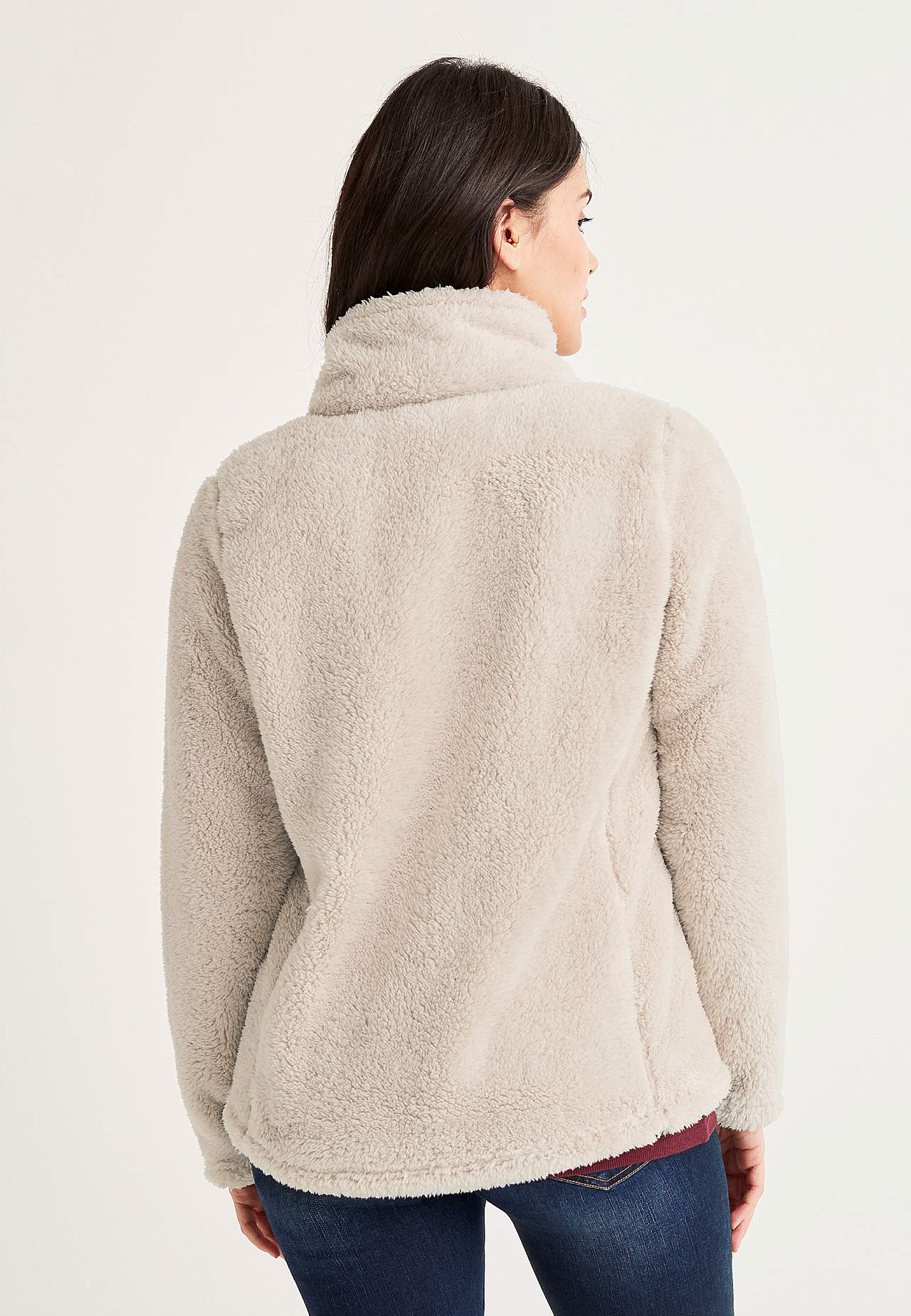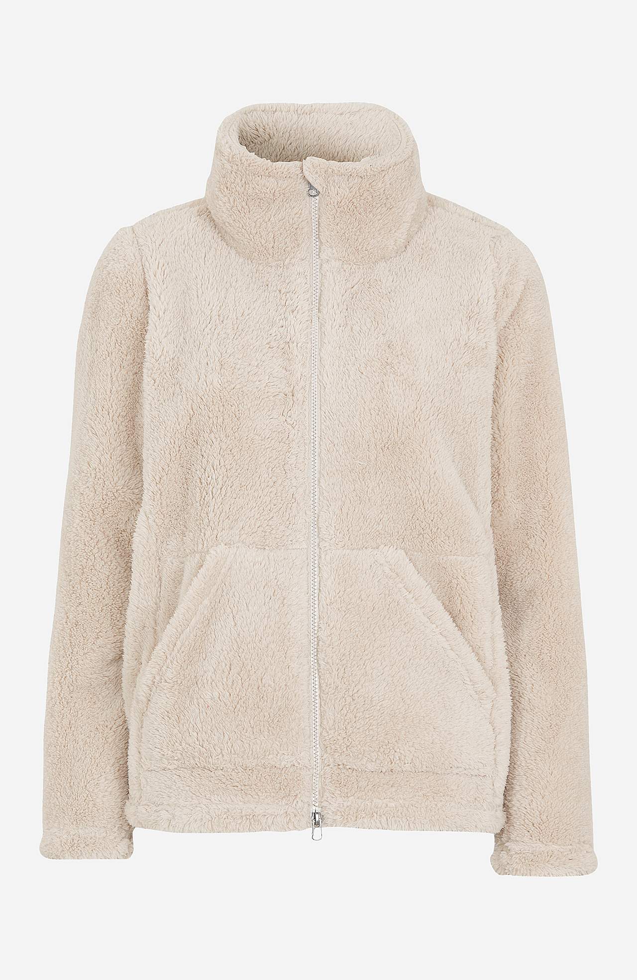 Zachte fleece-jas met openstaande kraag. Tweezijdige ritssluiting. Twee zakken aan de voorkant. Ongelijnd. De lengte varieert afhankelijk van de grootte: ongeveer 65-72 cm vanaf de achterste schouder.