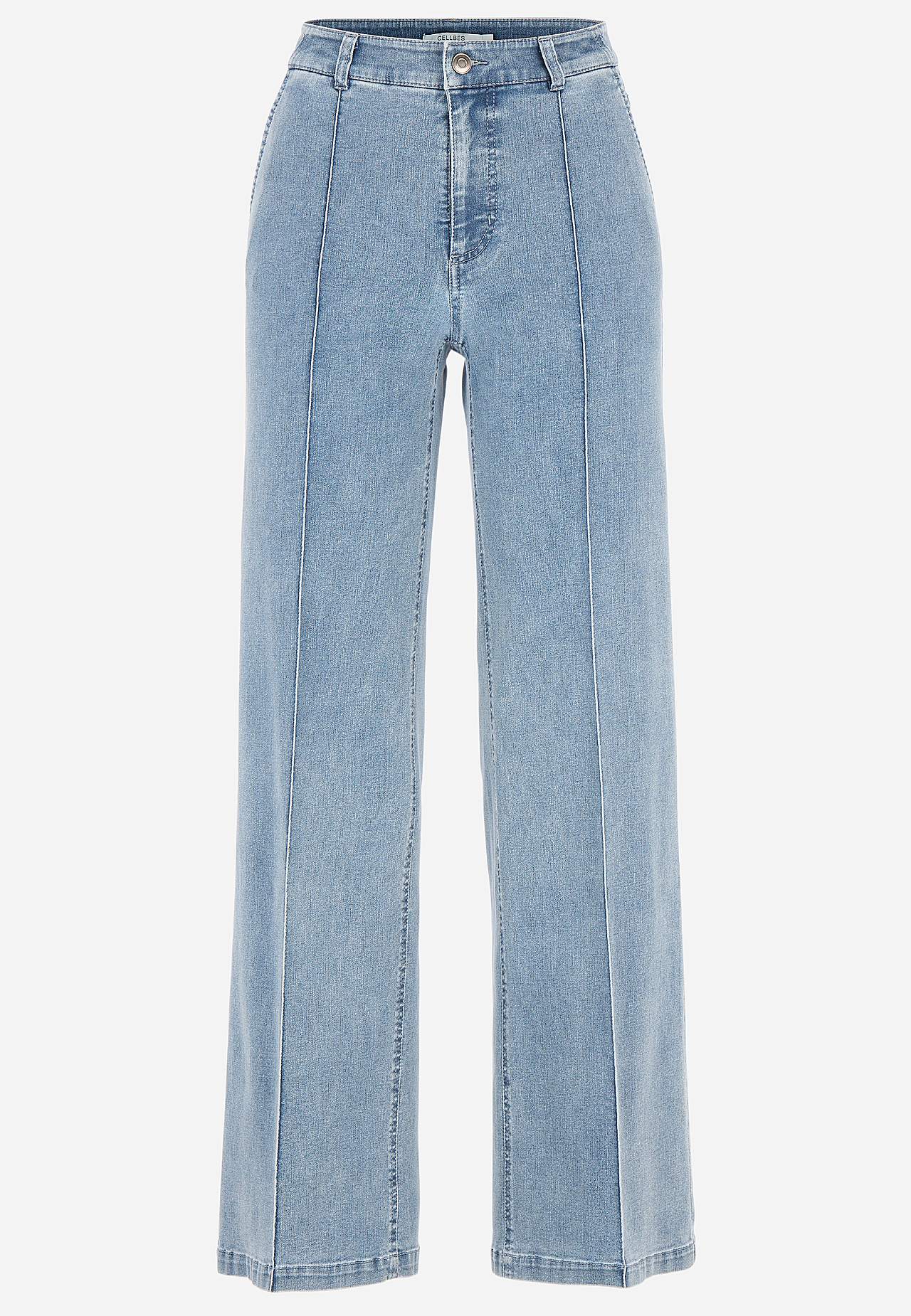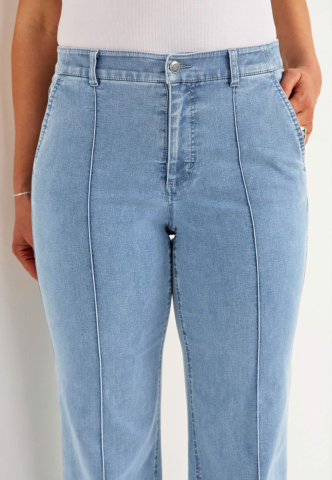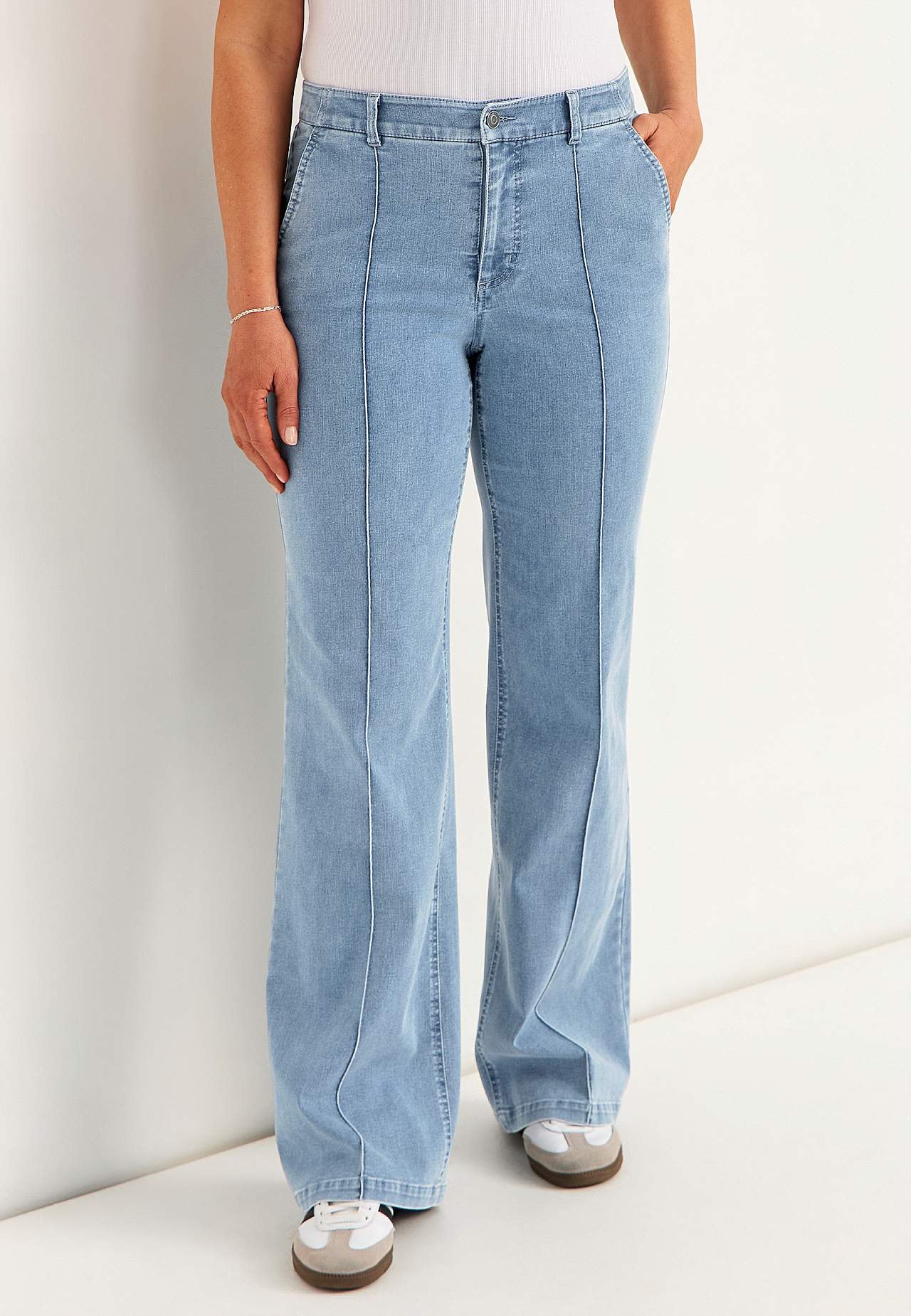 Spijkerbroek van elastische denim. Gestikte vouwen aan de voorkant. Normale taille. Recht ontwerp. Wijde benen. Ceintuur met riem lussen. Rits met knop. Scheve zijzakken aan de voorkant. Twee achterzakken. Verkrijgbaar in twee lengtes. Twee binnenbeenlengtes: Normaal ca. 80 cm. Lang ca. 85 cm. De voorkant varieert met de ma... Meer lezen