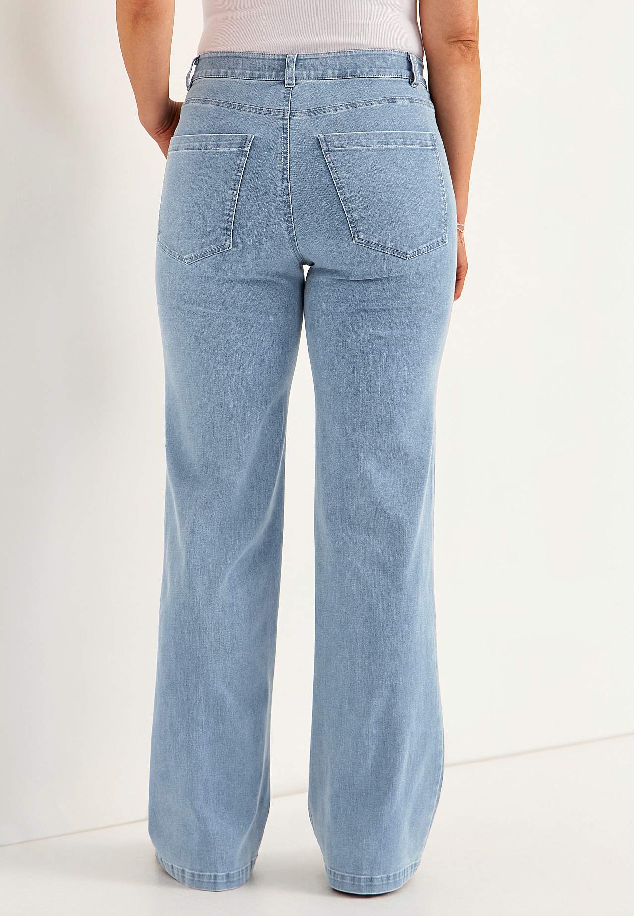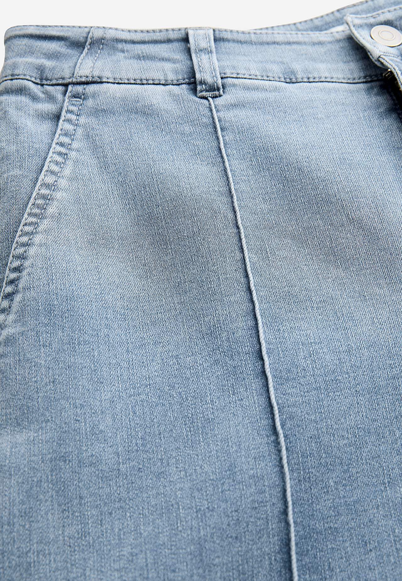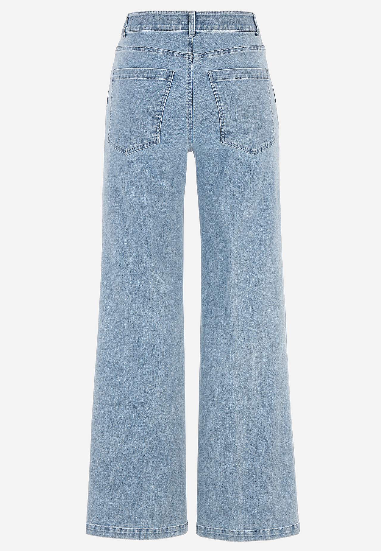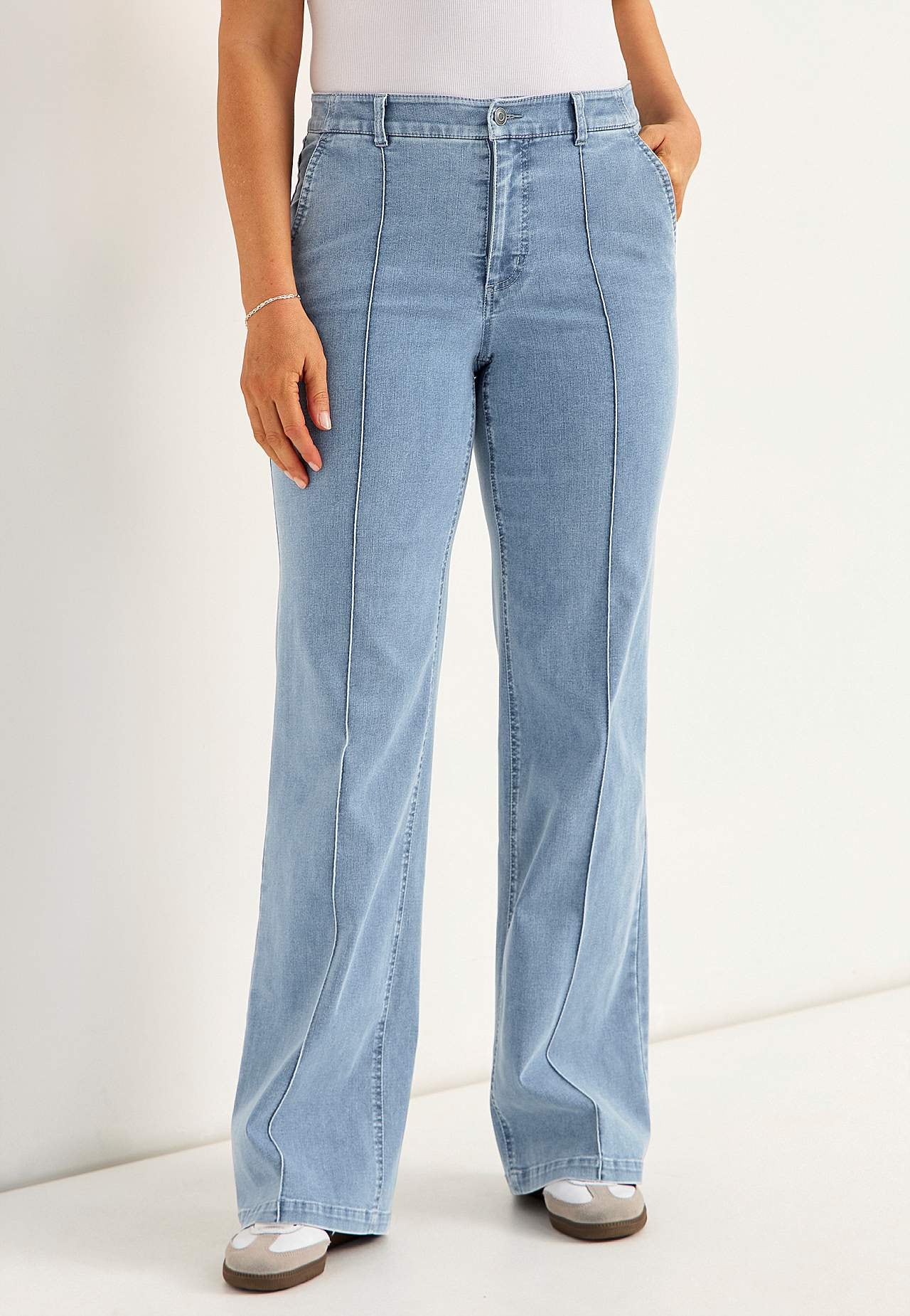 Spijkerbroek van elastische denim. Gestikte vouwen aan de voorkant. Normale taille. Recht ontwerp. Wijde benen. Ceintuur met riem lussen. Rits met knop. Scheve zijzakken aan de voorkant. Twee achterzakken. Verkrijgbaar in twee lengtes. Twee binnenbeenlengtes: Normaal ca. 80 cm. Lang ca. 85 cm. De voorkant varieert met de ma... Meer lezen