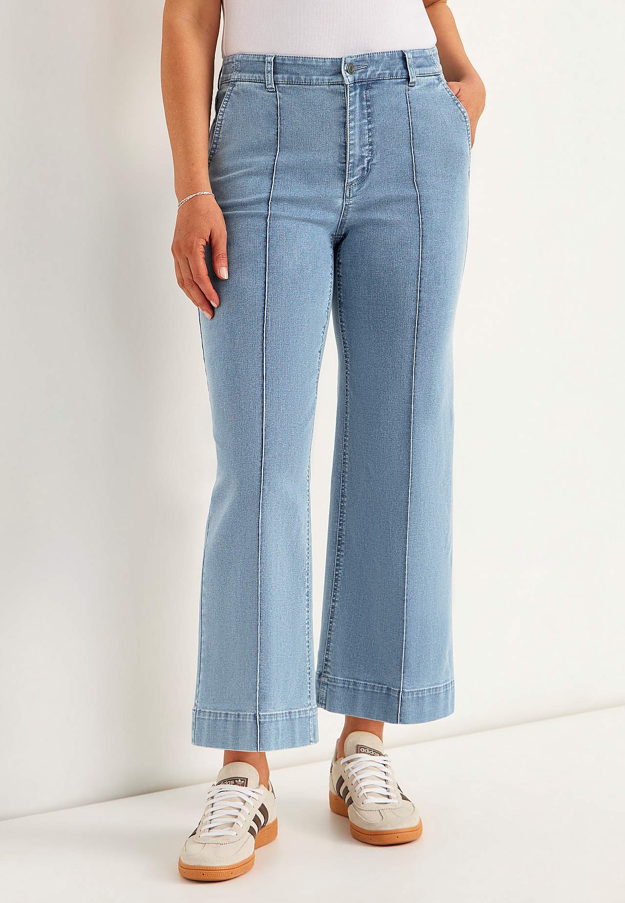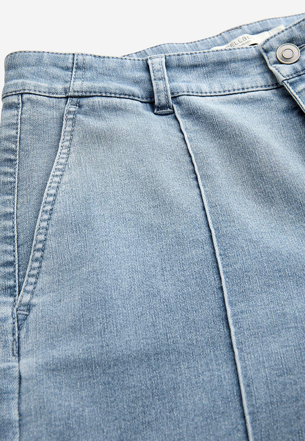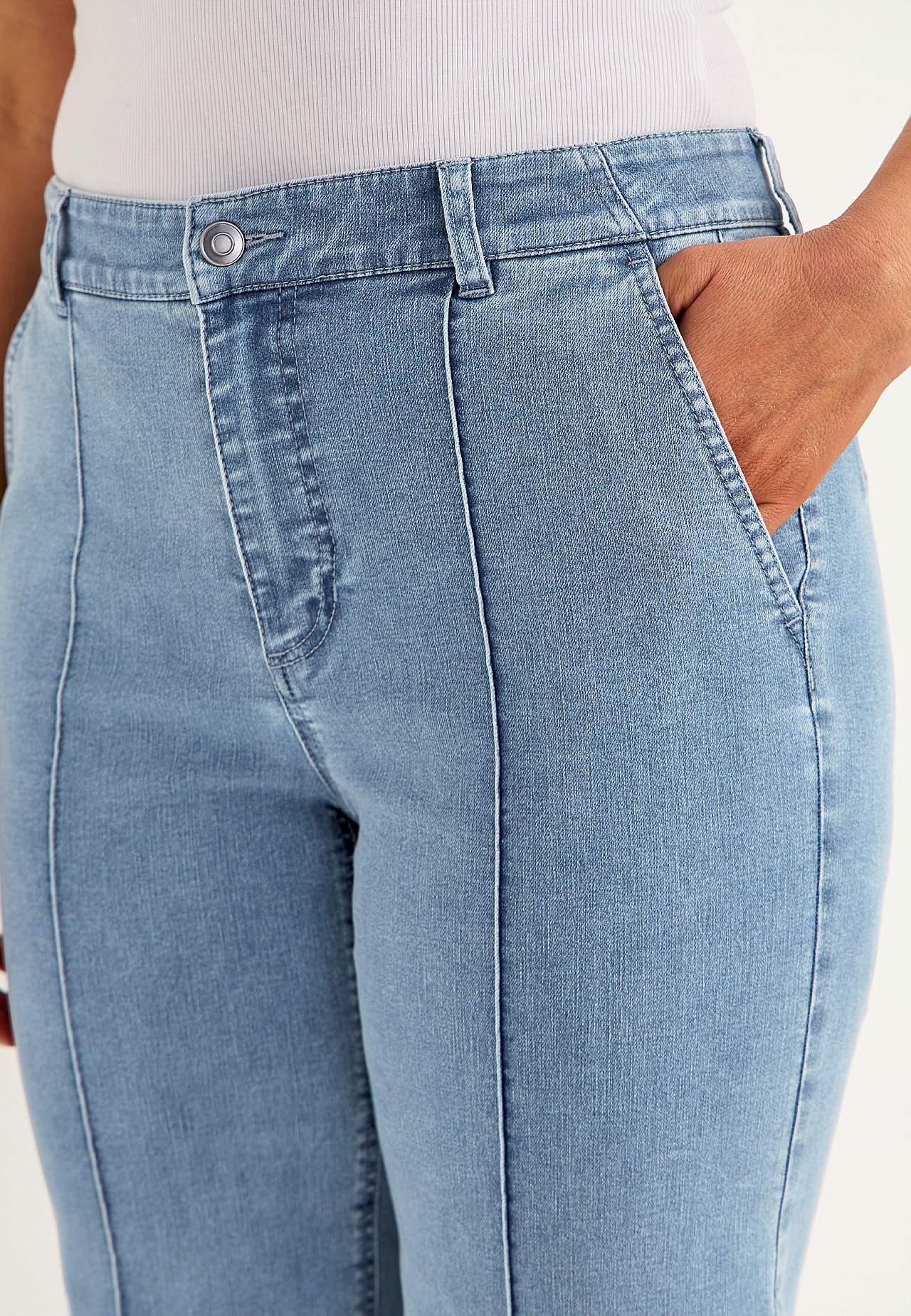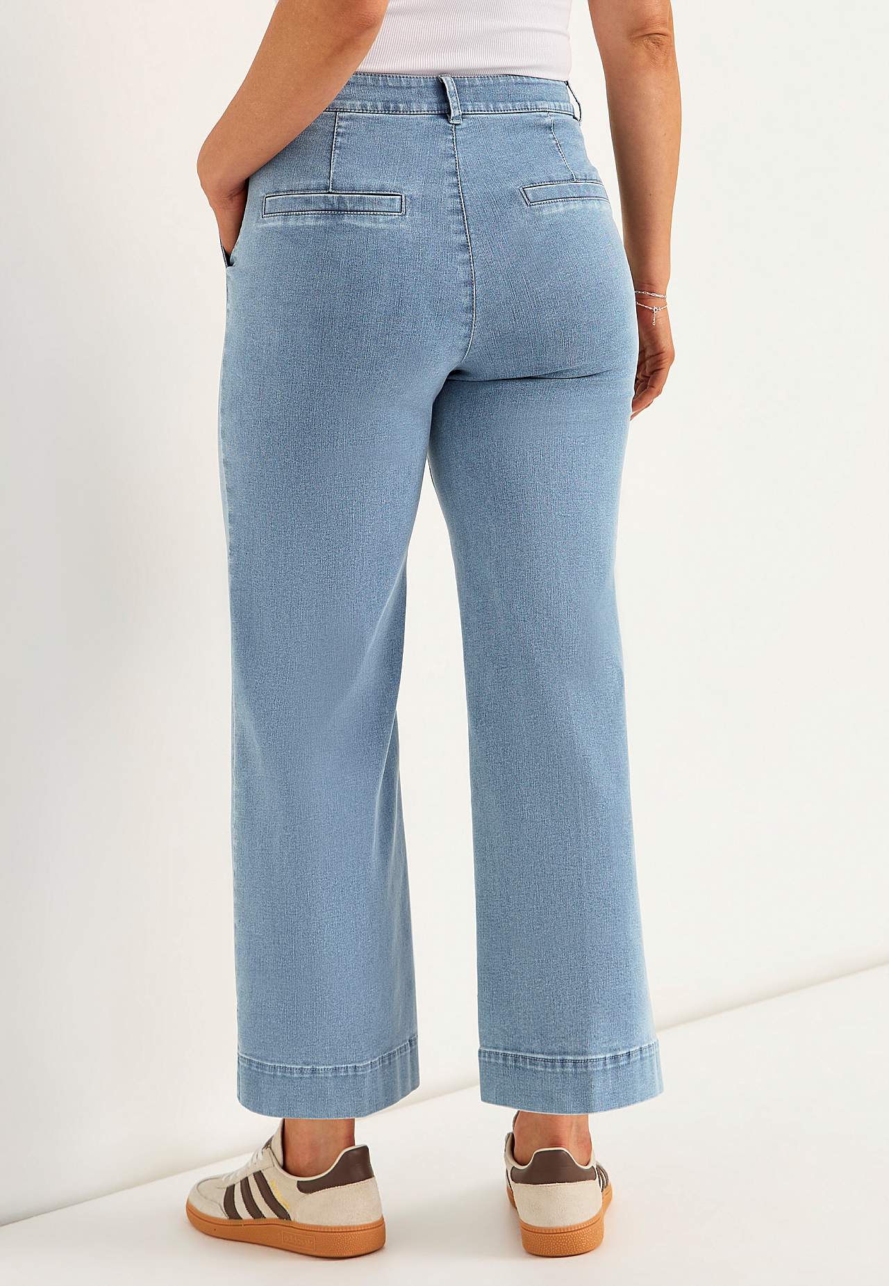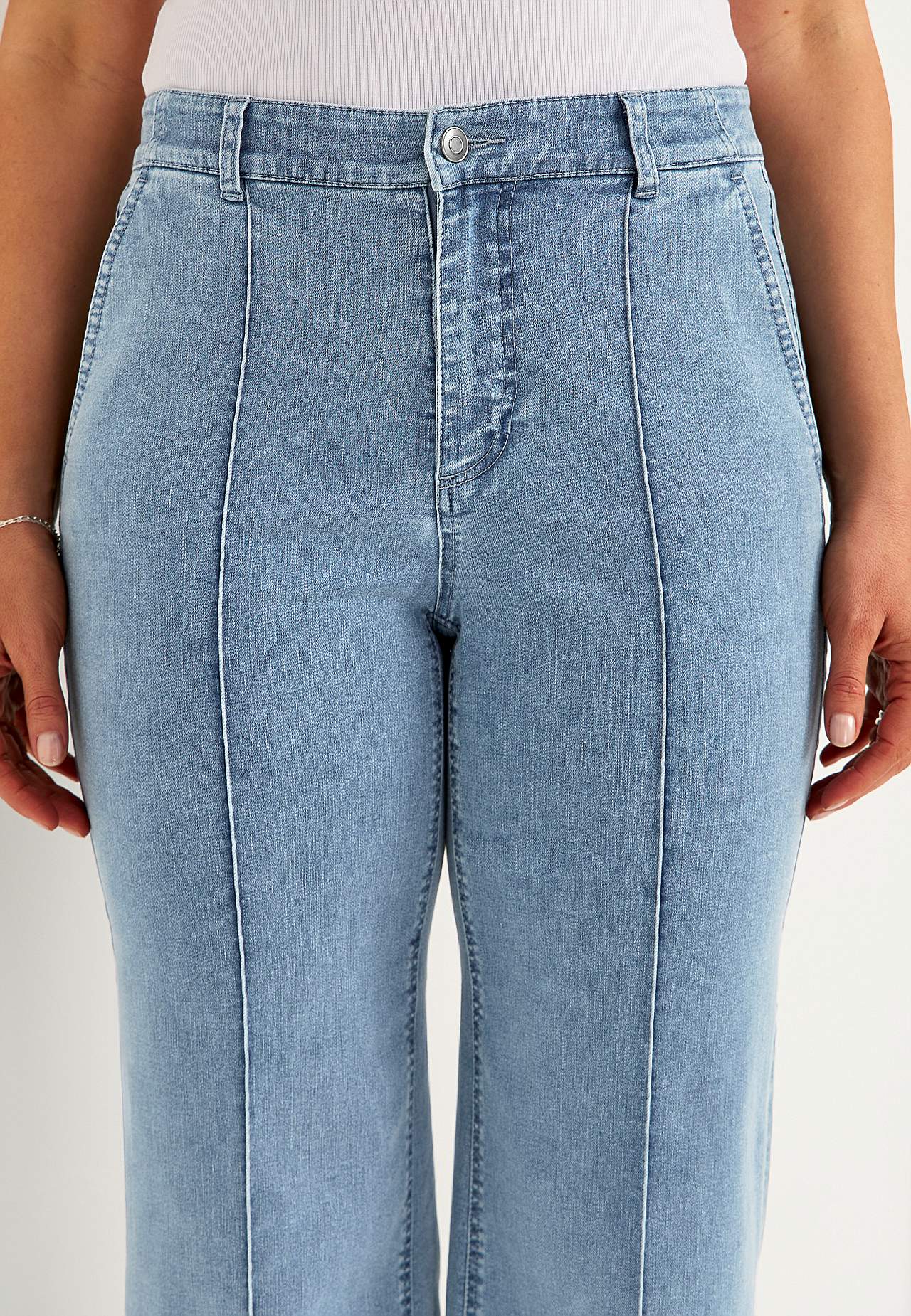 Enkeljeans van elastische en zachte denim. Recht ontwerp met wijde benen. Losse pasvorm. Iets meer getailleerd op het zitvlak. Normale taille. Ceintuur met riem lussen. Rits met knop. Scheve zijzakken aan de voorkant. Gestikte vouwen aan de voorkant. Valse paspelzakken achter. De binnenbeenlengte is ​​bij alle maten ca. 65 ... Meer lezen
