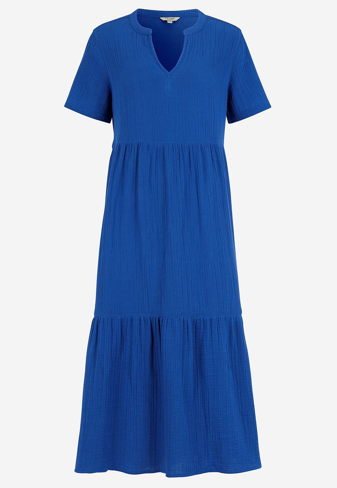 Jurk met ruches van mooi katoenen gaas met naturelle structuur. Gevlochten en zacht materiaal met luchtig en verkoelend gevoel. Ruime pasvorm met breedte aan de onderkant. Ronde nek met smalle v-necksnit. Korte mouwen. Naad aan de taille. Volant aan de onderkant. Rechte zoom. De ruglengte is ca. 125 cm in alle maten.