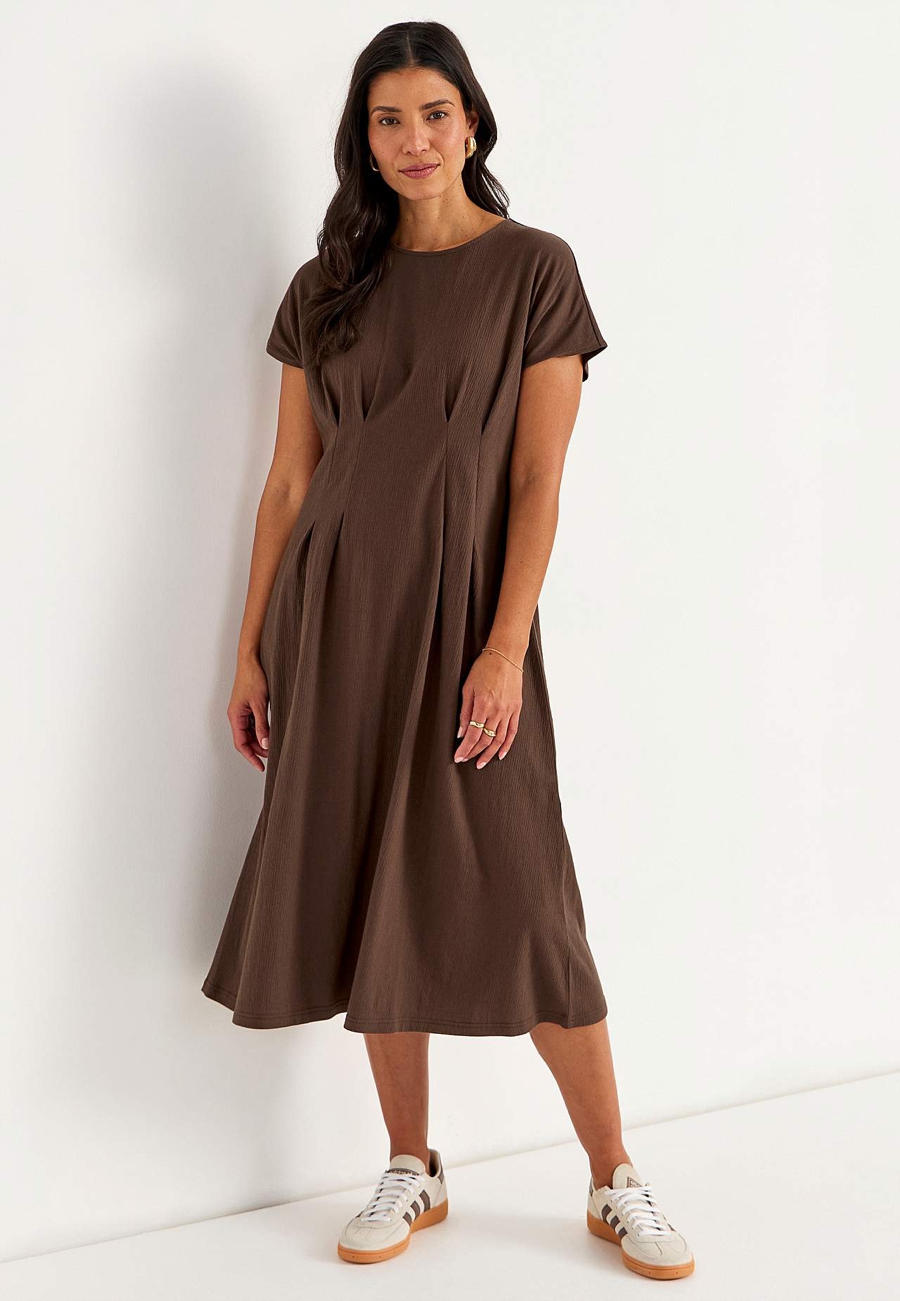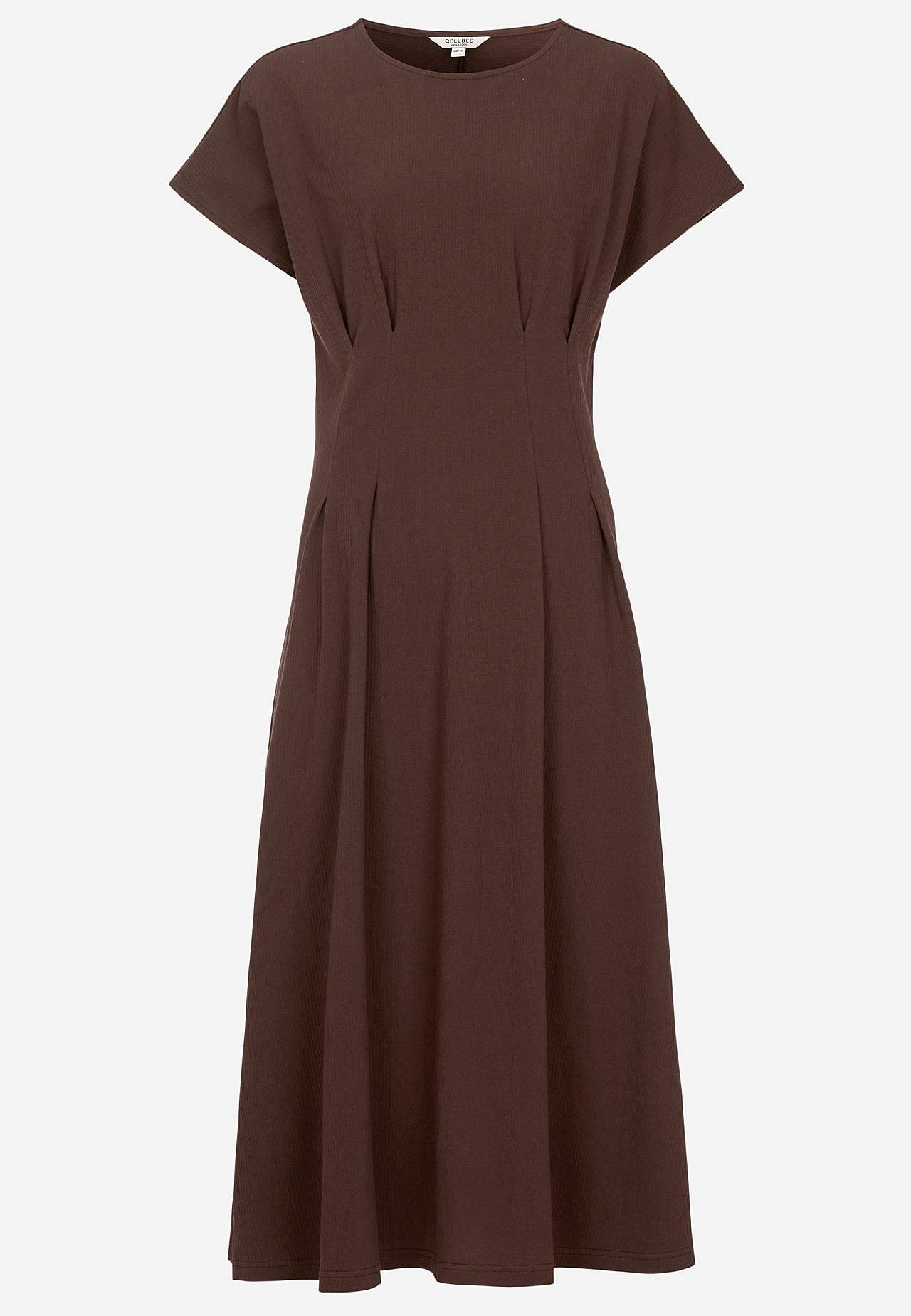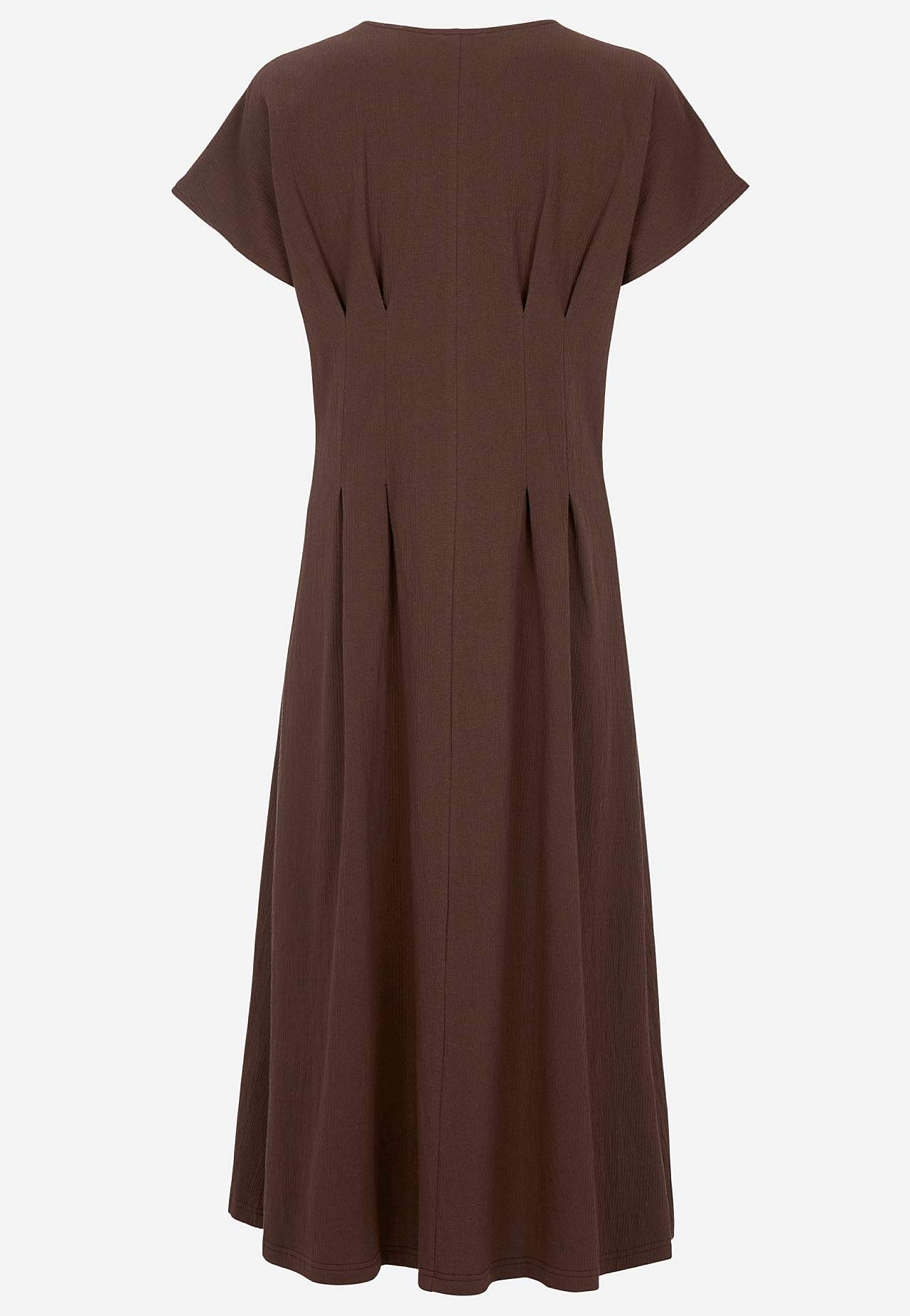 Vrouwelijke jerseyjurk met golvende structuur. Zacht en elastisch materiaal. Regular pasvorm met flared rokgedeelte. Bepaald taille met figuur flatterende coupenaad zowel aan de voor- als achterkant. Afgeronde nek. Korte kapmouwen. Lichtjes afgeronde zoom. De ruglengte is ca. 122 cm in alle maten.