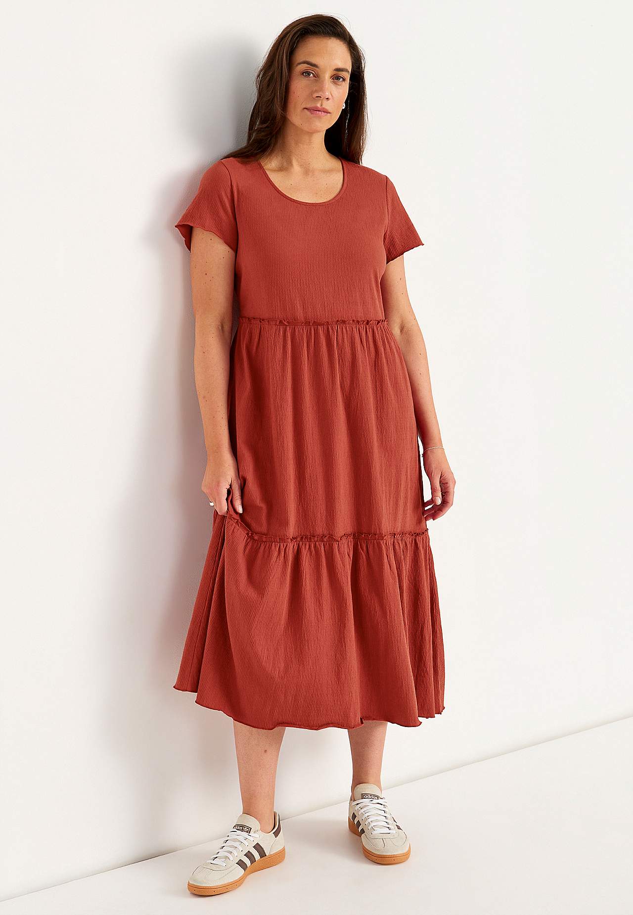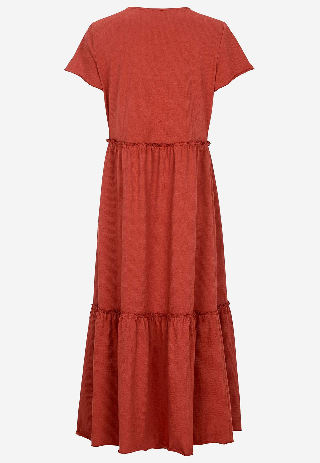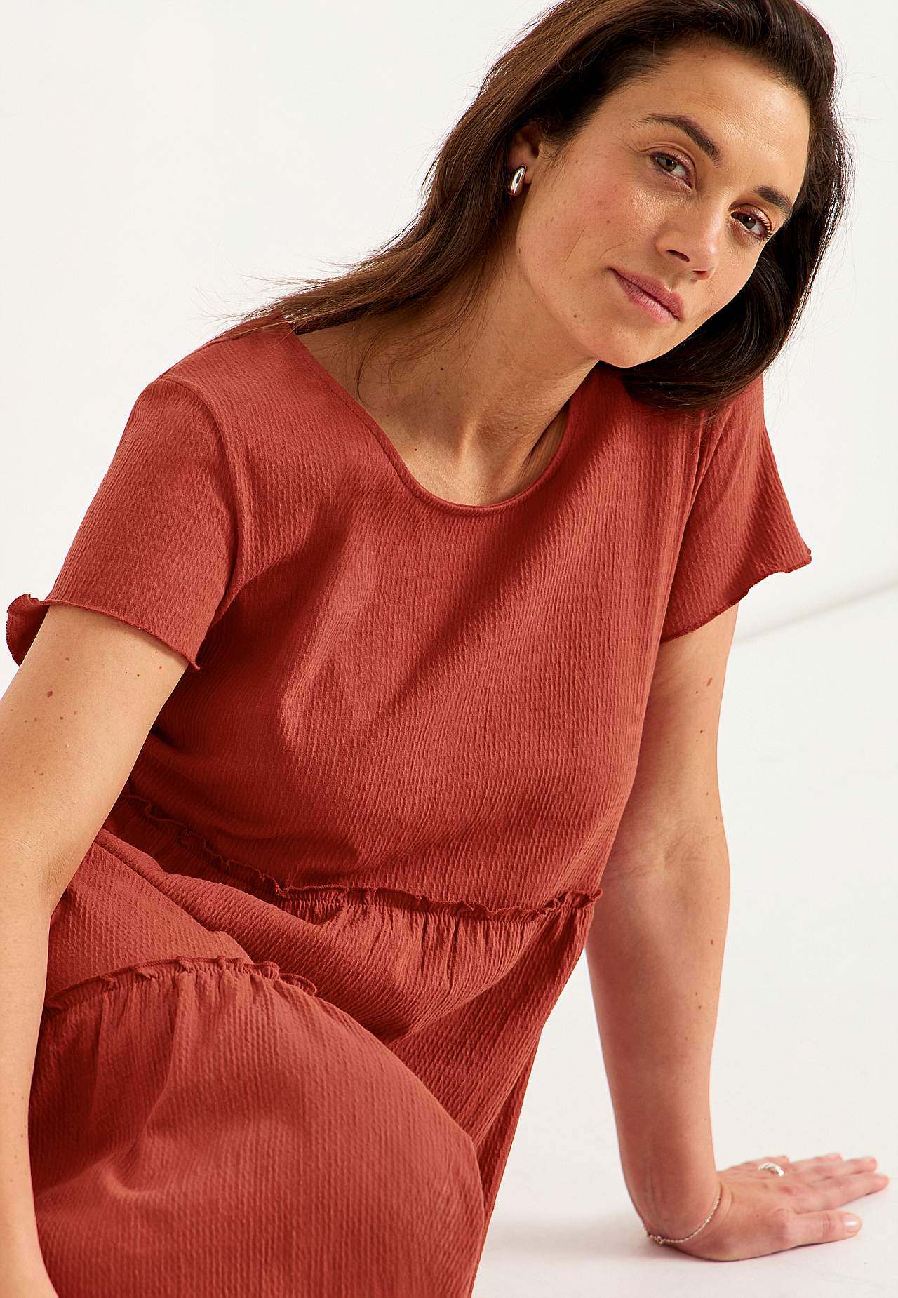 Elastische en zachte jurk met ruches met golvende structuur. Informele en A-gevormde pasvorm. Rokgedeelte met mooie breedte. Doorgestikte, golvende en dunne naad aan de onderkant, aan de rand van de ruche en bij de manchetten. Afgeronde nek. Korte kapmouwen. Lichtjes afgeronde zoom. De ruglengte is ca. 128 cm in alle maten.