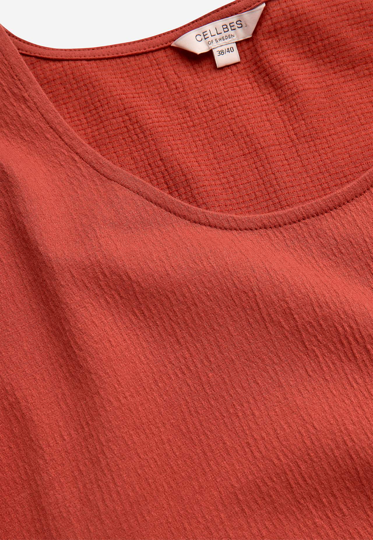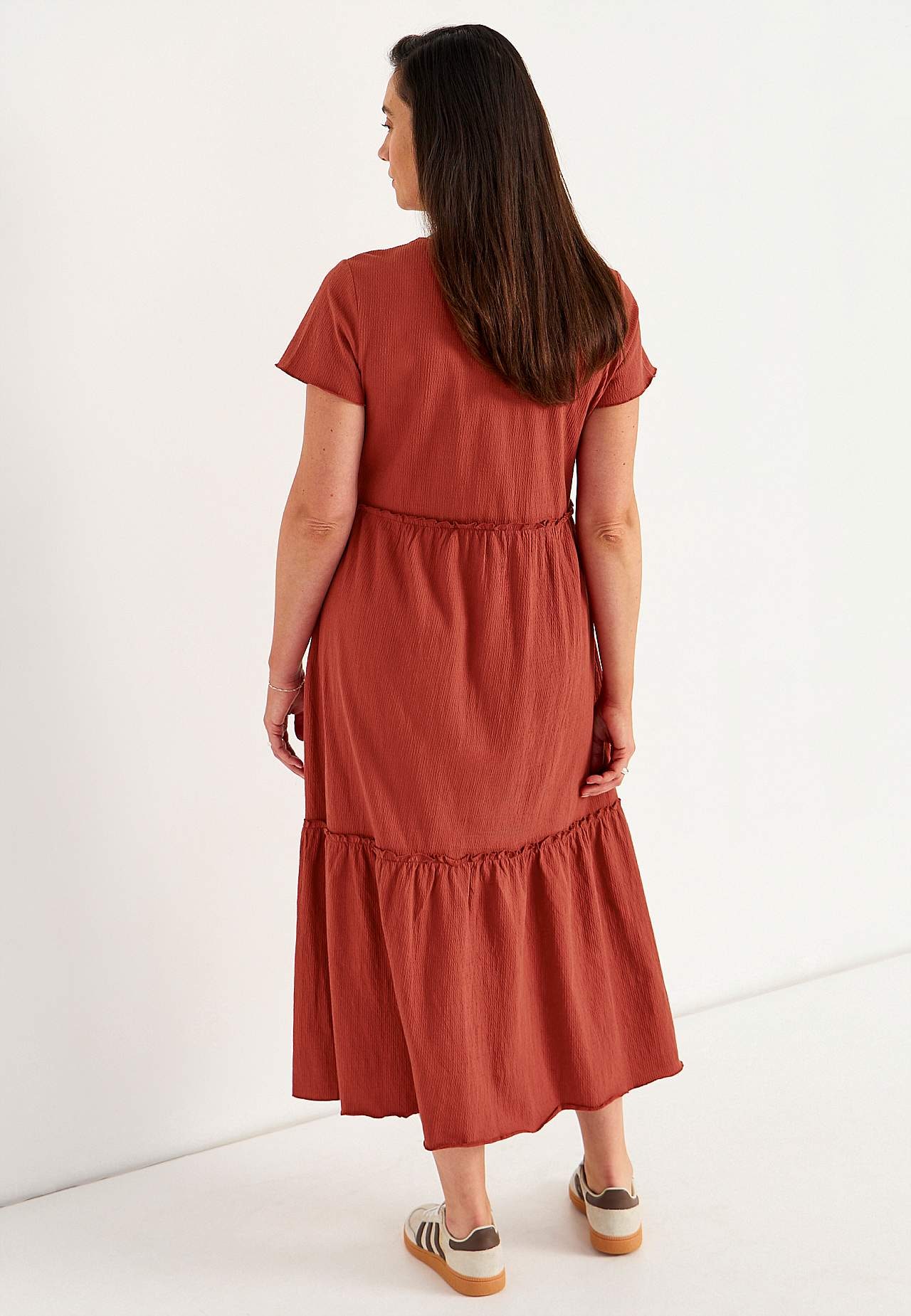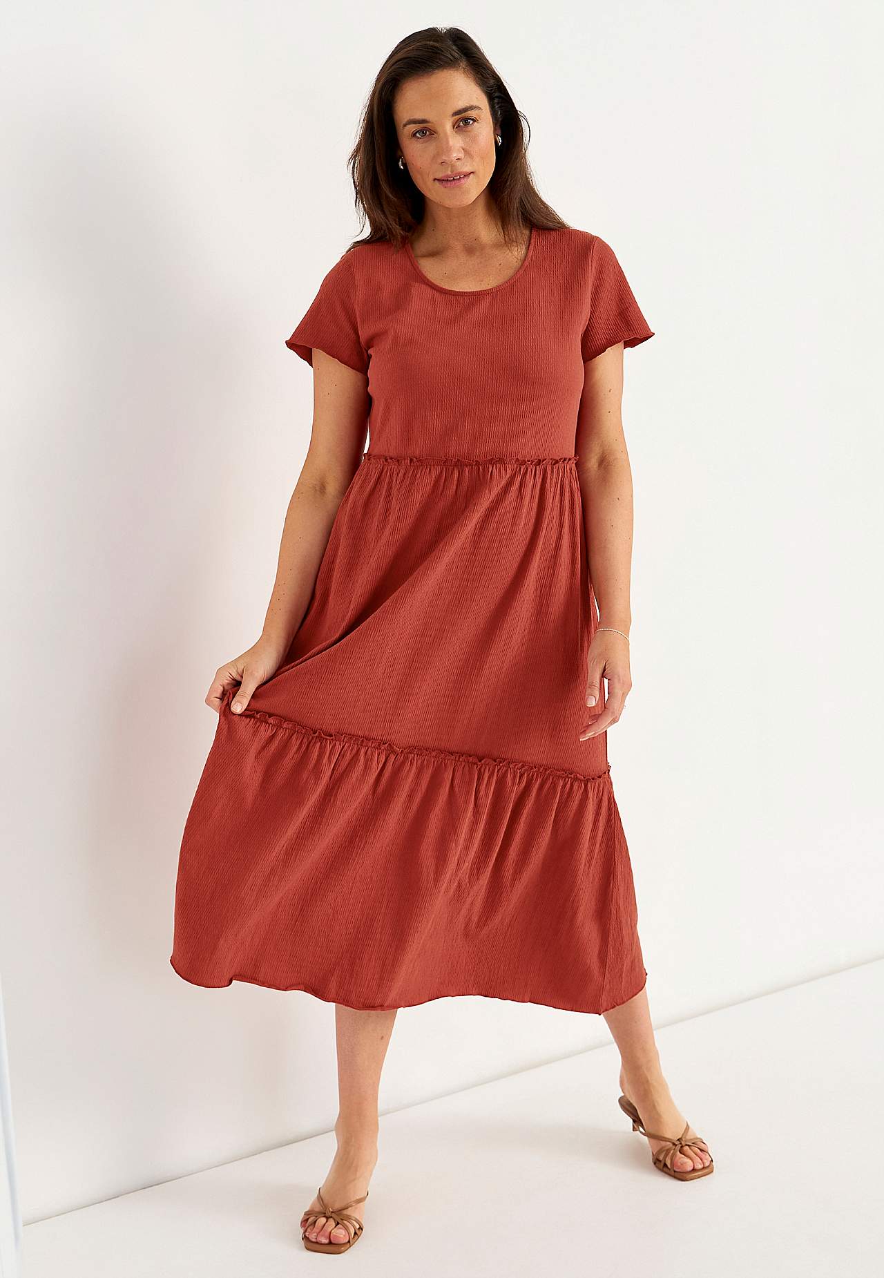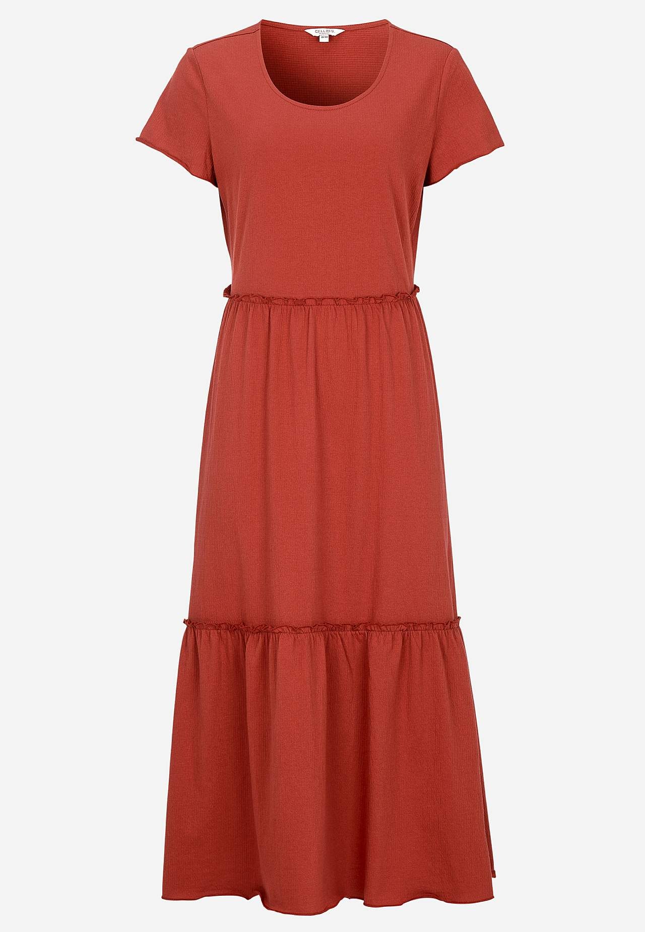 Elastische en zachte jurk met ruches met golvende structuur. Informele en A-gevormde pasvorm. Rokgedeelte met mooie breedte. Doorgestikte, golvende en dunne naad aan de onderkant, aan de rand van de ruche en bij de manchetten. Afgeronde nek. Korte kapmouwen. Lichtjes afgeronde zoom. De ruglengte is ca. 128 cm in alle maten.