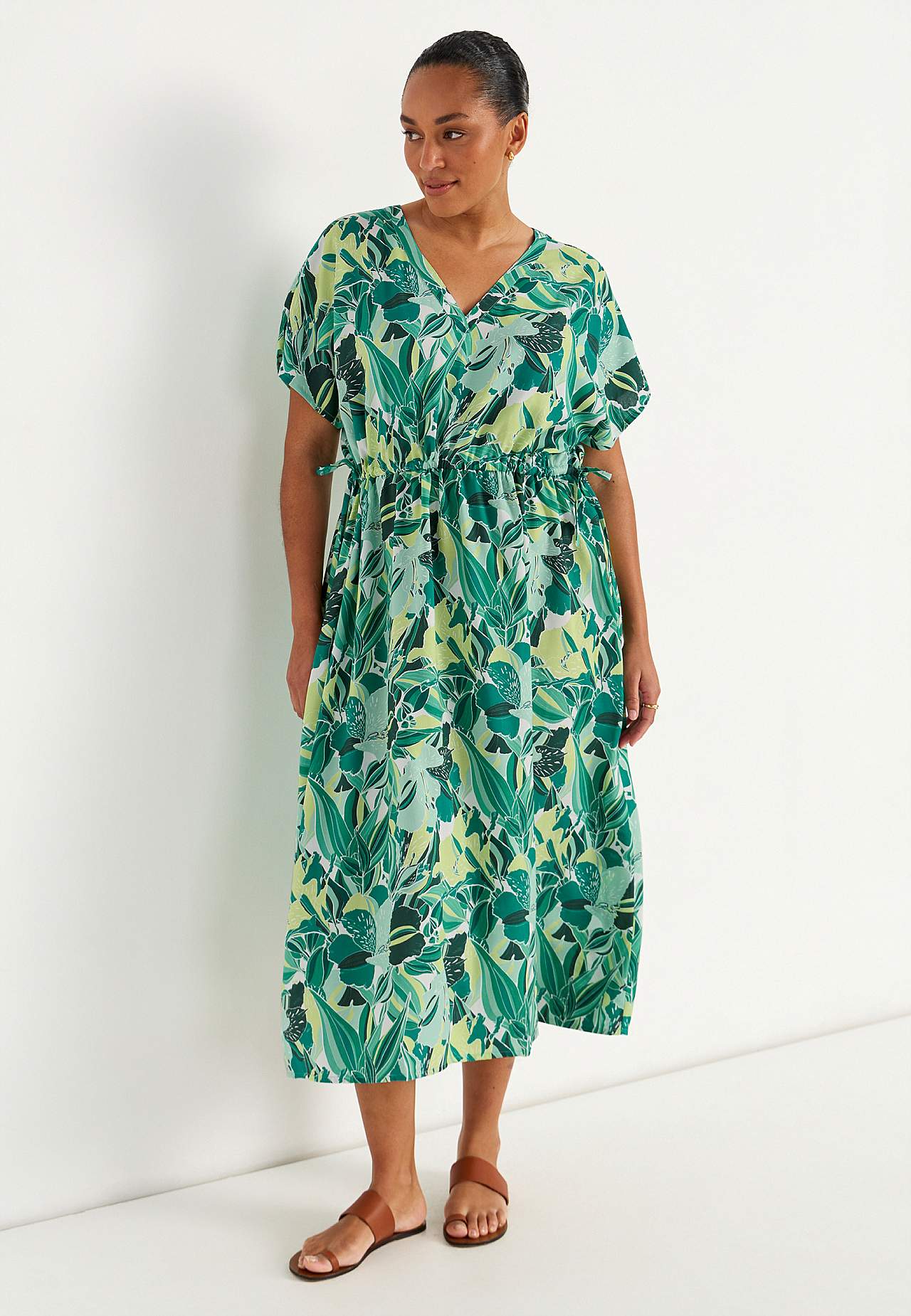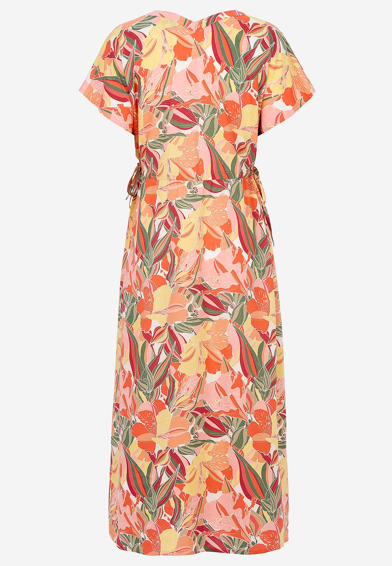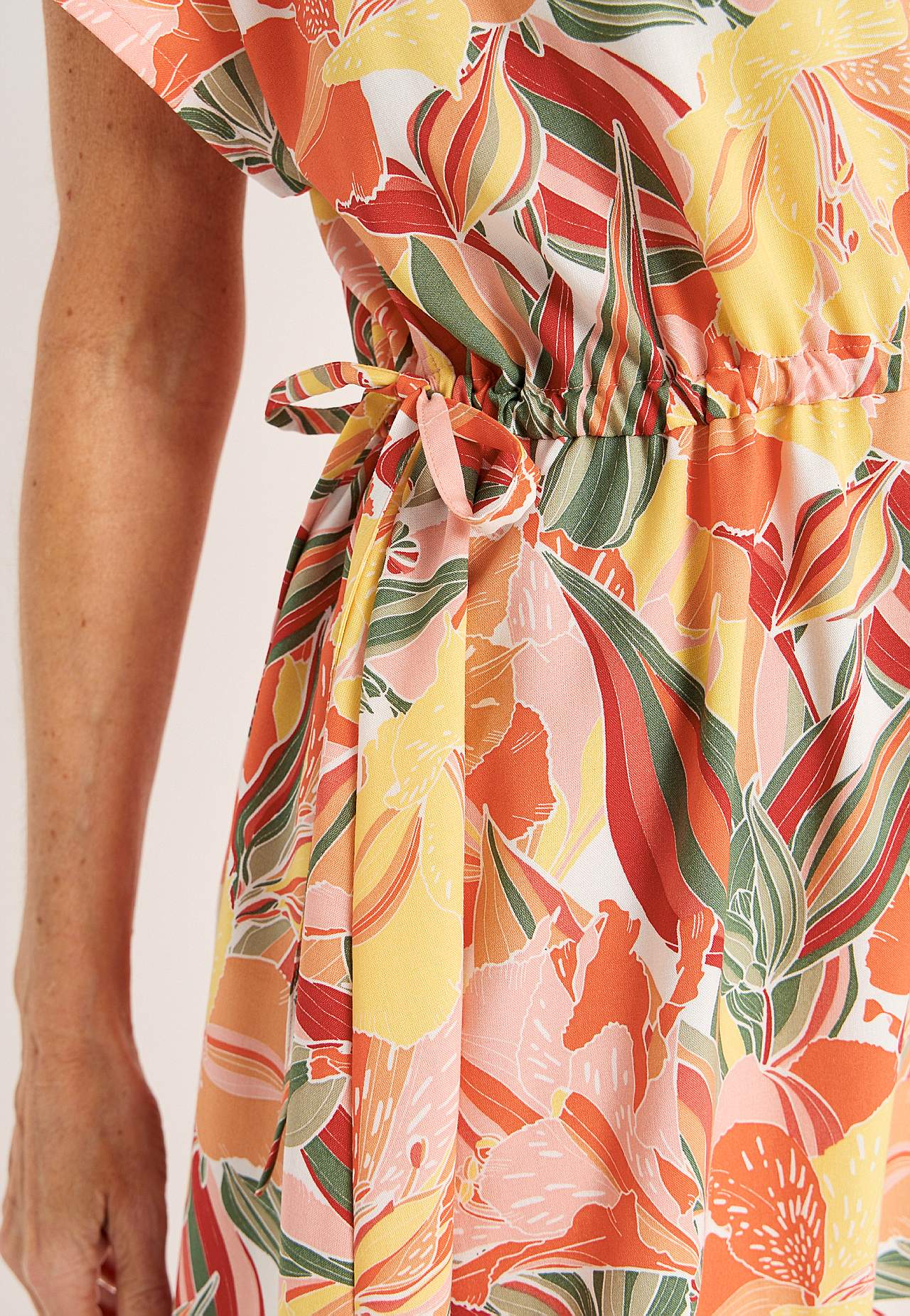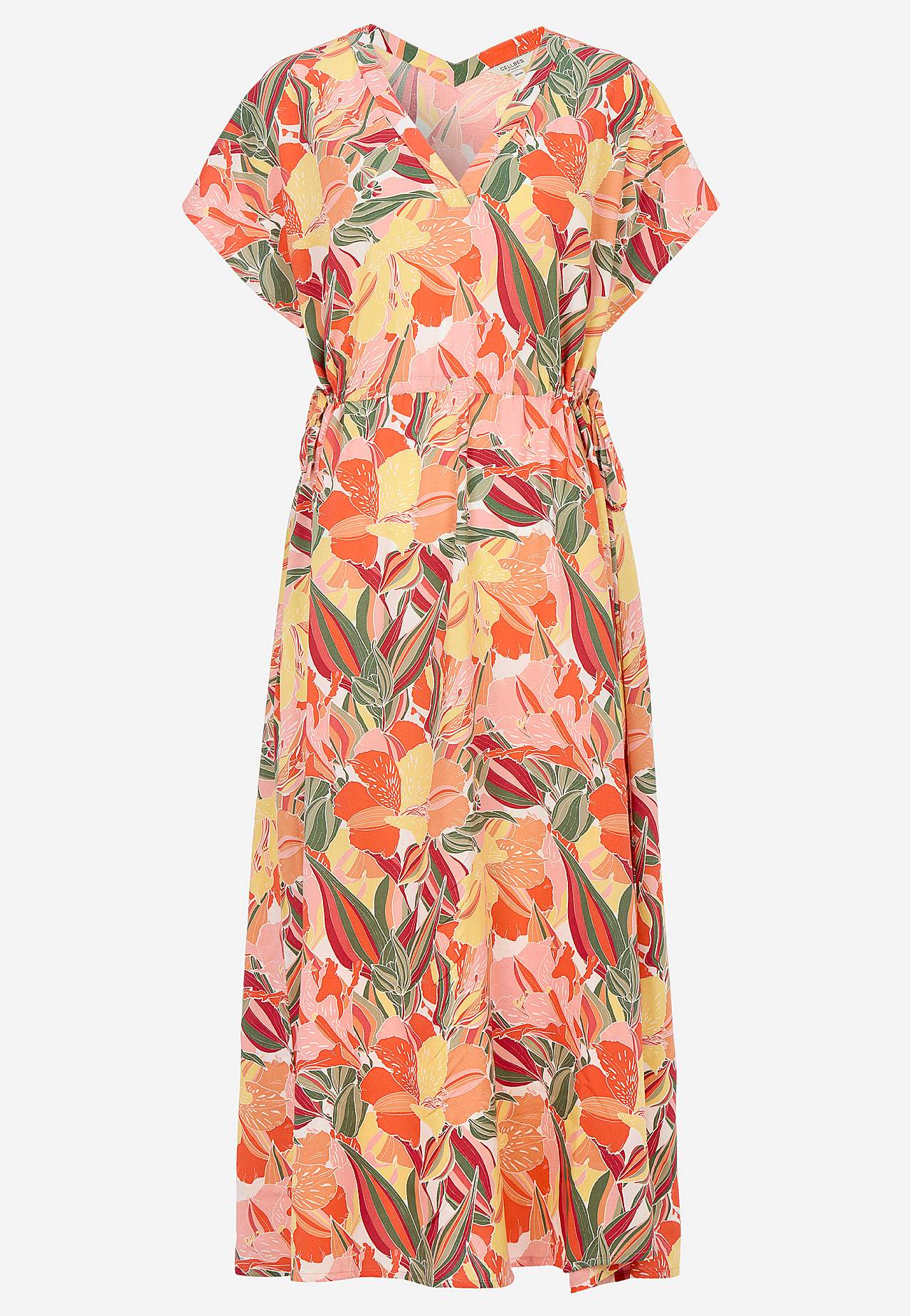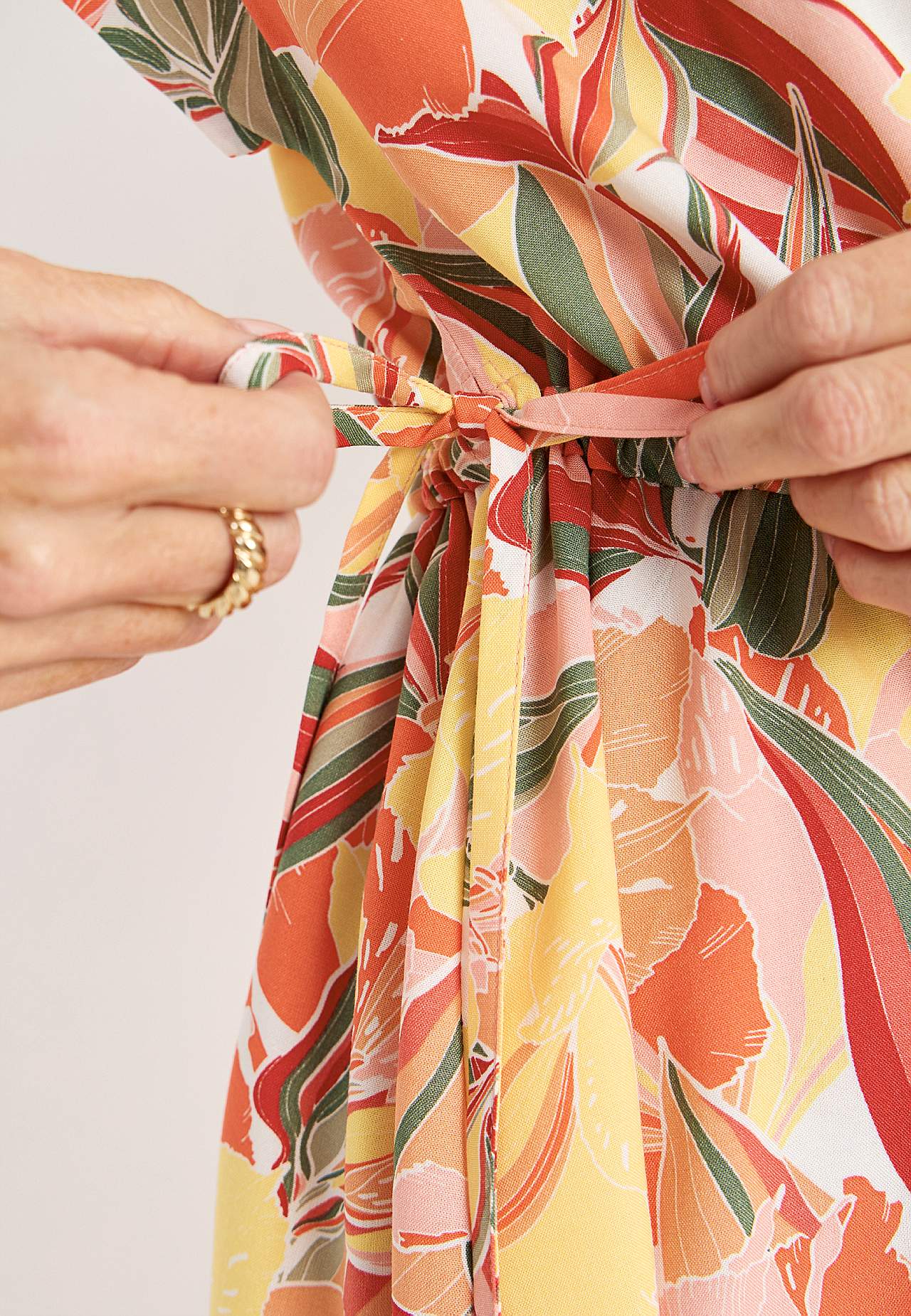 Luchtig en verkoelend materiaal met matte oppervlakte. Informele en losse pasvorm. Wijde kapmouwen. Verborgen strikkoorden in de taille. Gemakkelijk aan te passen en aan beide kanten vast te knopen. Kies zelf, losse of strakkere pasvorm. Lichtjes afgeronde zoom. De ruglengte is ca. 128 cm in alle maten.