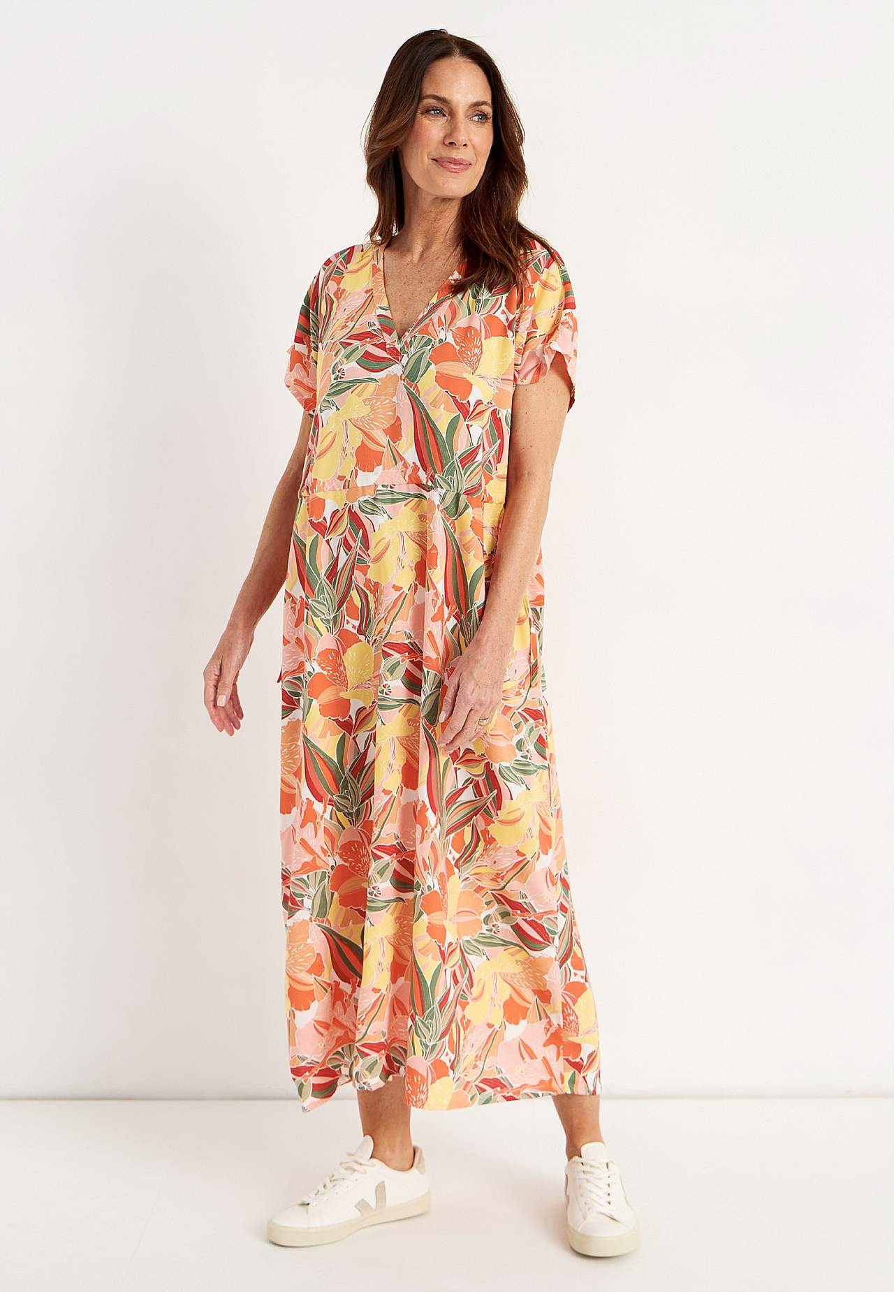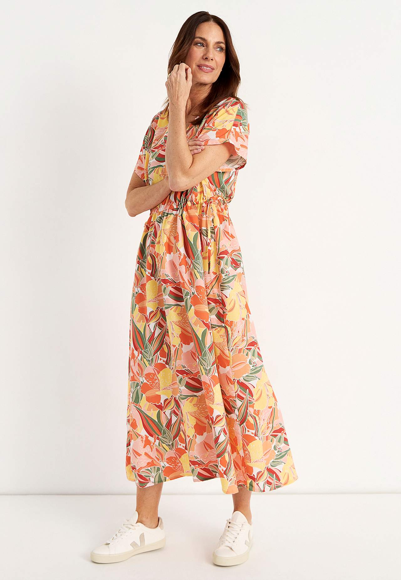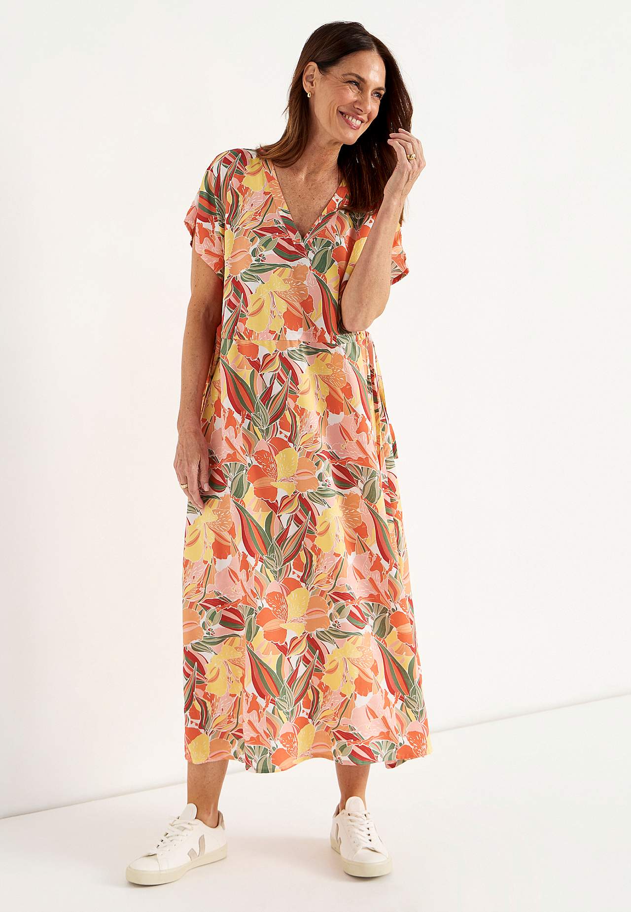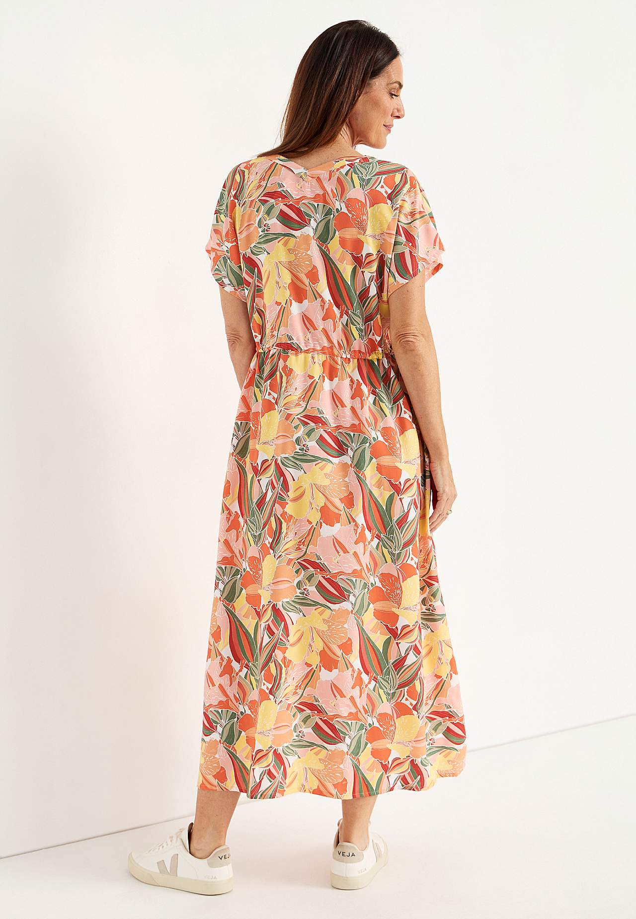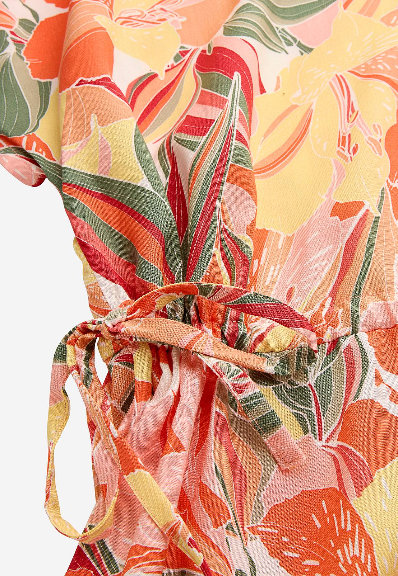Luchtig en verkoelend materiaal met matte oppervlakte. Informele en losse pasvorm. Wijde kapmouwen. Verborgen strikkoorden in de taille. Gemakkelijk aan te passen en aan beide kanten vast te knopen. Kies zelf, losse of strakkere pasvorm. Lichtjes afgeronde zoom. De ruglengte is ca. 128 cm in alle maten.