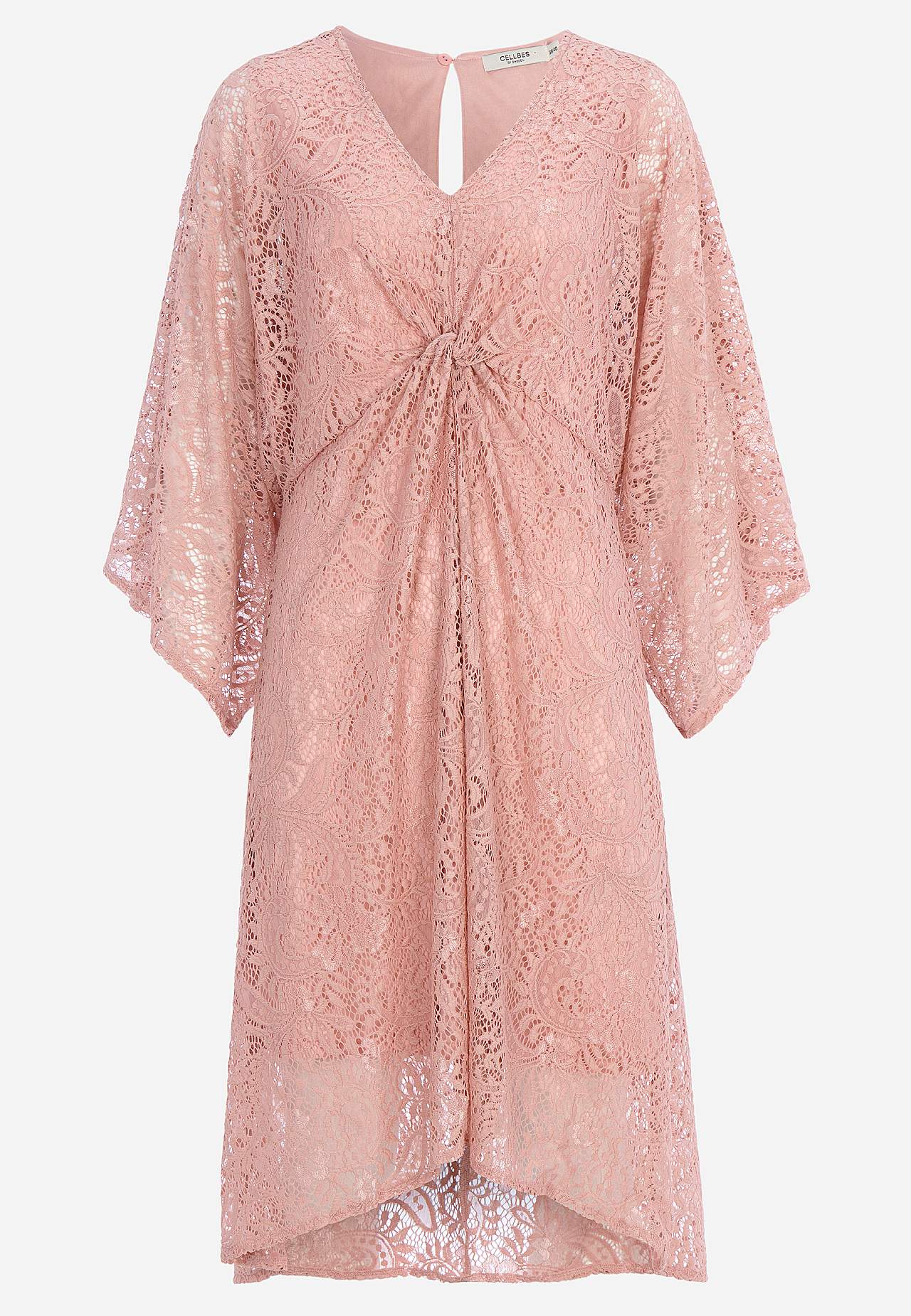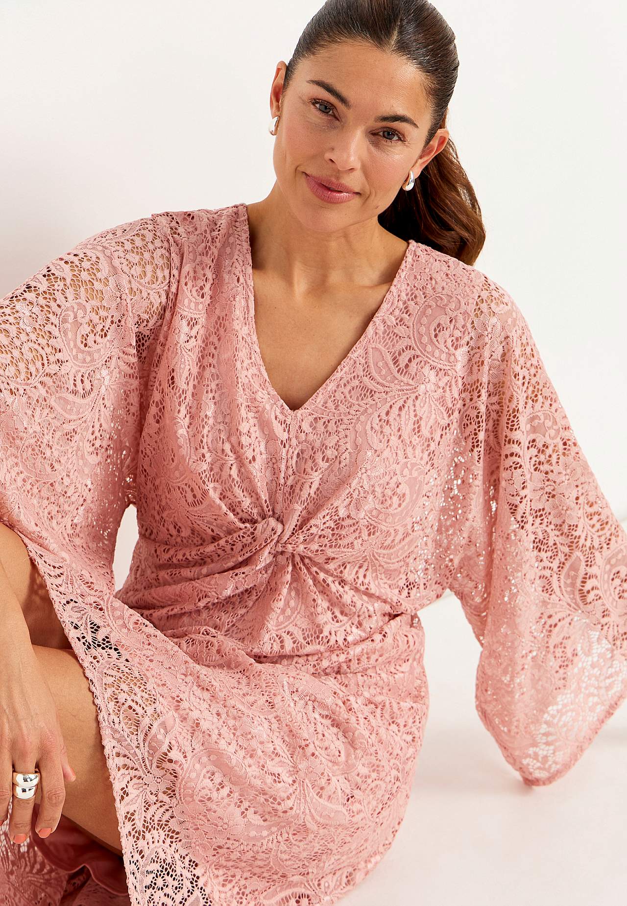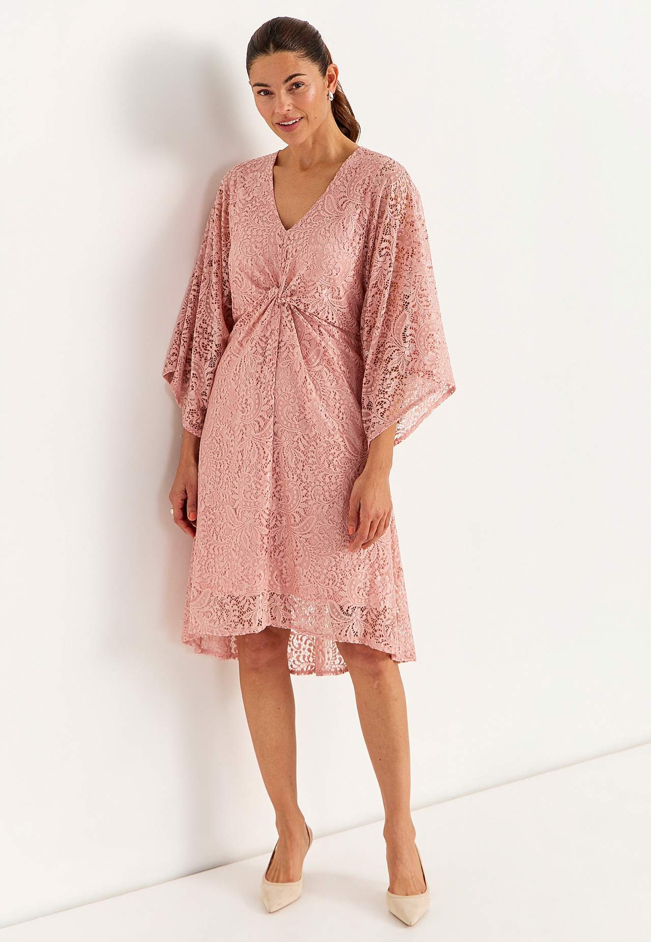 Comfortabele jurk met zachte elastische jersey kant en flexibele voering. Regular pasvorm. Bepaald taille met zachte kreuk details. Uitlopende rok met mooie drapering. Zachte en elastische tricotvoering. Diepe v-halslijn met gedraaid en flaterend detail aan de voorkant. Spleet in de nek met bedekte knop. Wijde en ongevoerde... Meer lezen