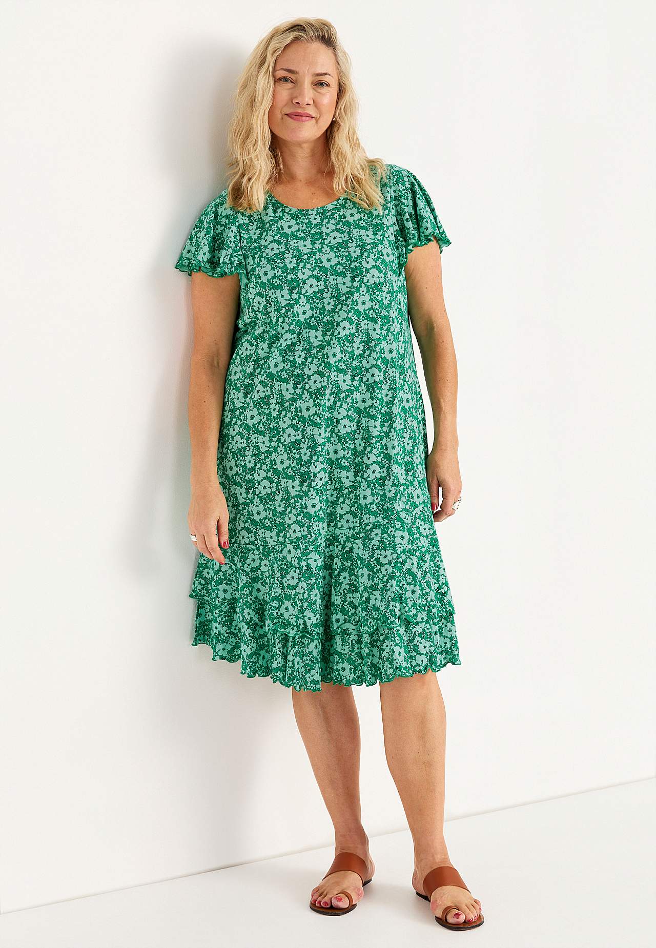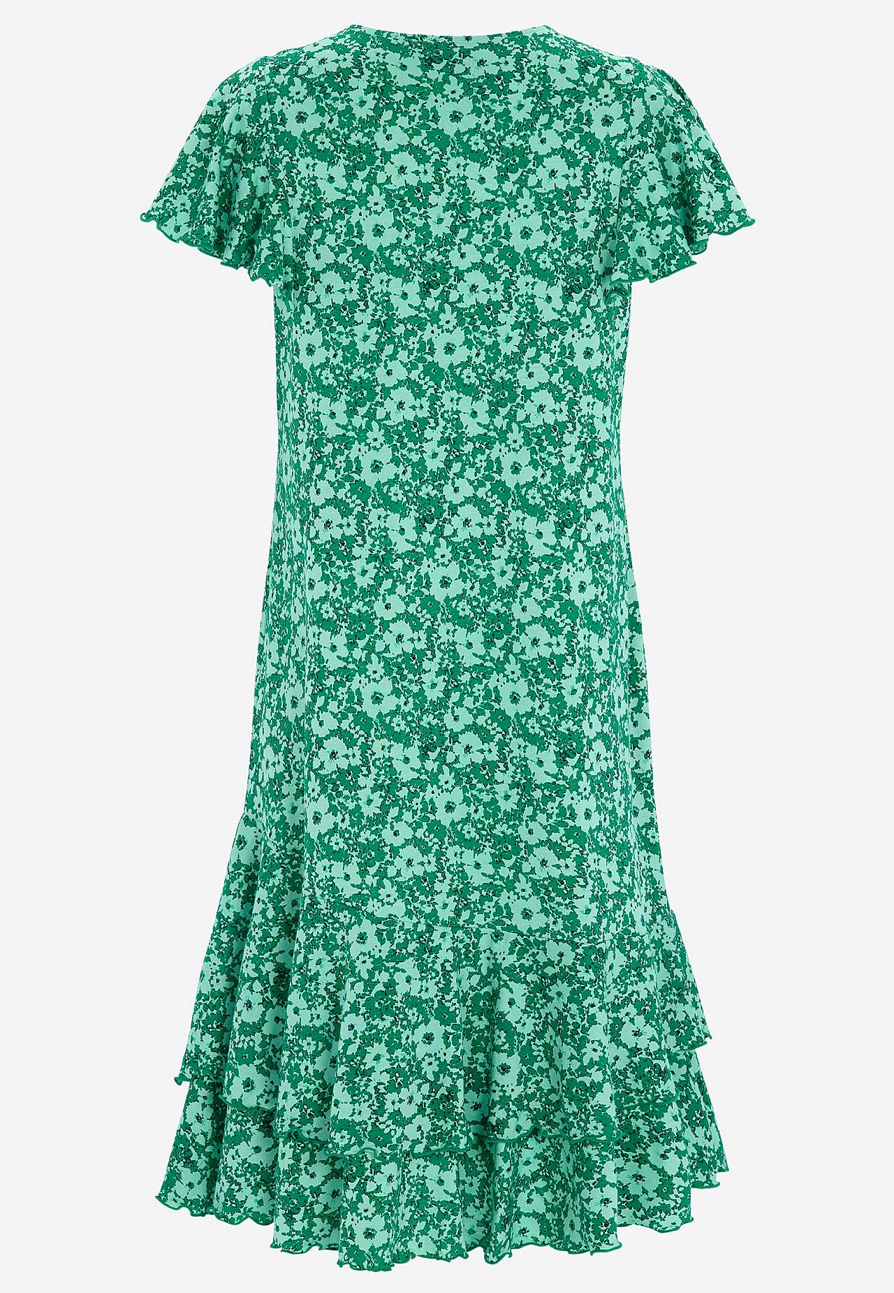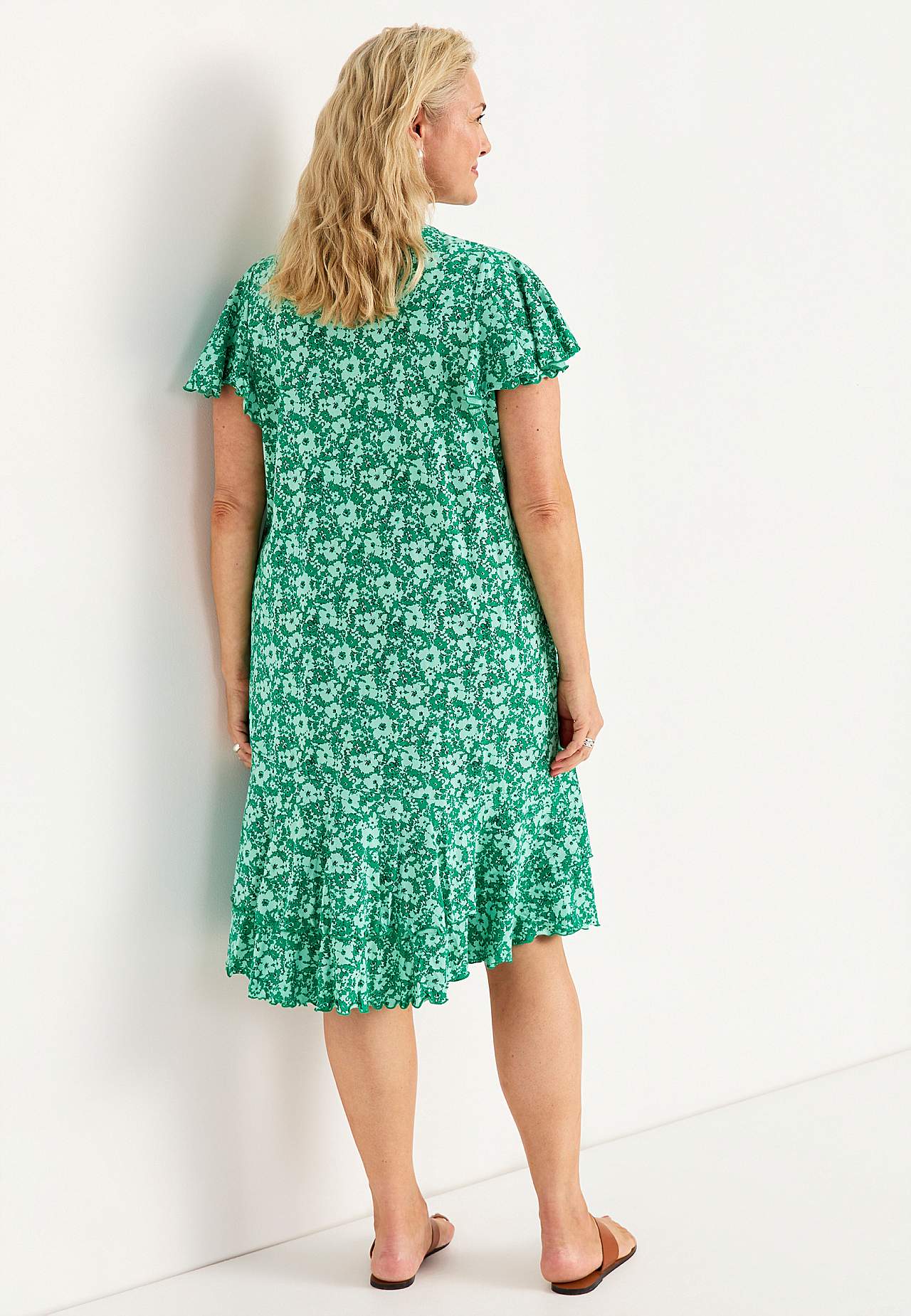 Jurk met asymmetrische naad en dubbele ruches aan de onderkant. Zachte jersey van katoen-viscose mix. Nauwsluitende pasvorm met breder rokgedeelte. Ronde neklijn. Korte vlinder mouwen met doorgestikte, decoratieve en golvende rand. Buste-figuurnaad. Ruches aan de onderkant met doorgestikte en golvende rand. De ruglengte var... Meer lezen