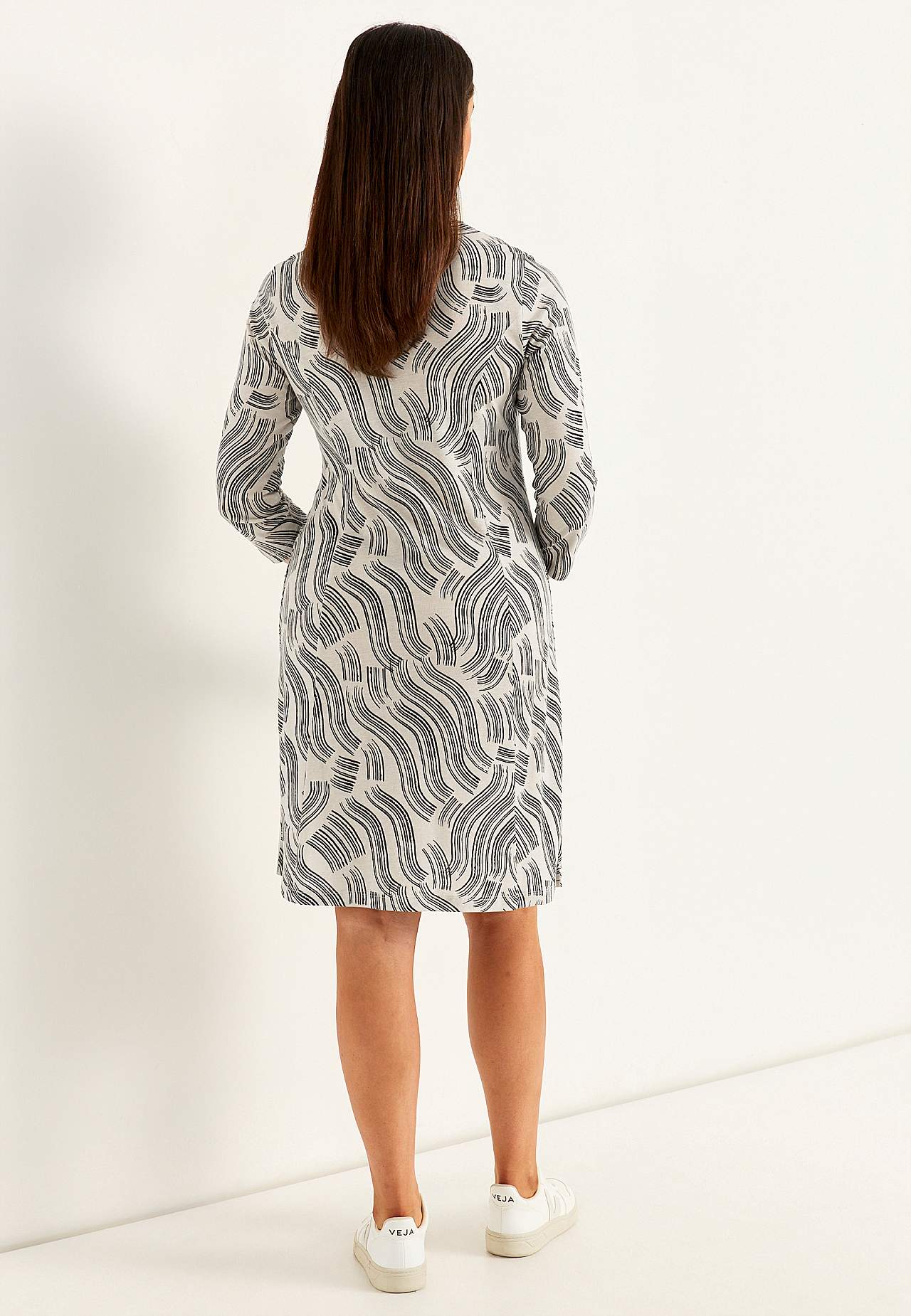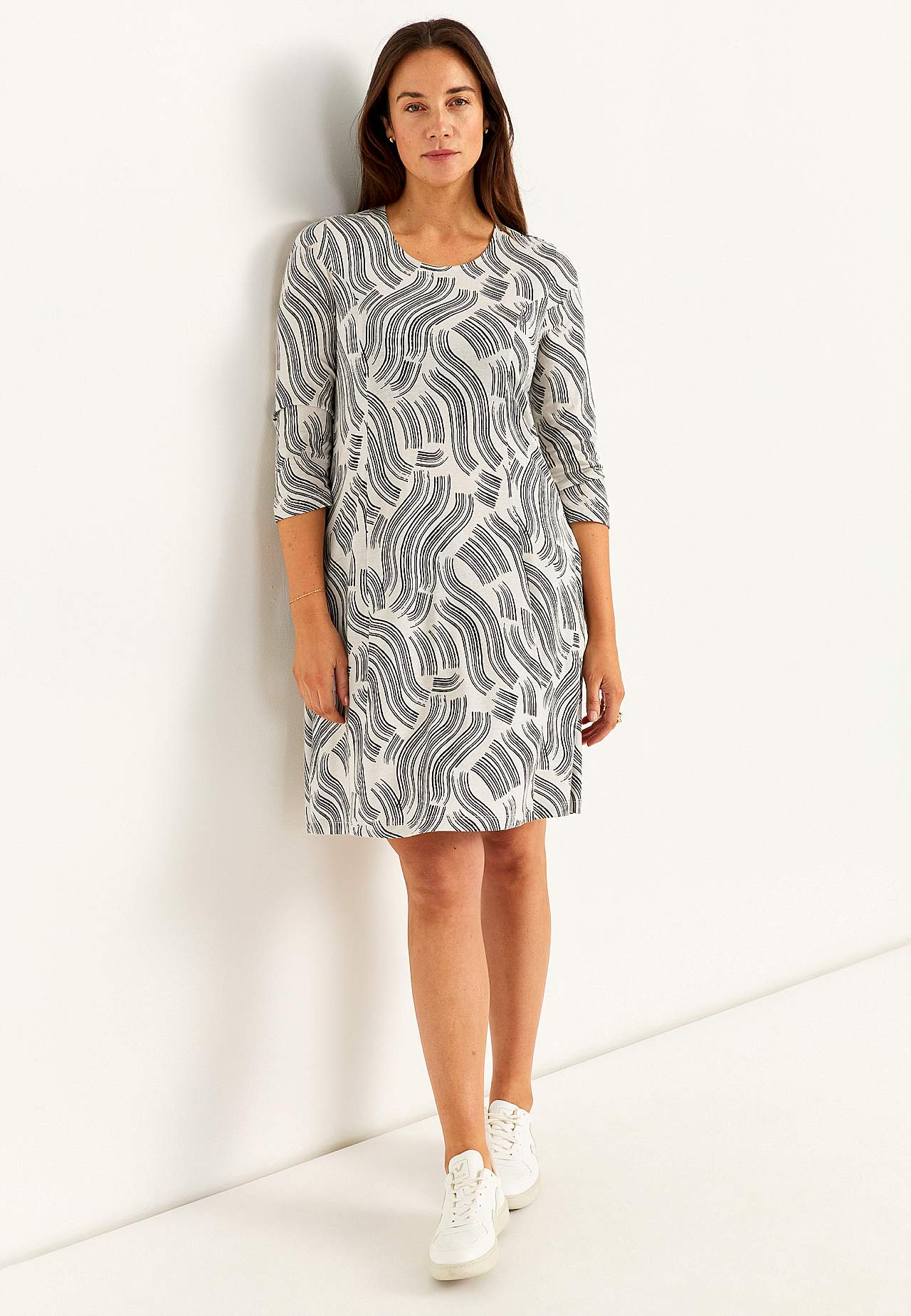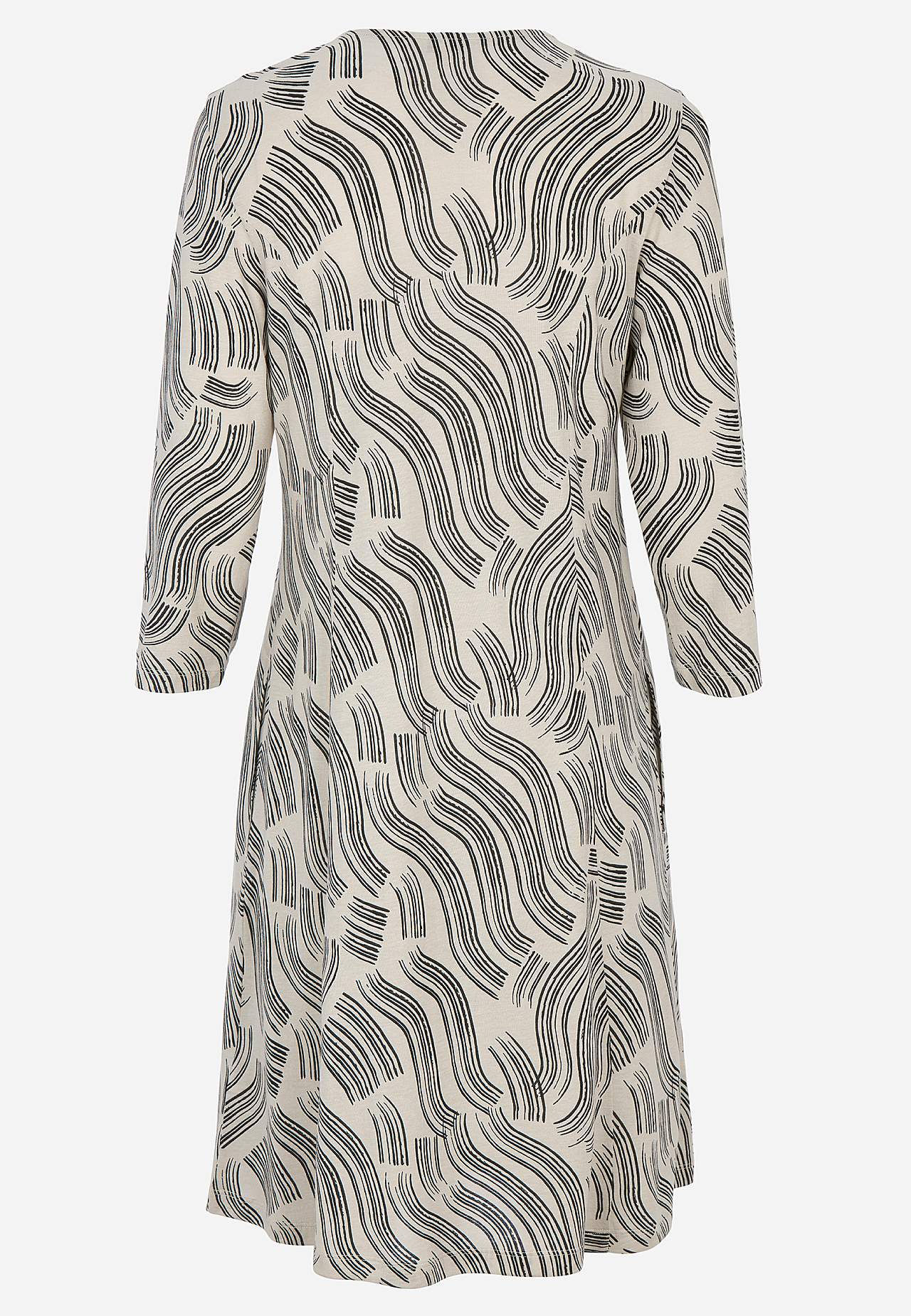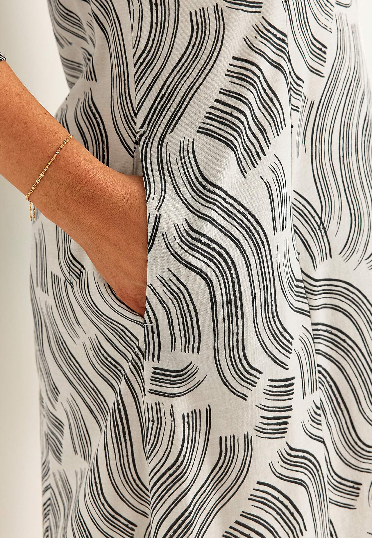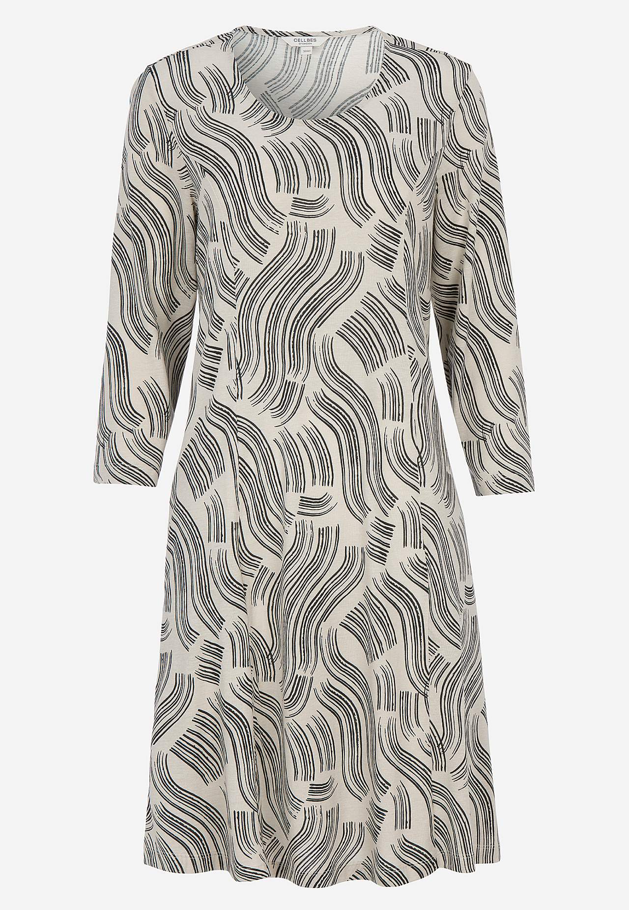 Zachte en comfortabele jurk van katoen-viscose mix. Nauwe pasvorm over de buste. Flared model met paneelnaden zowel aan de voor- als achterkant. Afgeronde neklijn. Comfortabele zijzakken. 3/4 lengte en rechte mouwen. De lengte varieert afhankelijk van de maat: ongeveer 96-108 cm vanaf de schouder.
