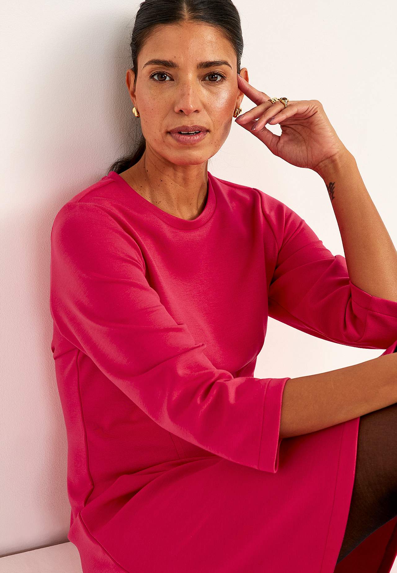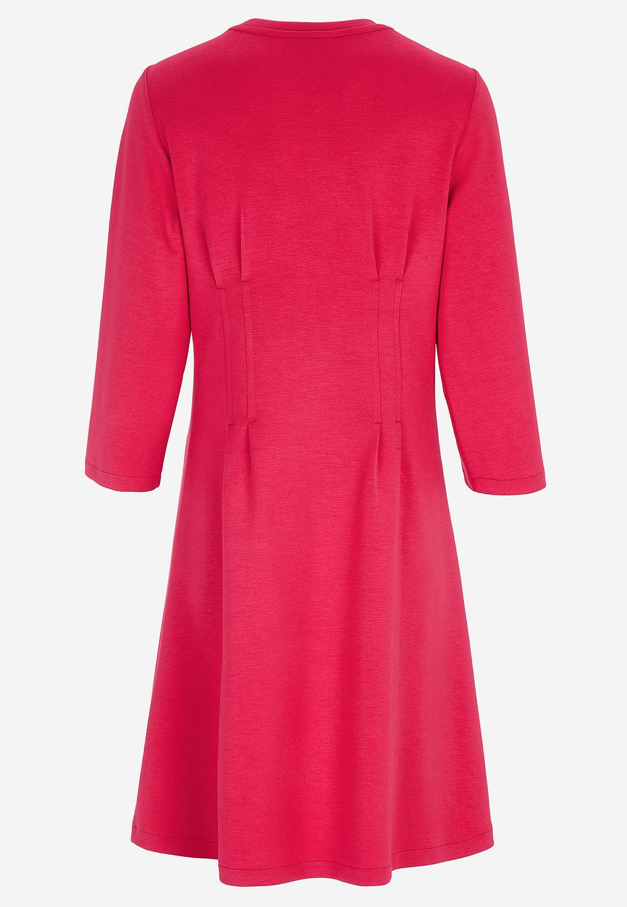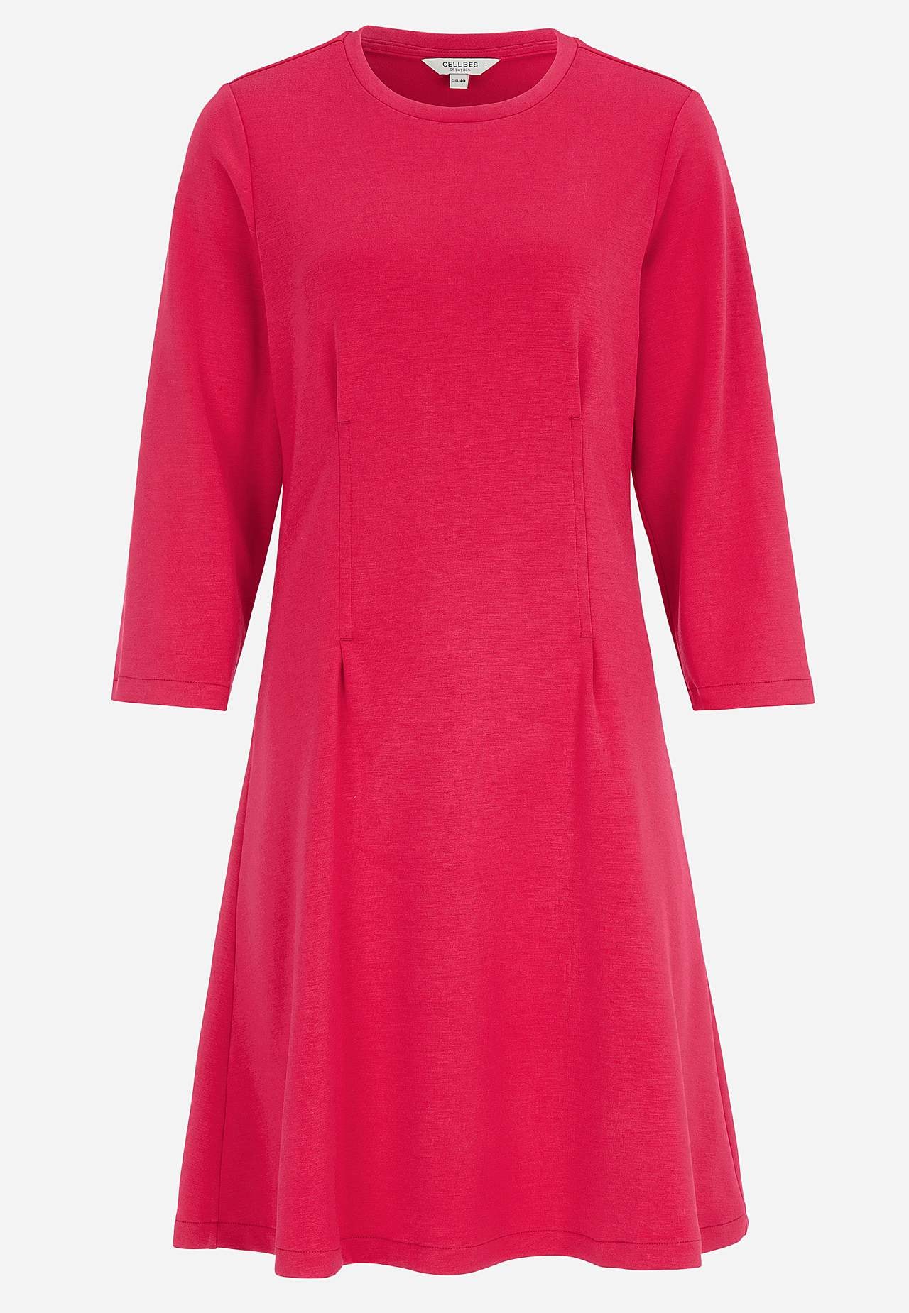 Zijdezachte jurk van iets zwaarder tricot. Elastisch en comfortabel materiaal. Regular pasvorm met flaterende coupenaad zowel aan de voor- als achterkant. Ronde halslijn. Zachtjes afgefakkelde en 3/4 lengte mouwen. Flared onderkant. Rechte zoom. De lengte varieert afhankelijk van de maat: ongeveer 94-105 cm vanaf de schoude... Meer lezen