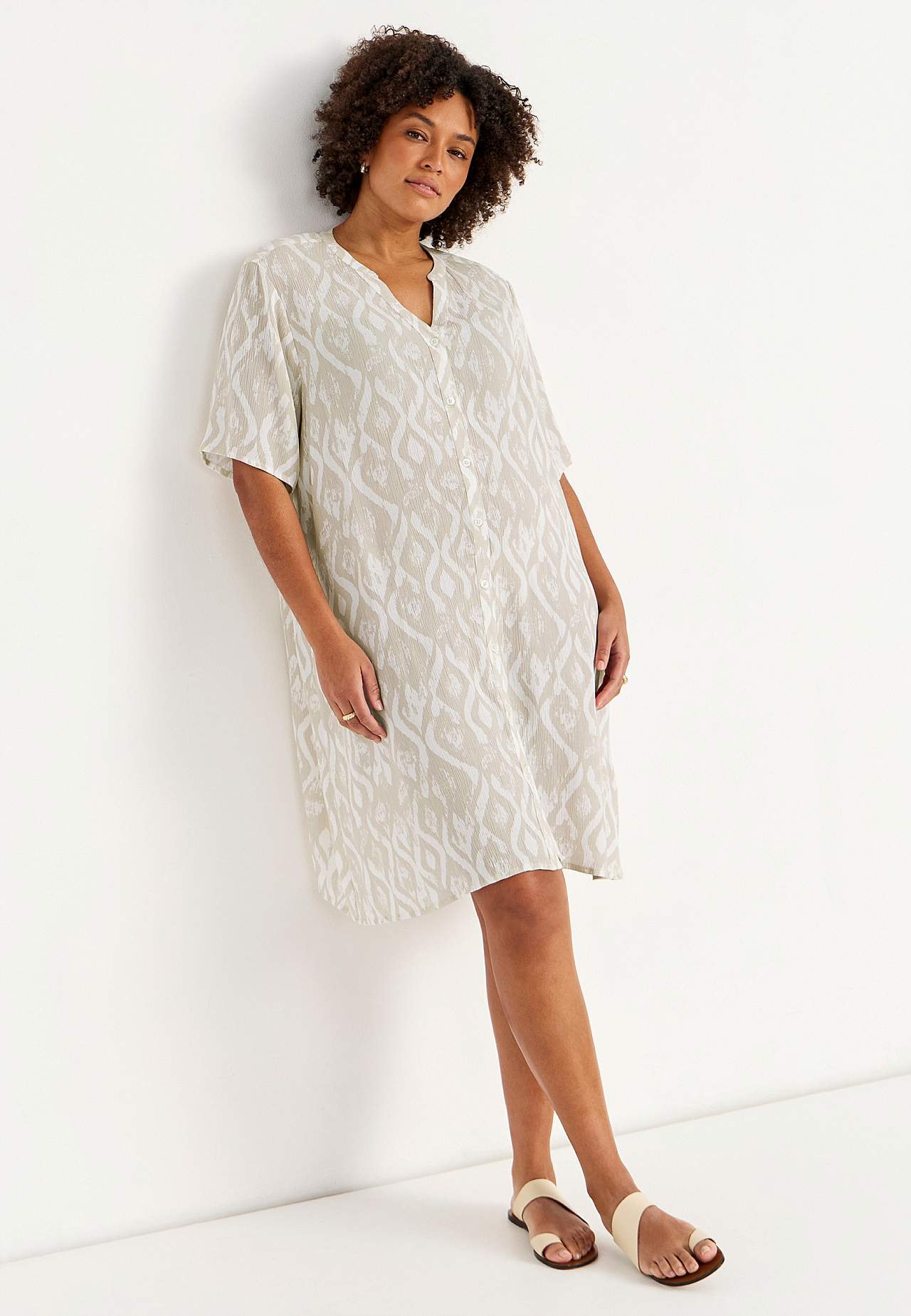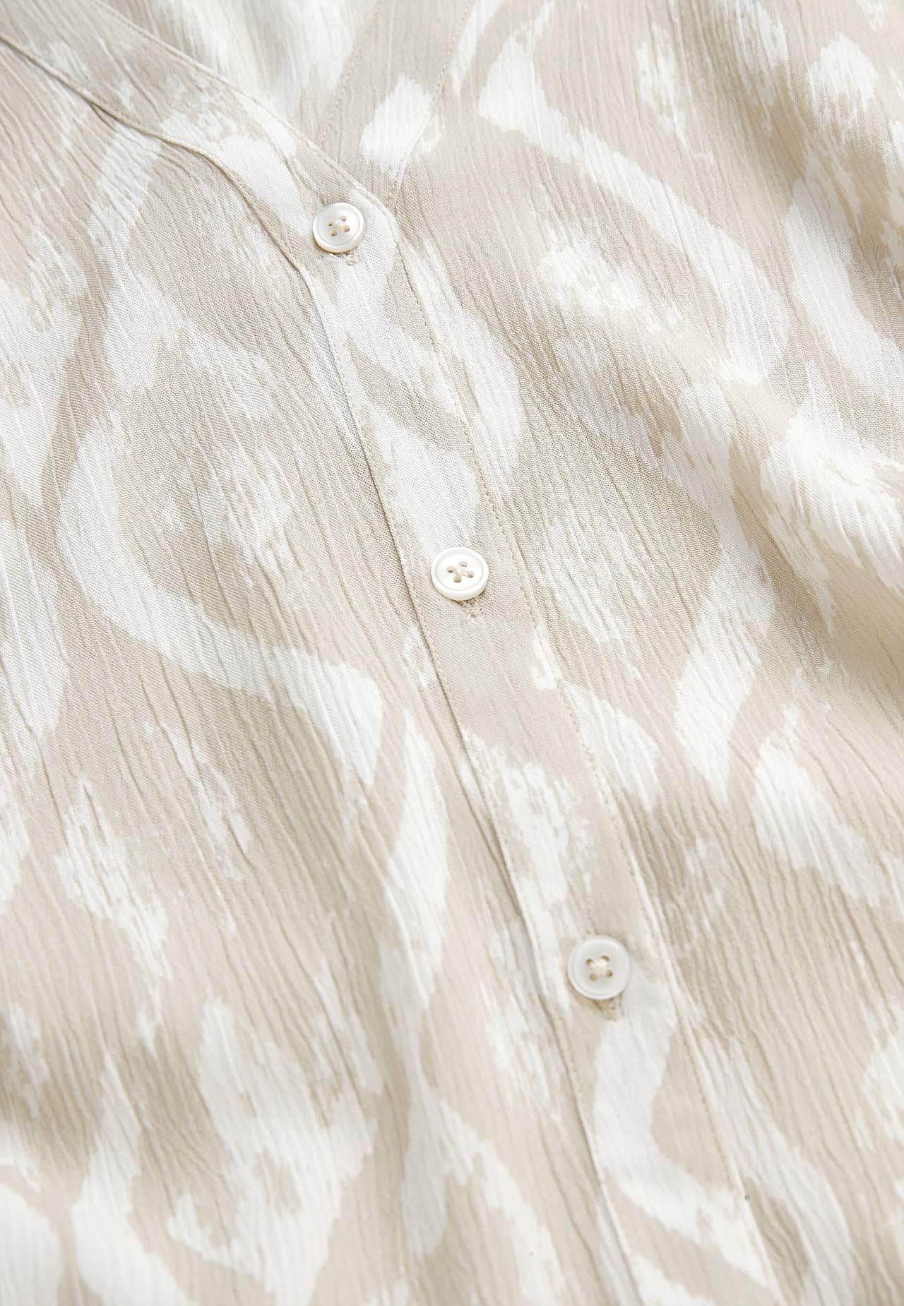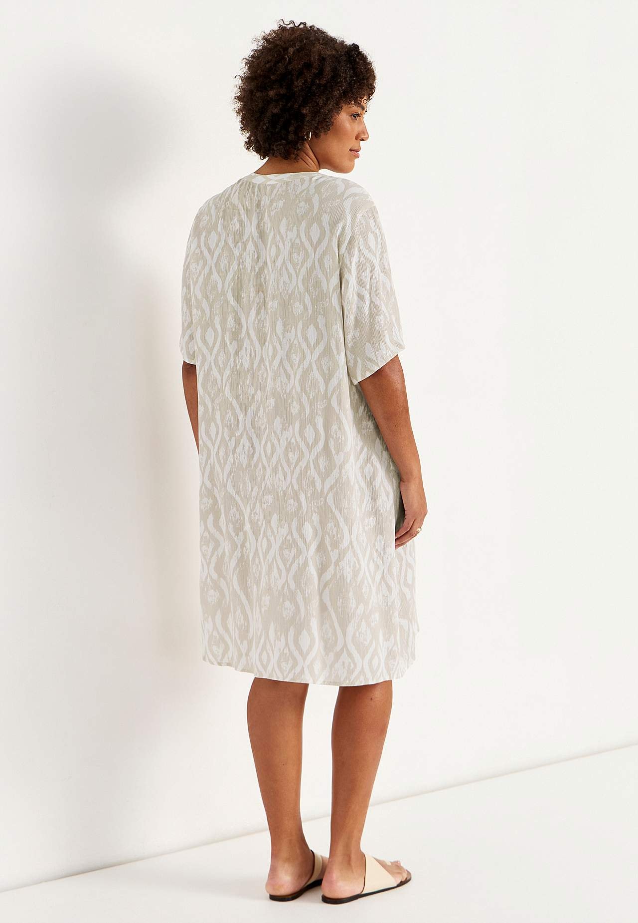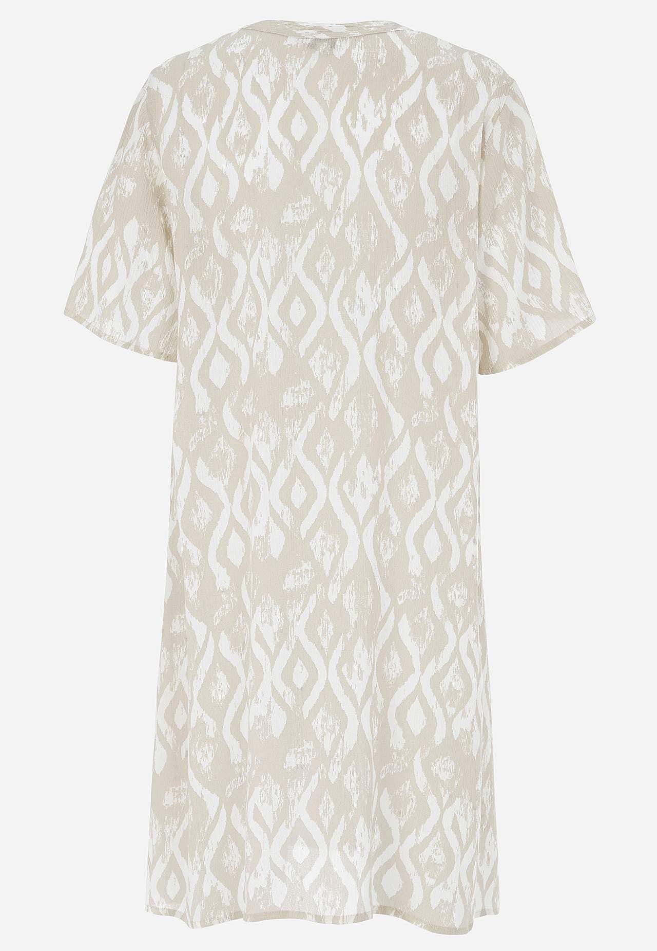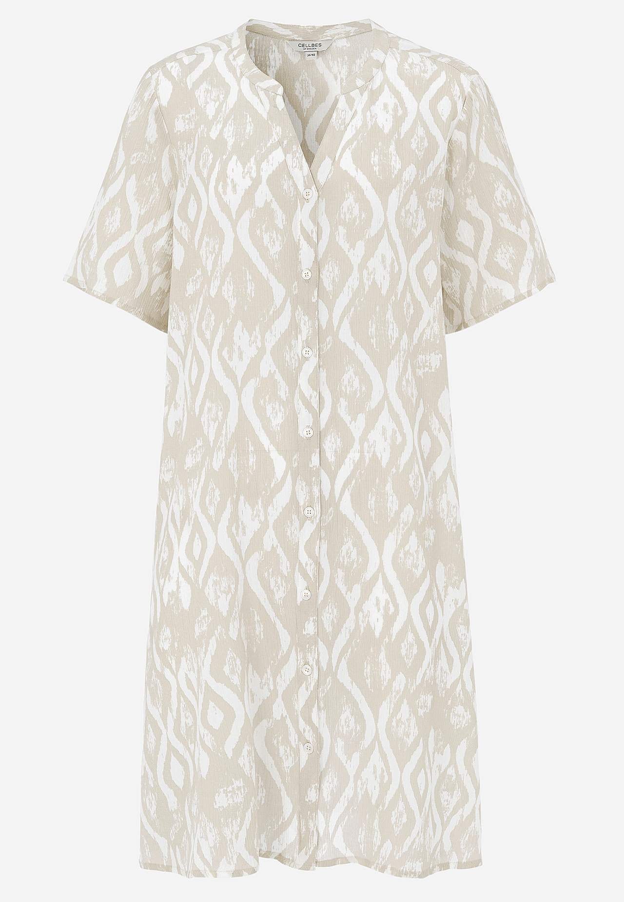 Luchtig en verkoelend materiaal met matte oppervlakte en mooie structuur. A-gevormde en iets ruimere pasvorm. Sluitknoop aan de voorkant. Korte mouwen. De ruglengte varieert per maat: ca. 97-105 cm.