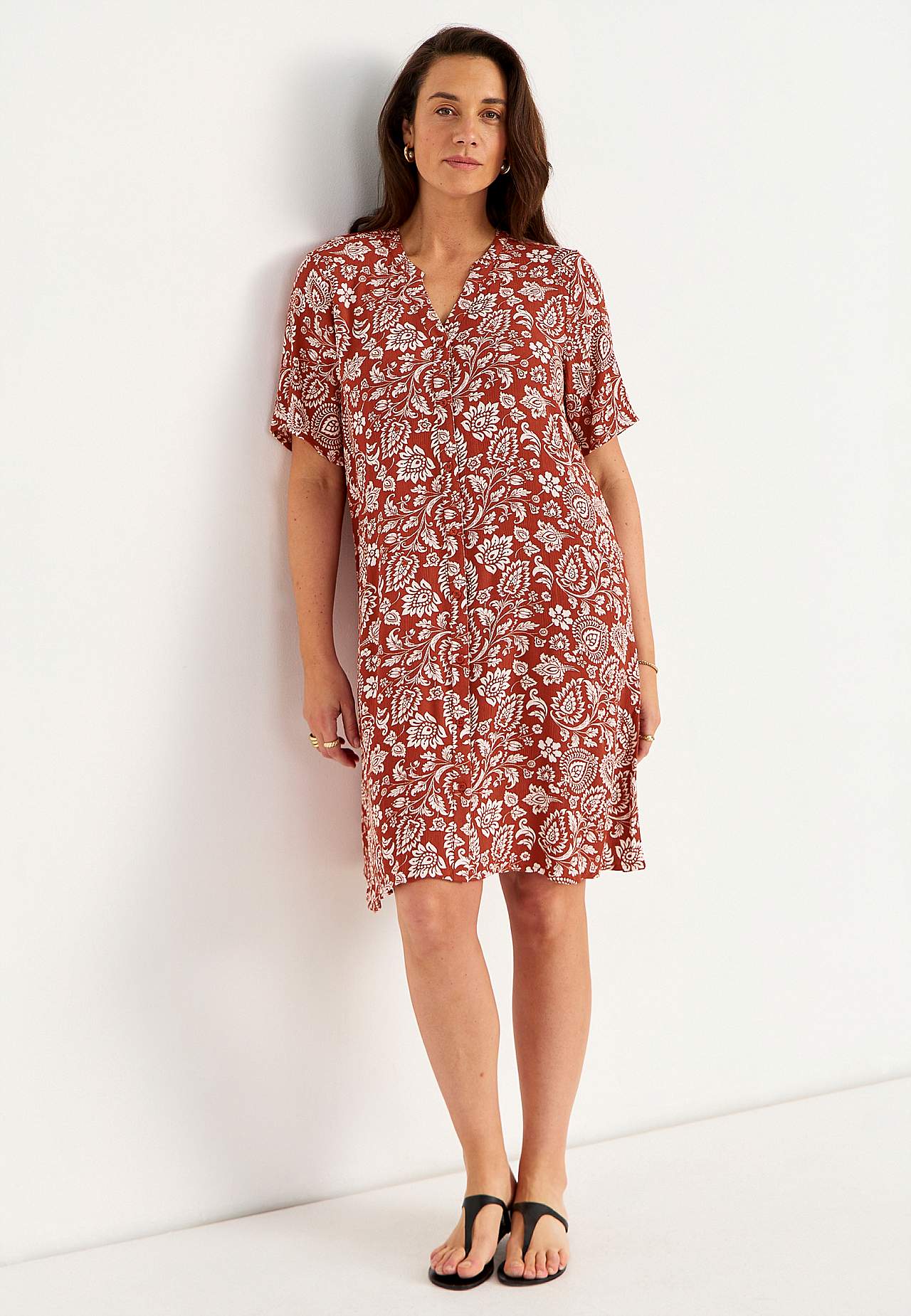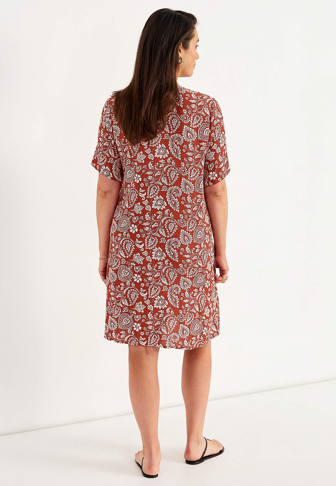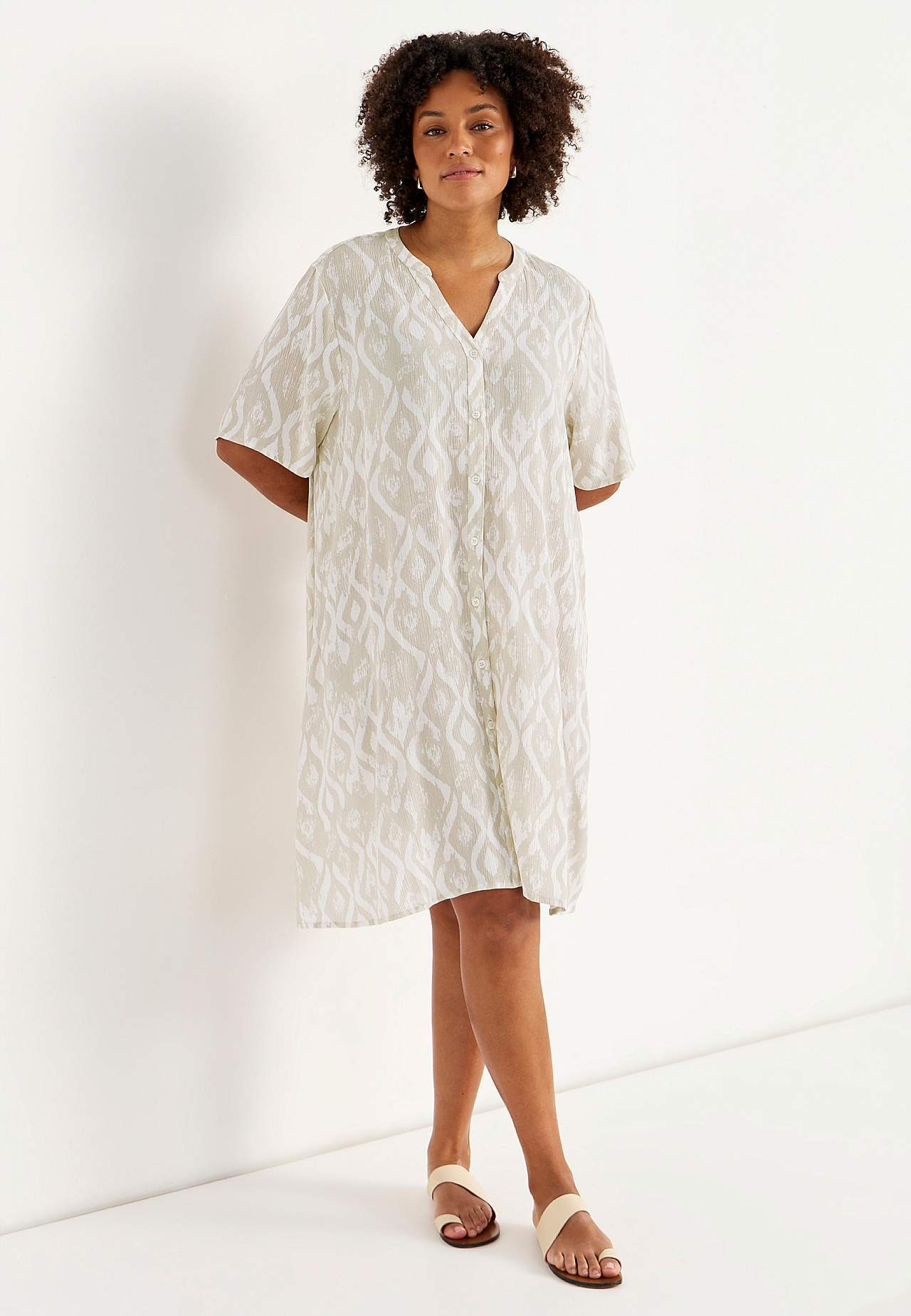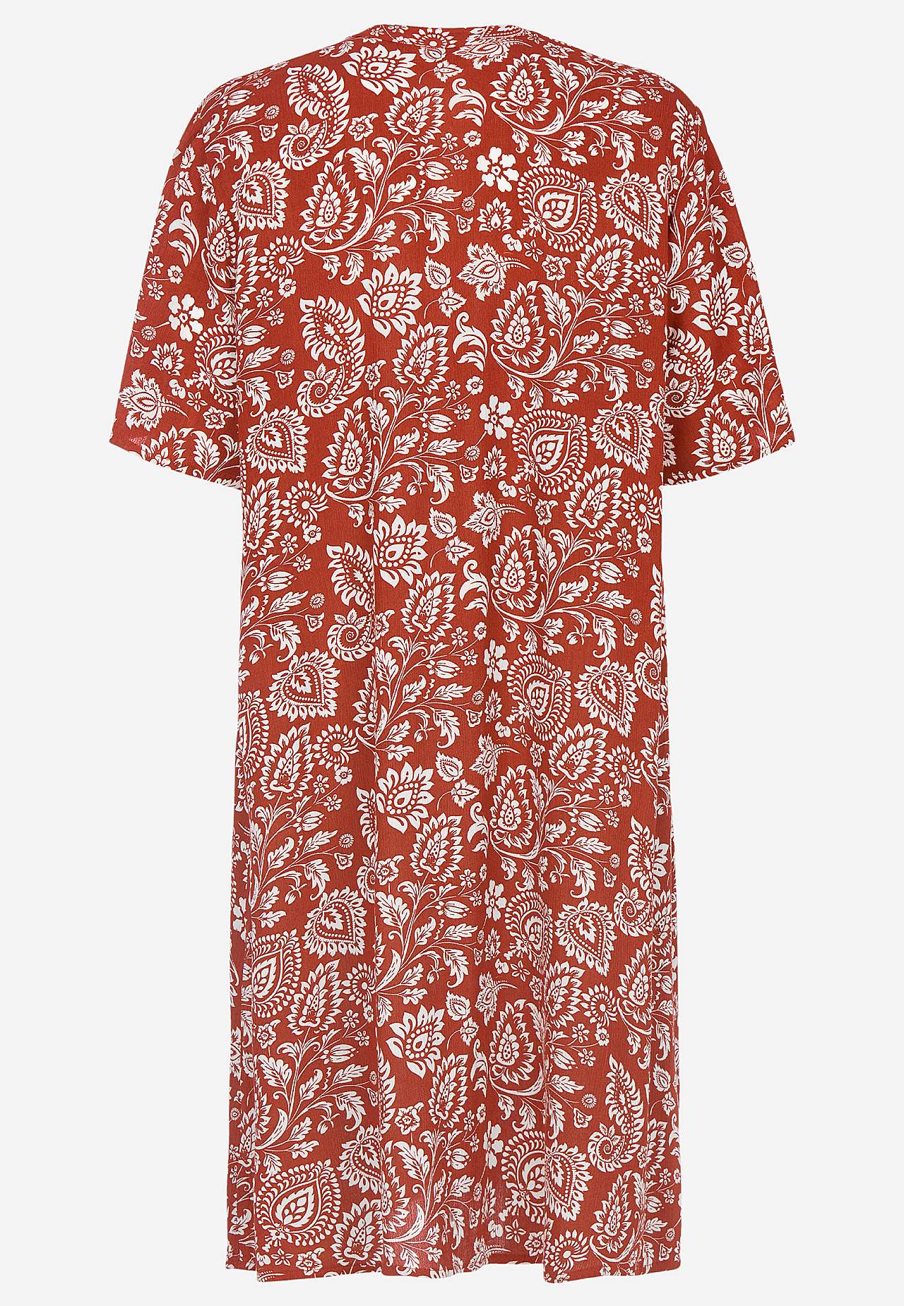 Luchtig en verkoelend materiaal met matte oppervlakte en mooie structuur. A-gevormde en iets ruimere pasvorm. Sluitknoop aan de voorkant. Korte mouwen. De ruglengte varieert per maat: ca. 97-105 cm.
