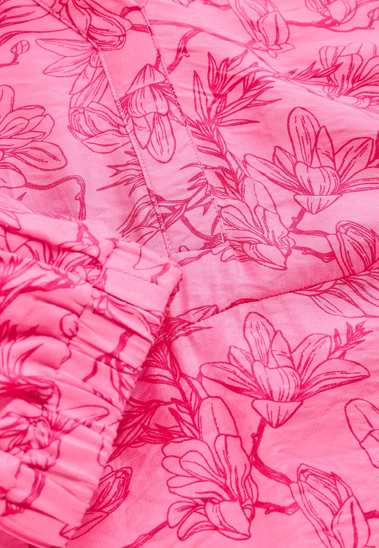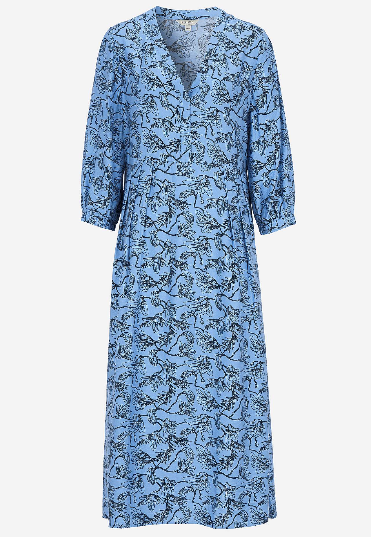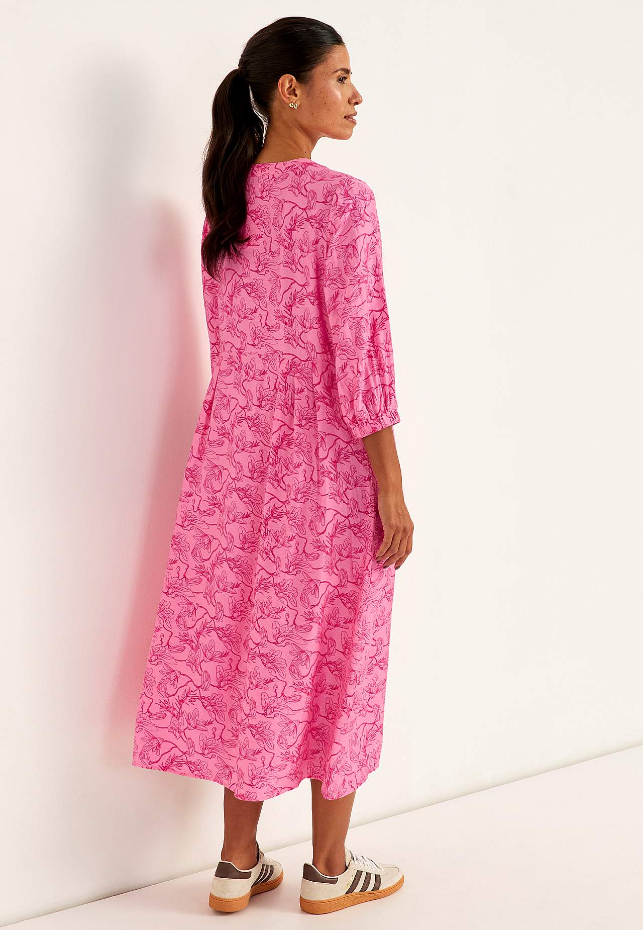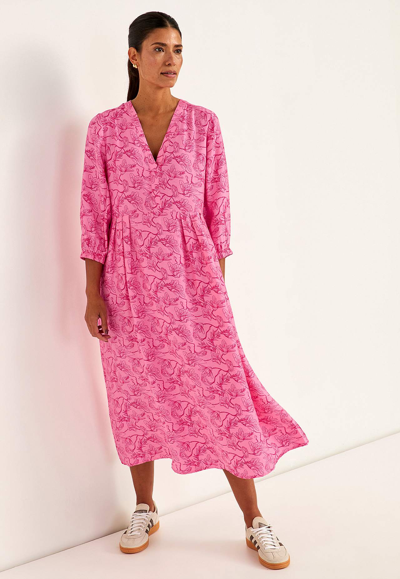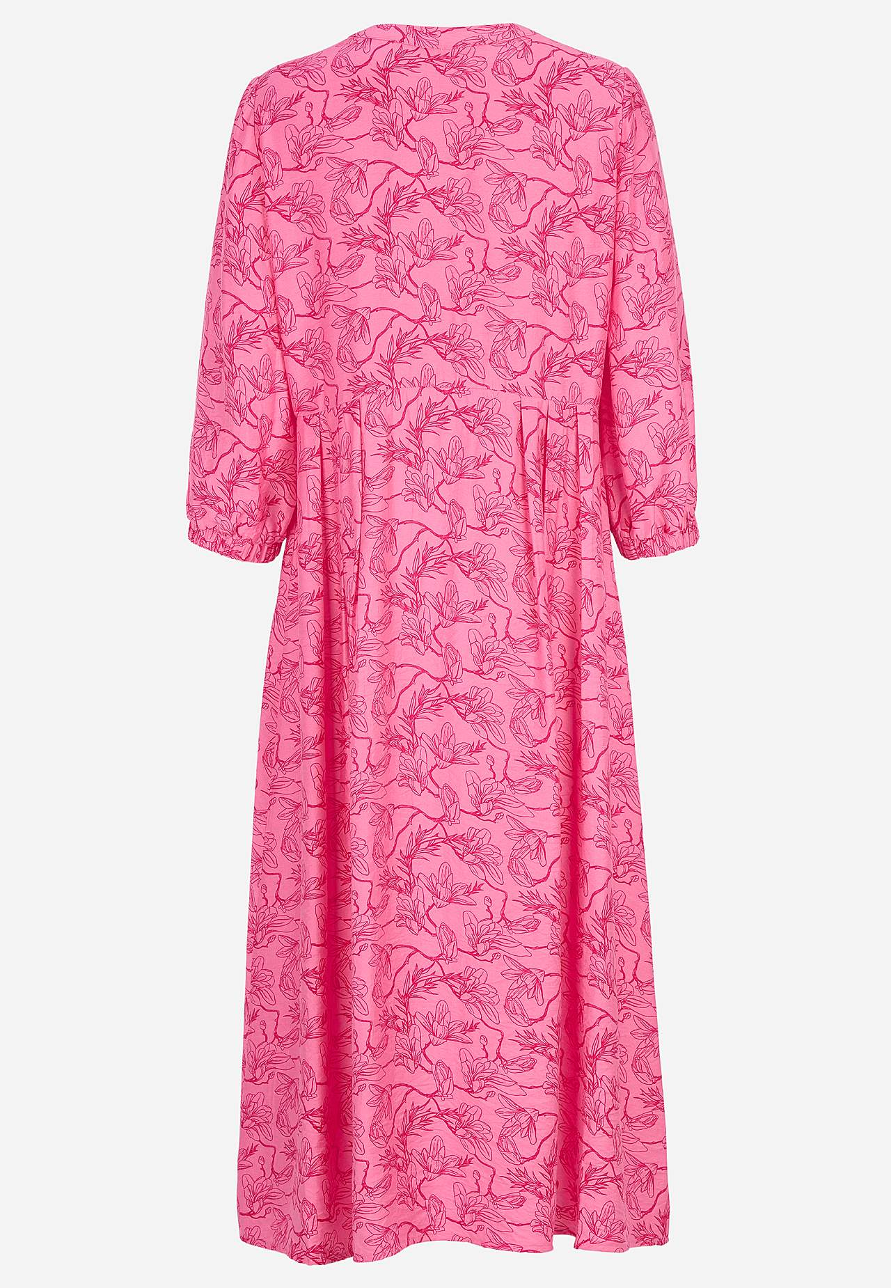 Jurk van viscose met lichte structuur en licht glanzende oppervlakte. Mooie val en verkoelend gevoel. Iets nauwere mouw pasvorm met keurig taille en onderkant met breedte. De ruglengte is ca. 125 cm in alle maten.