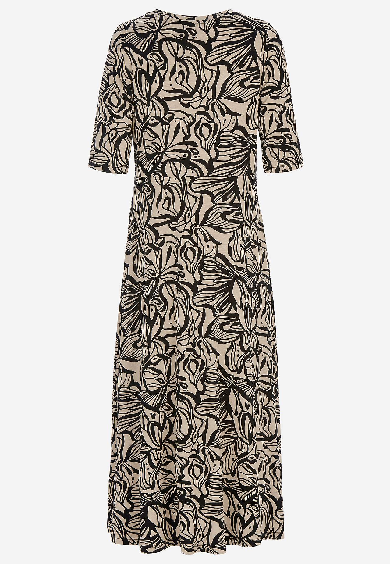 Jurk van glad en wonderbaarlijk zacht viscose jersey. Materiaal met zware en mooie val. Regular pasvorm met informele breedte aan de onderkant. V-vormige neklijn. 3/4 lengte en smalle mouwen. Naad aan de taille. Zakken aan de zijkant. De ruglengte is ca. 125 cm in alle maten.