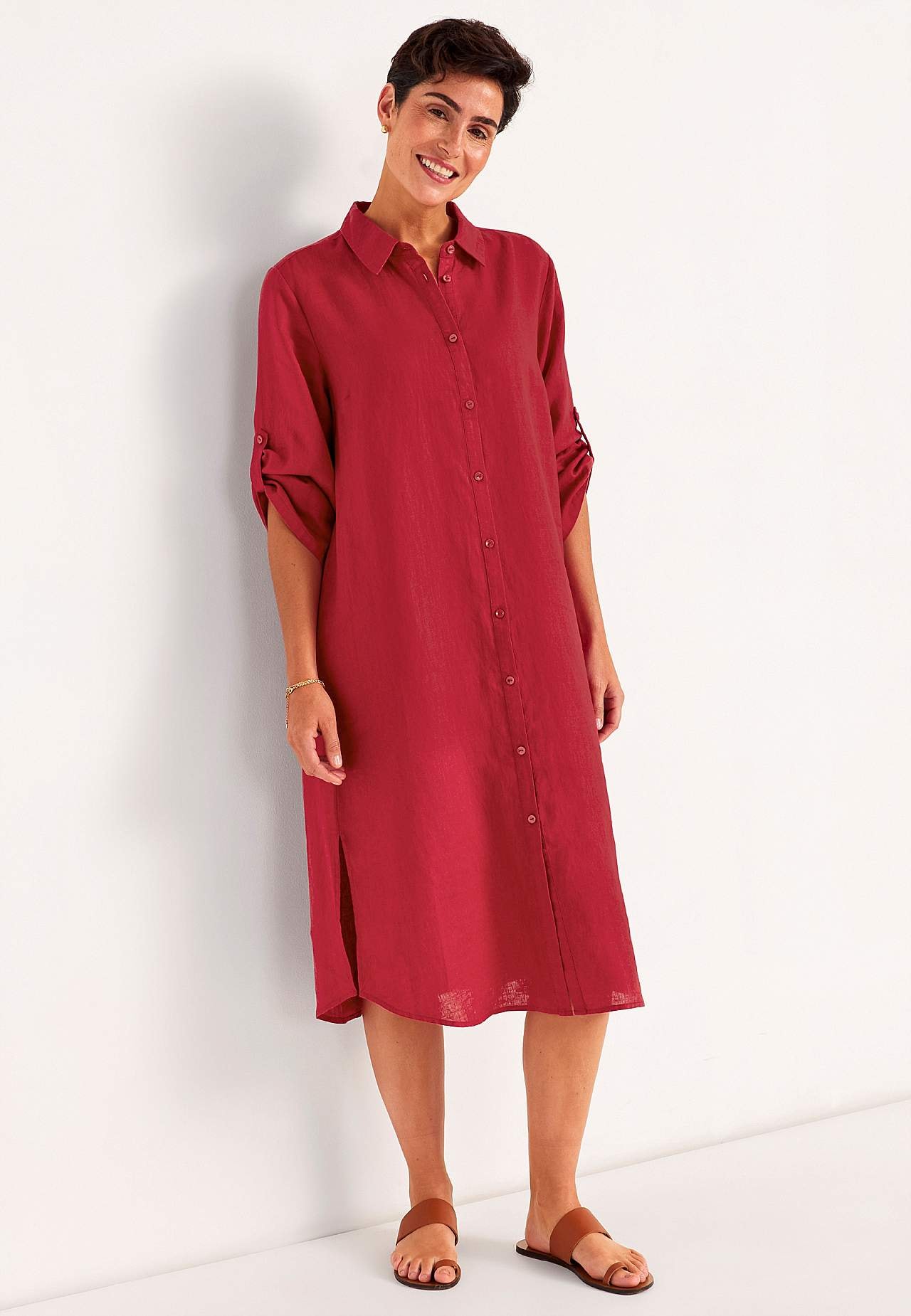 Hemdjurk van 100% vlas. Luchtig materiaal. Ruime en rechte snitte pasvorm. Knoopsluiting van boven naar beneden. Opvouwbare lange mouw met knoop detail. Coupenaden aan de borsten voor de beste pasvorm. Een echte dagelijkse favoriet. De lengte varieert afhankelijk van de maat: ongeveer 116-124 cm vanaf de schouder.