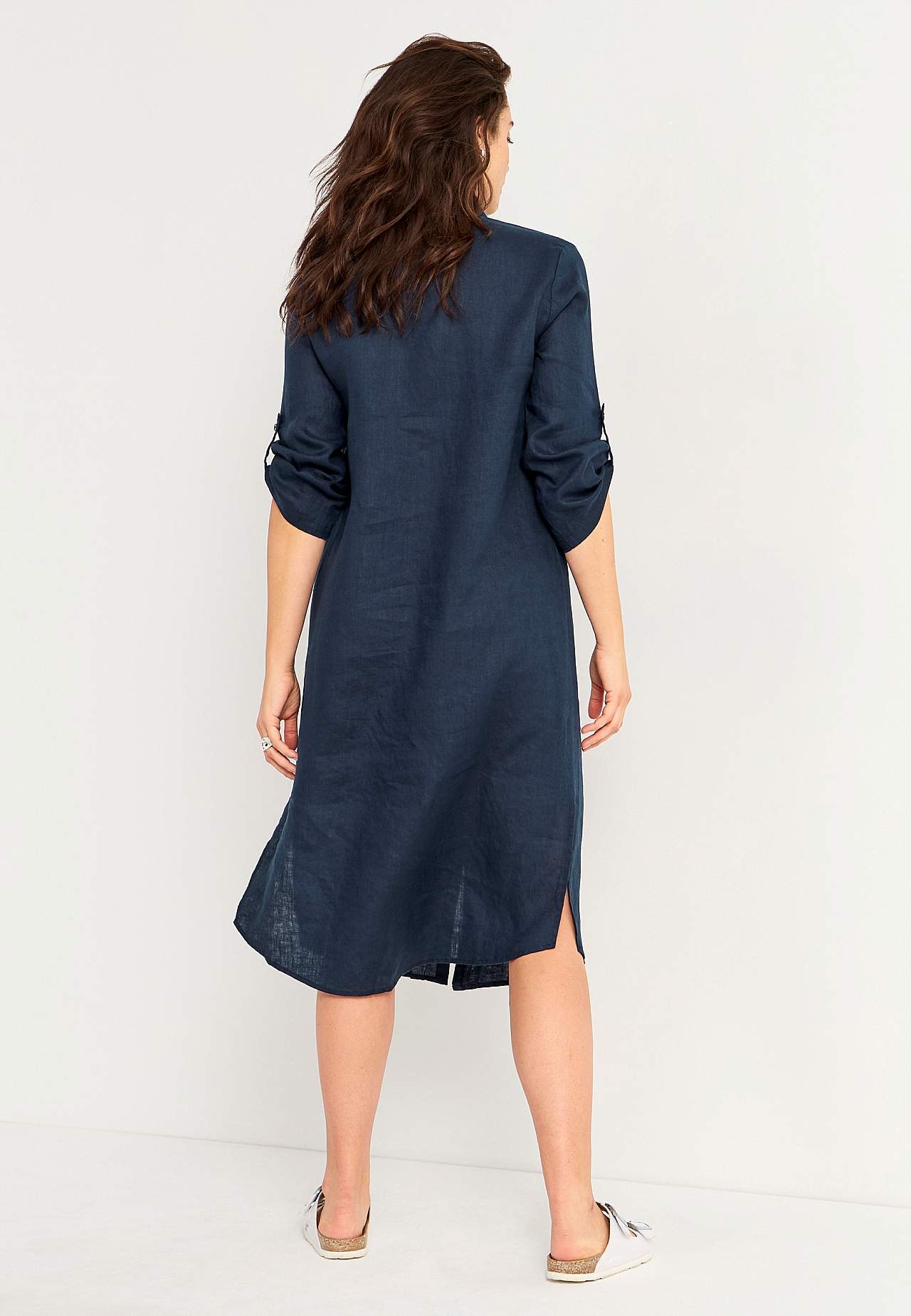 Hemdjurk van 100% vlas. Luchtig materiaal. Ruime en rechte snitte pasvorm. Knoopsluiting van boven naar beneden. Opvouwbare lange mouw met knoop detail. Coupenaden aan de borsten voor de beste pasvorm. Een echte dagelijkse favoriet. De lengte varieert afhankelijk van de maat: ongeveer 116-124 cm vanaf de schouder.