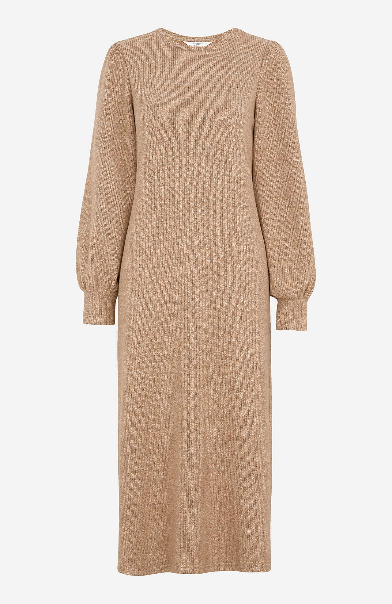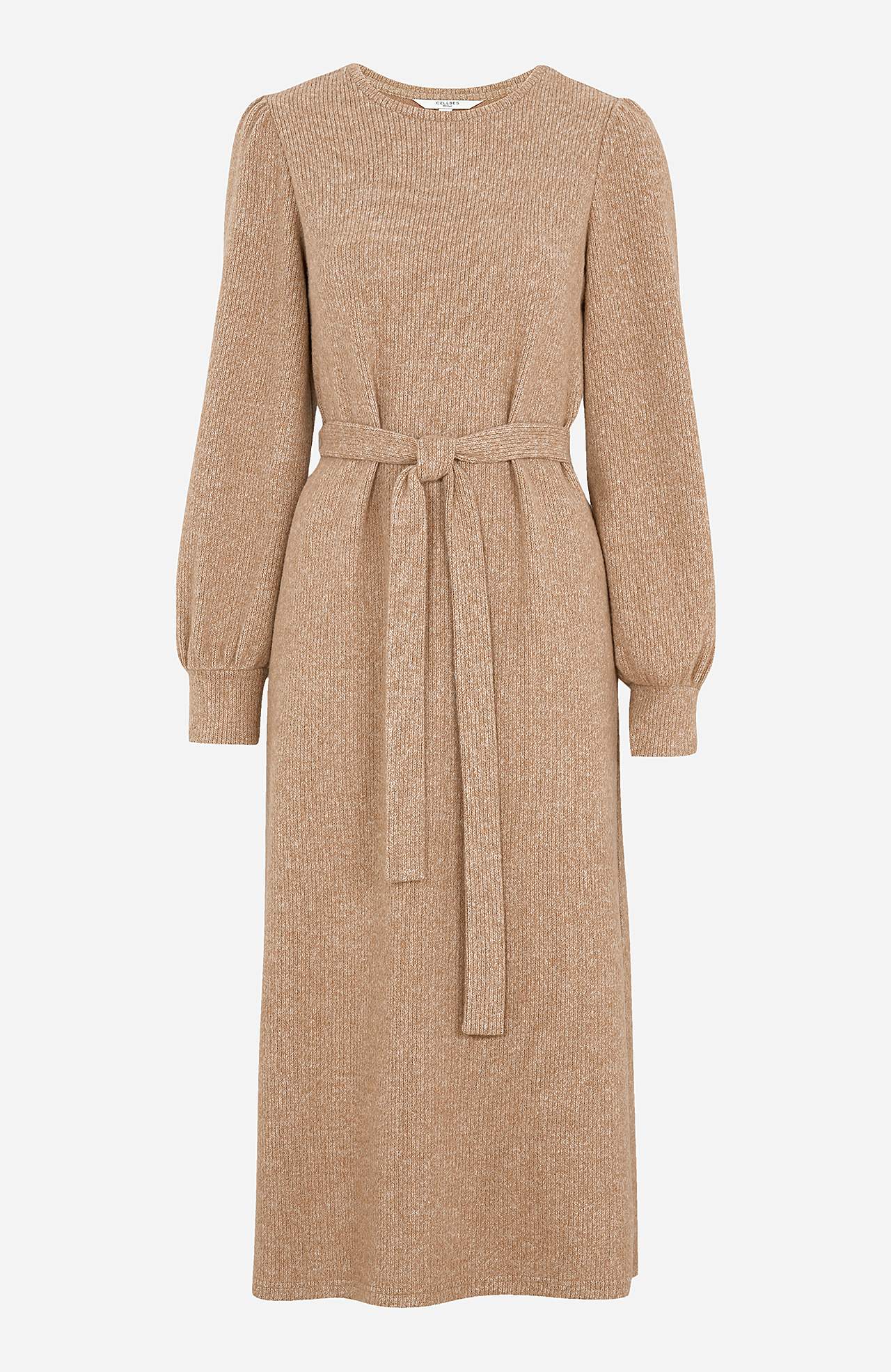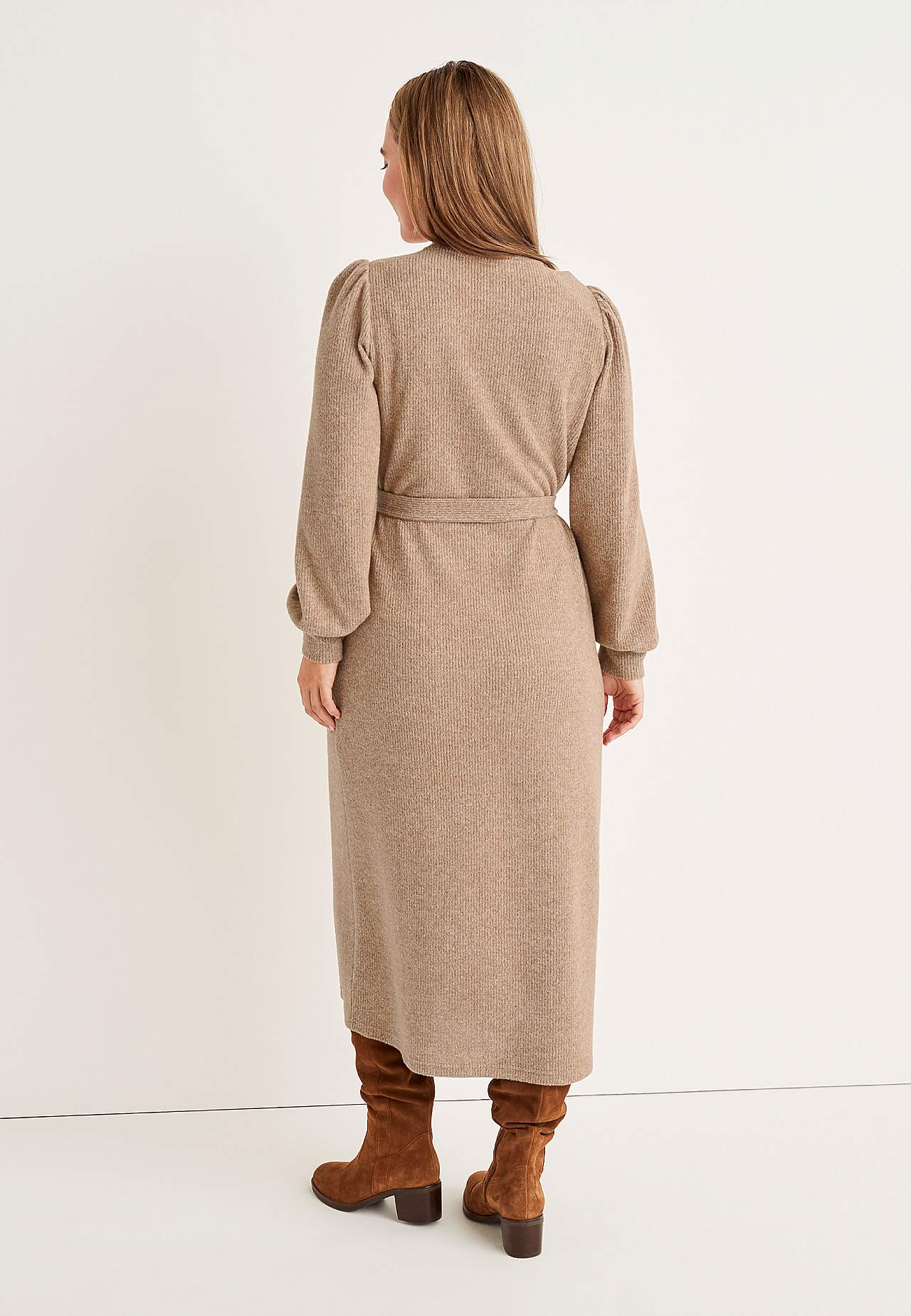Jurk van geribbeld tricot met knoopriem aan de taille. De ruglengte is ca. 120 cm in alle maten.