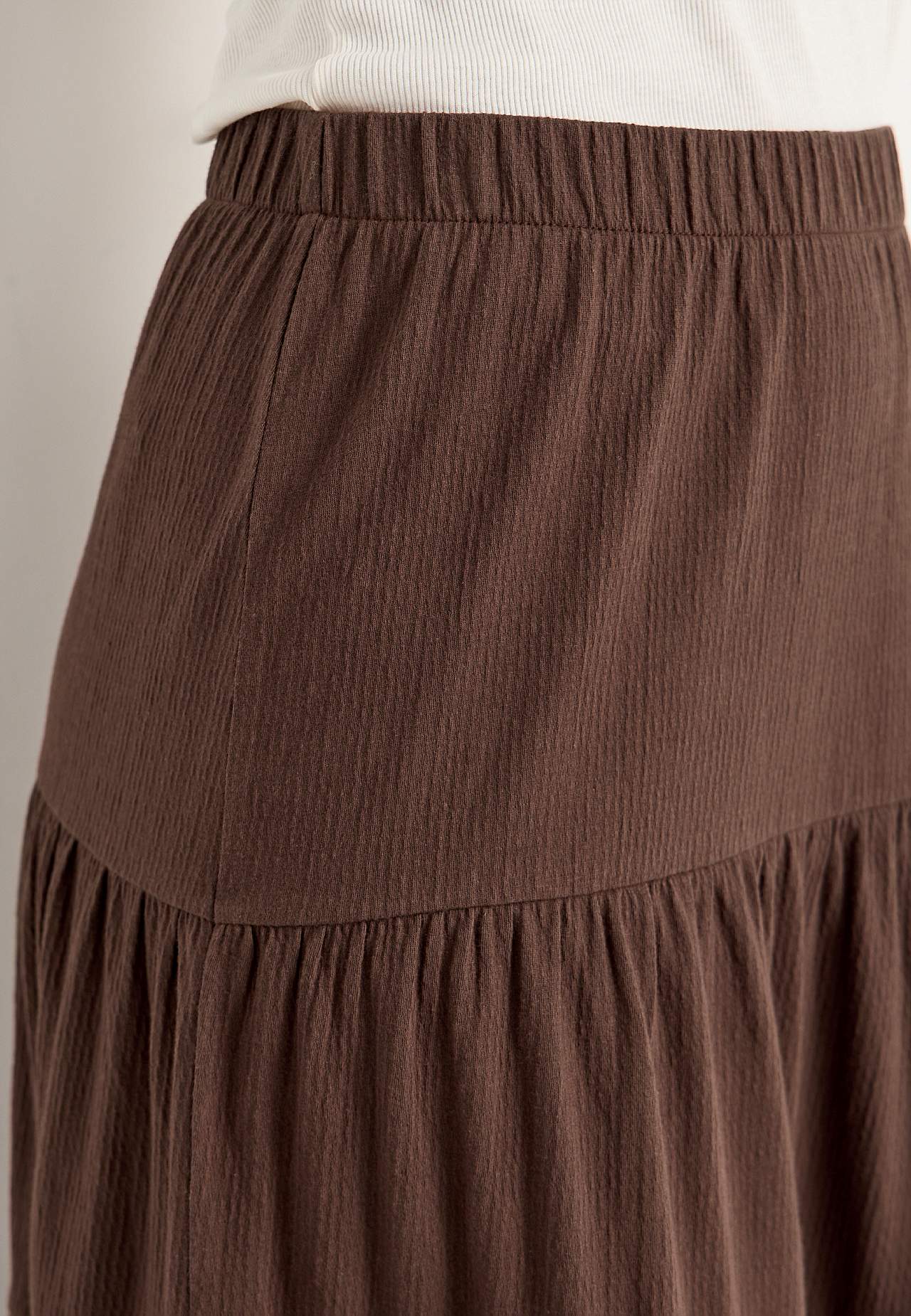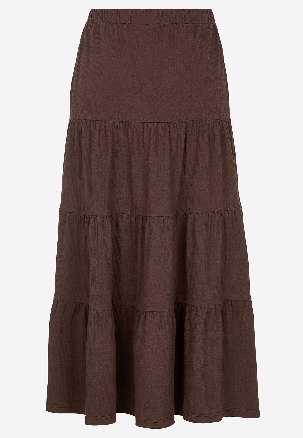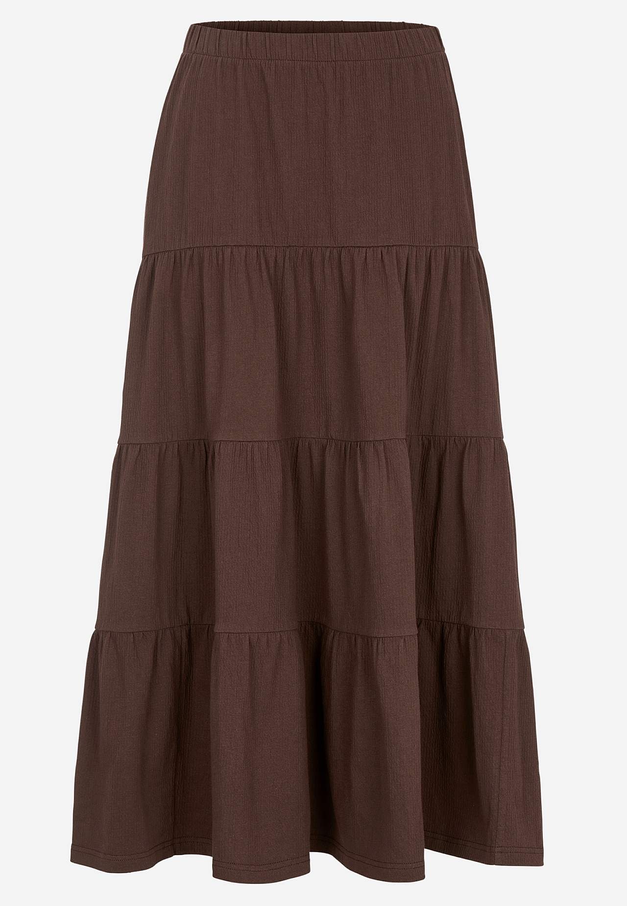 Zachte en elastische rok met golvende structuur. A-gevormde pasvorm met breedte aan de onderkant. Taille met zachte en brede elastiek. Afgeronde zoom. Combineer met 701369. Lengte: 90 cm.