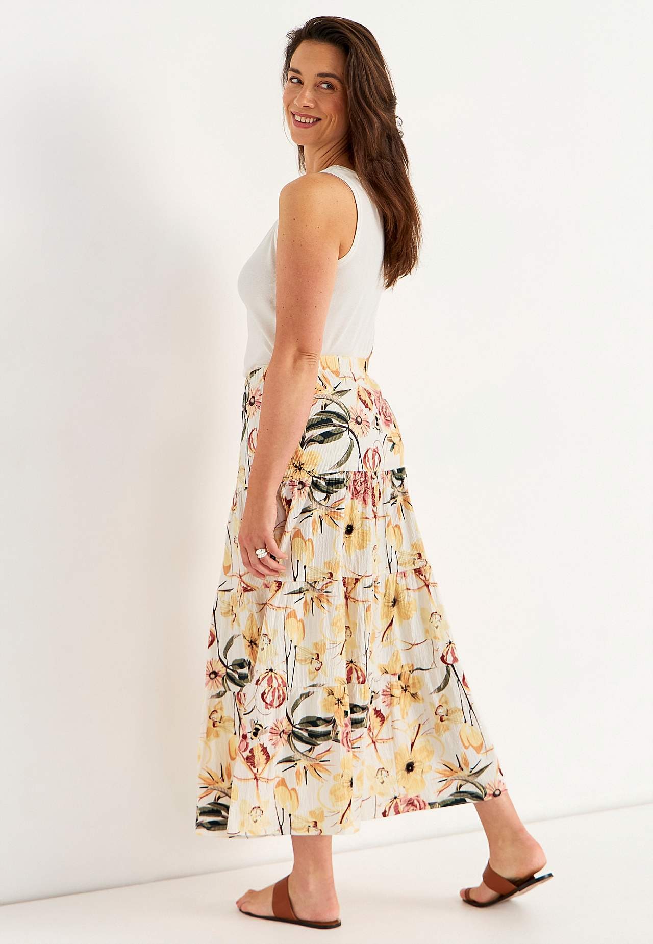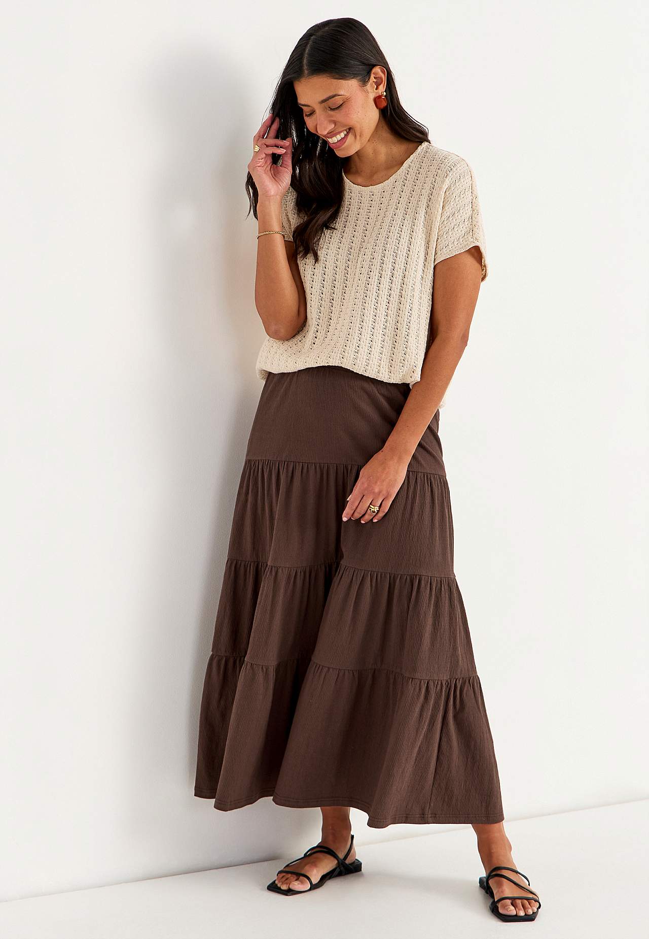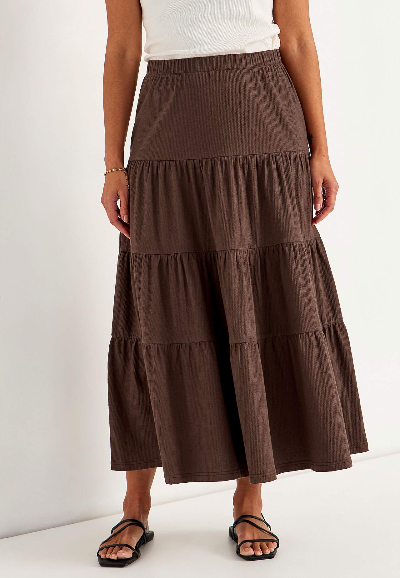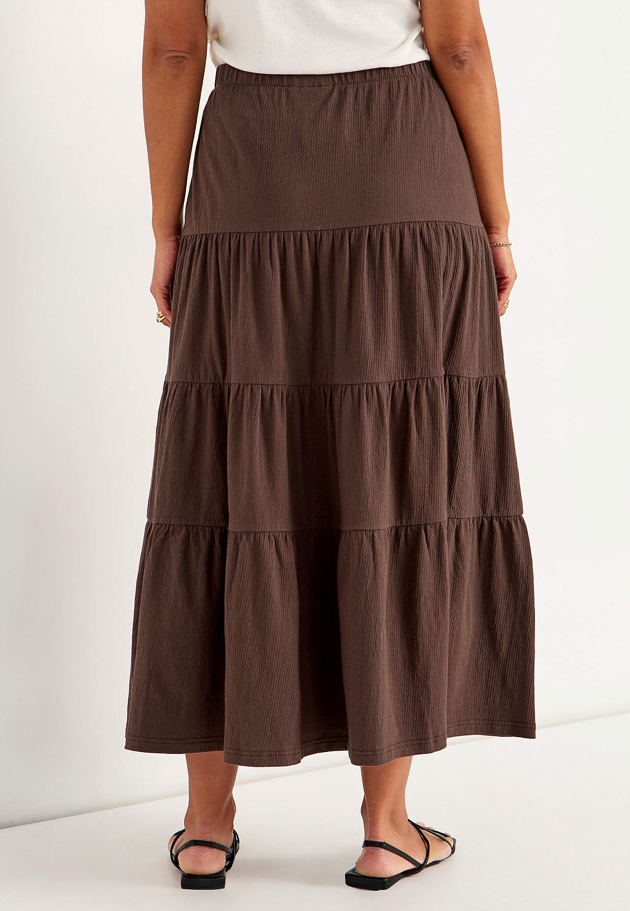 Zachte en elastische rok met golvende structuur. A-gevormde pasvorm met breedte aan de onderkant. Taille met zachte en brede elastiek. Afgeronde zoom. Combineer met 701369. Lengte: 90 cm.