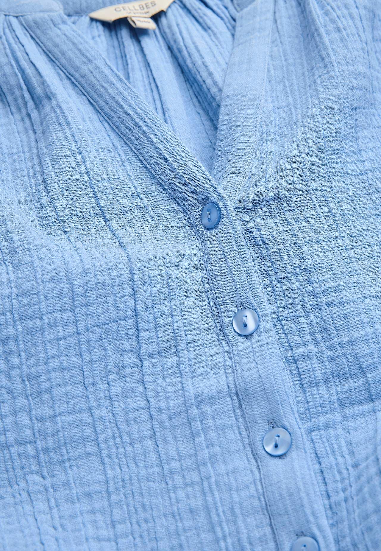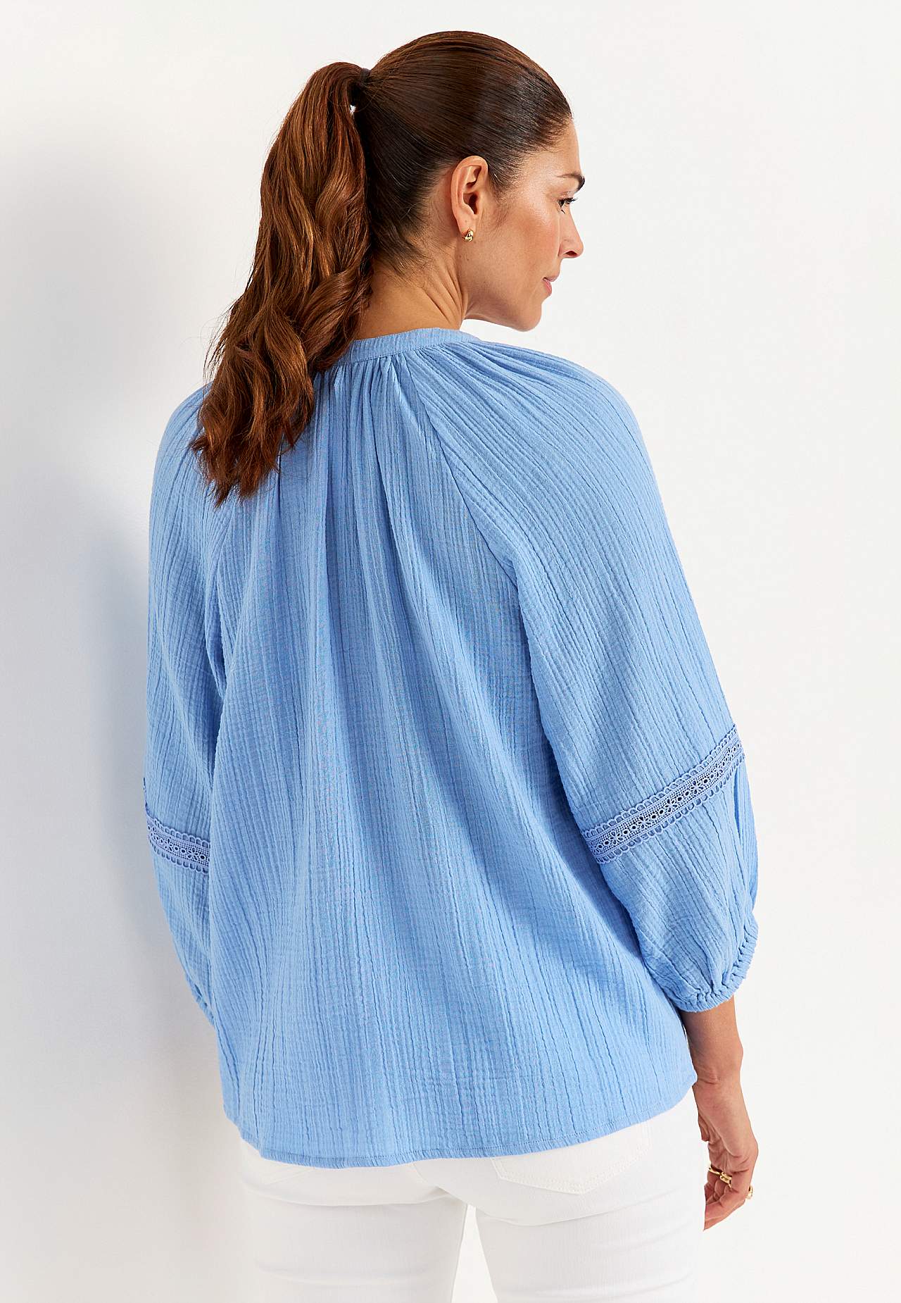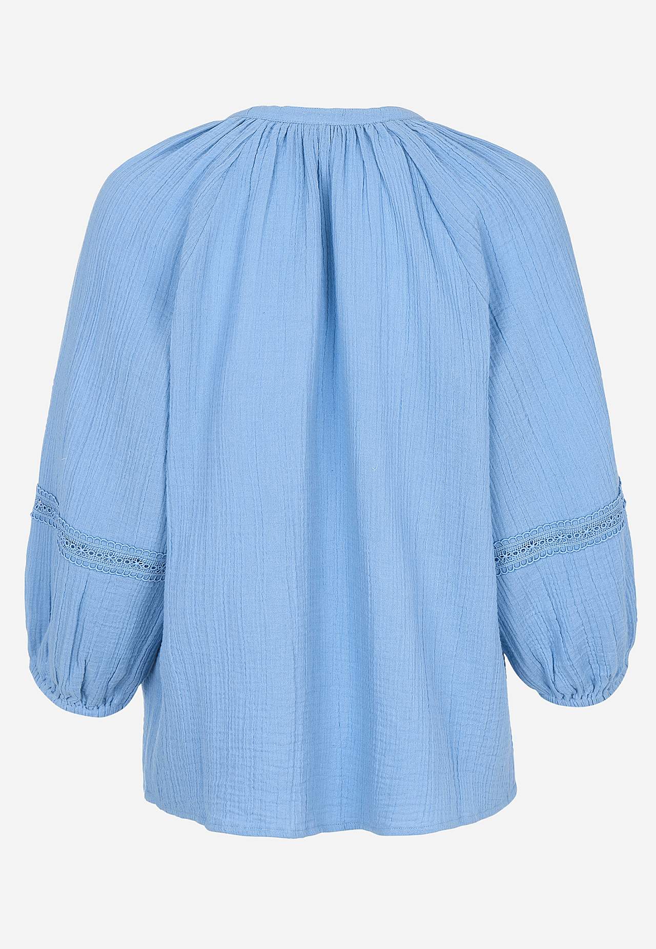 Luchtige bloes met mooie afwerkingen van kant op de mouwen. Gevlochten materiaal van mooi katoenen gaas met structuur. Losse pasvorm. Ronde nek met smalle v-necksnit. Sluitknoppen aan de voorkant. 3/4 lengte en wijde raglanmouwen met puffer en elastiek bij de manchetten. Fijn afgewerkte kanten rand langs de raglannaad en he... Meer lezen