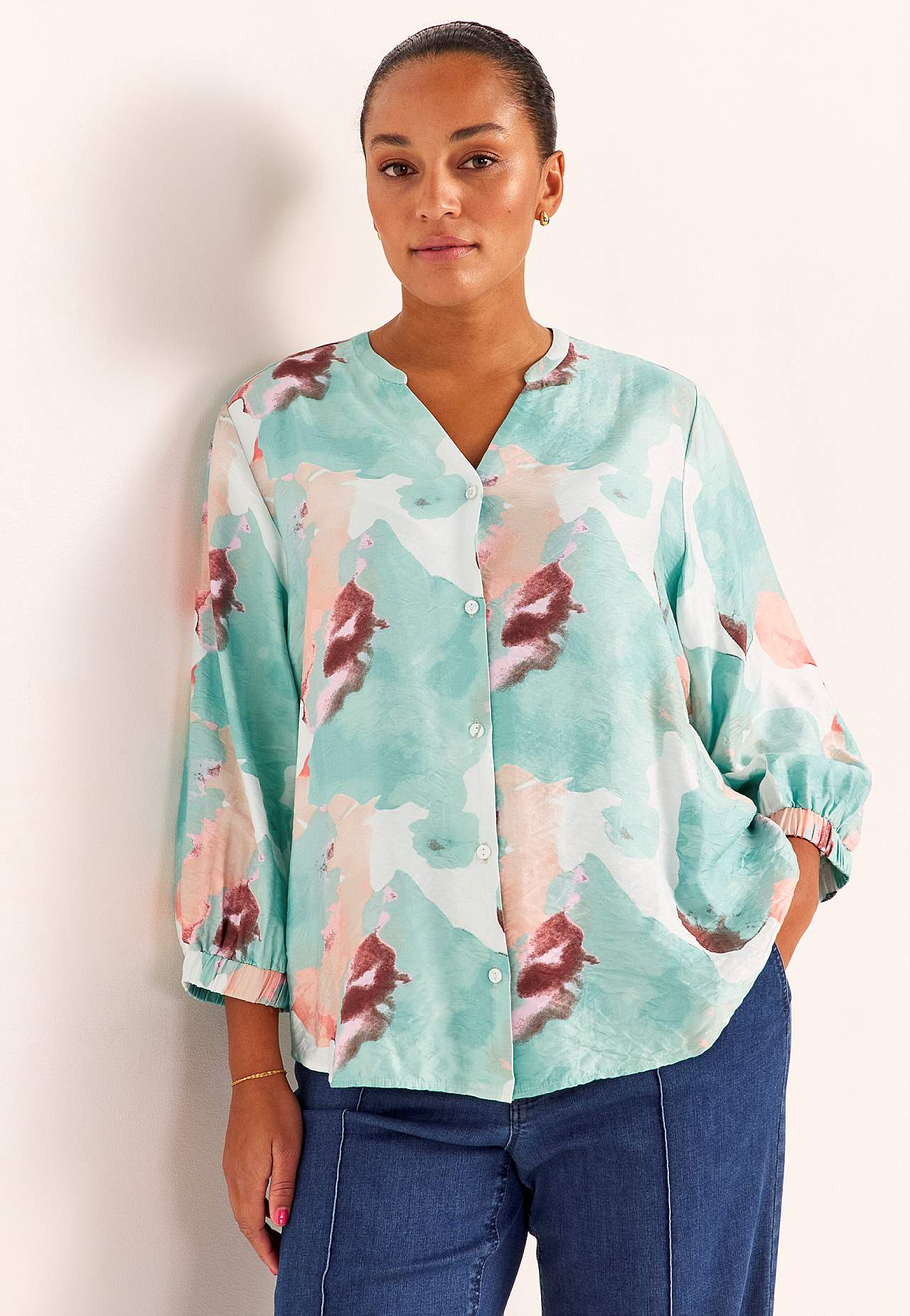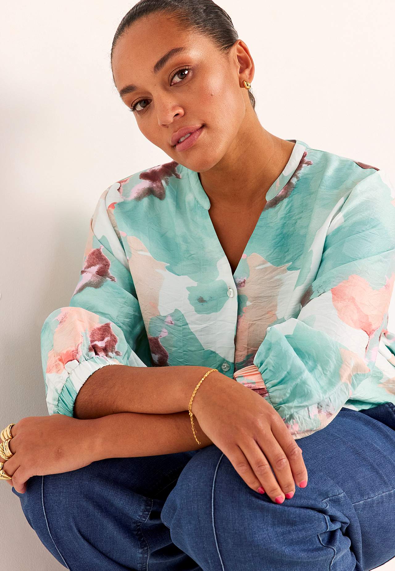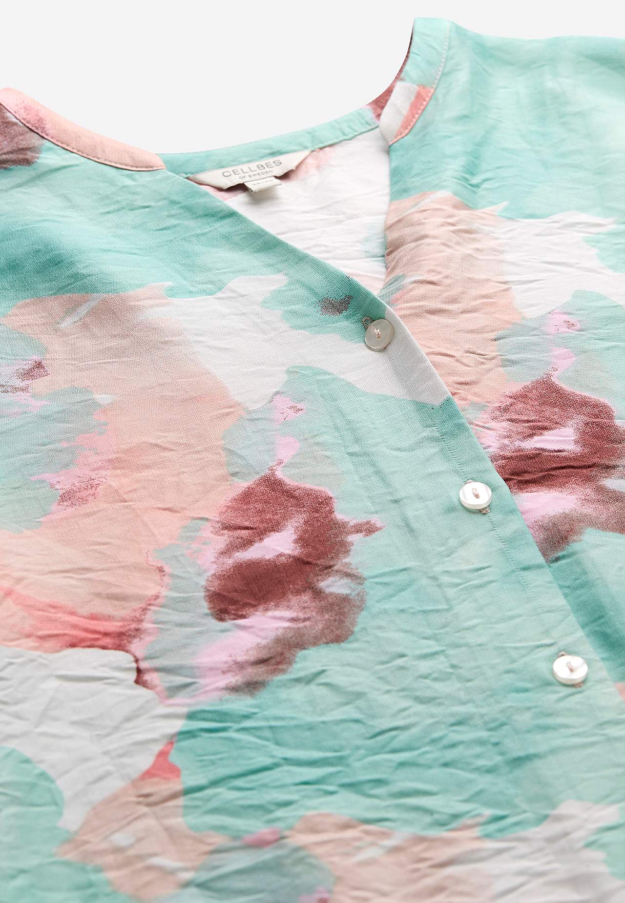 Bloes van viscose met licht glanzend getextureerd gevlochten stof. Mooie val en verkoelend gevoel. Regular pasvorm. Afgeronde nek met v-cut aan de voorkant. Sluitknoop met vijf mooie knoppen. Lichtjes afgeronde zoom. De lengte varieert afhankelijk van de maat: ongeveer 62-76 cm vanaf de schouder.