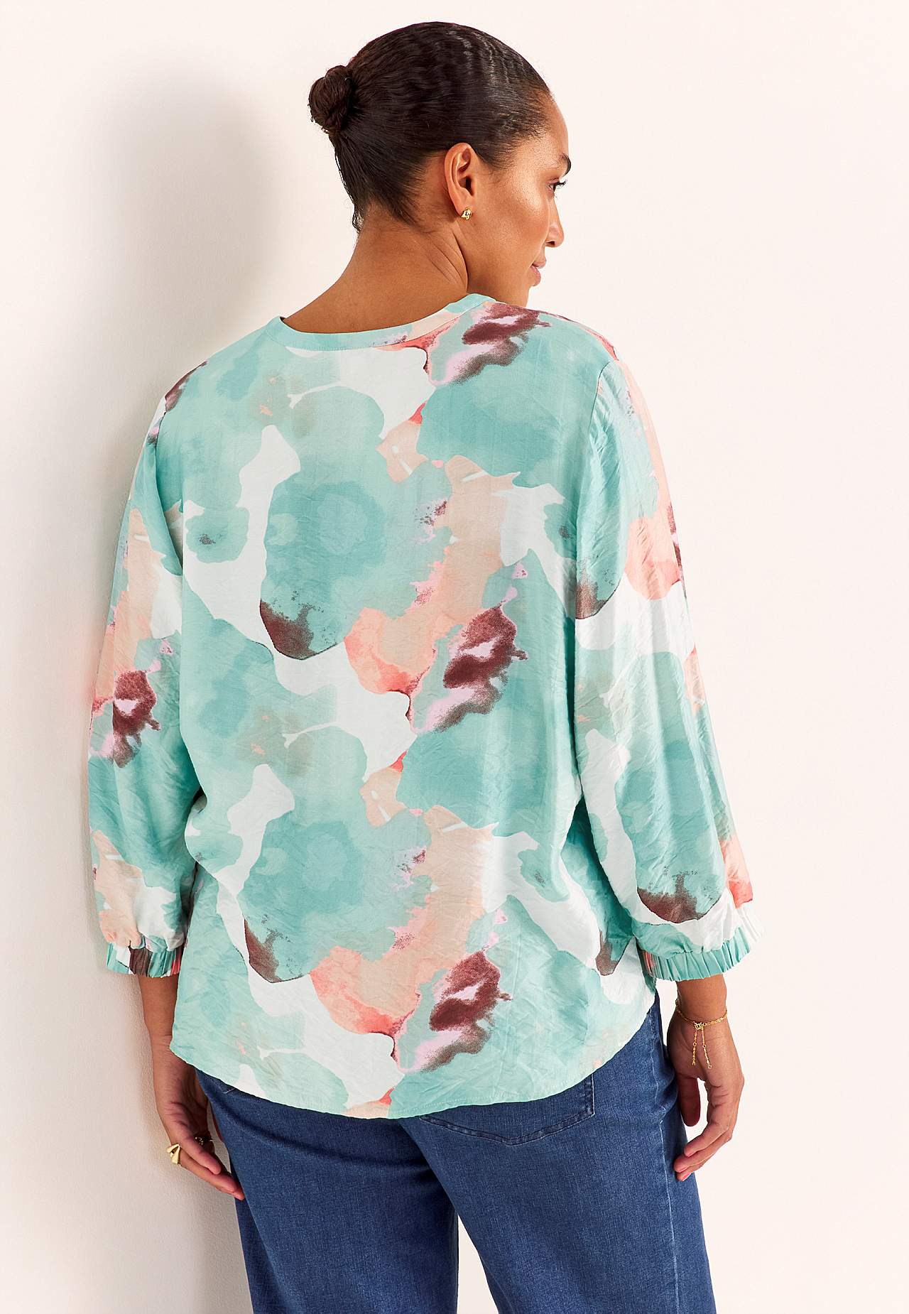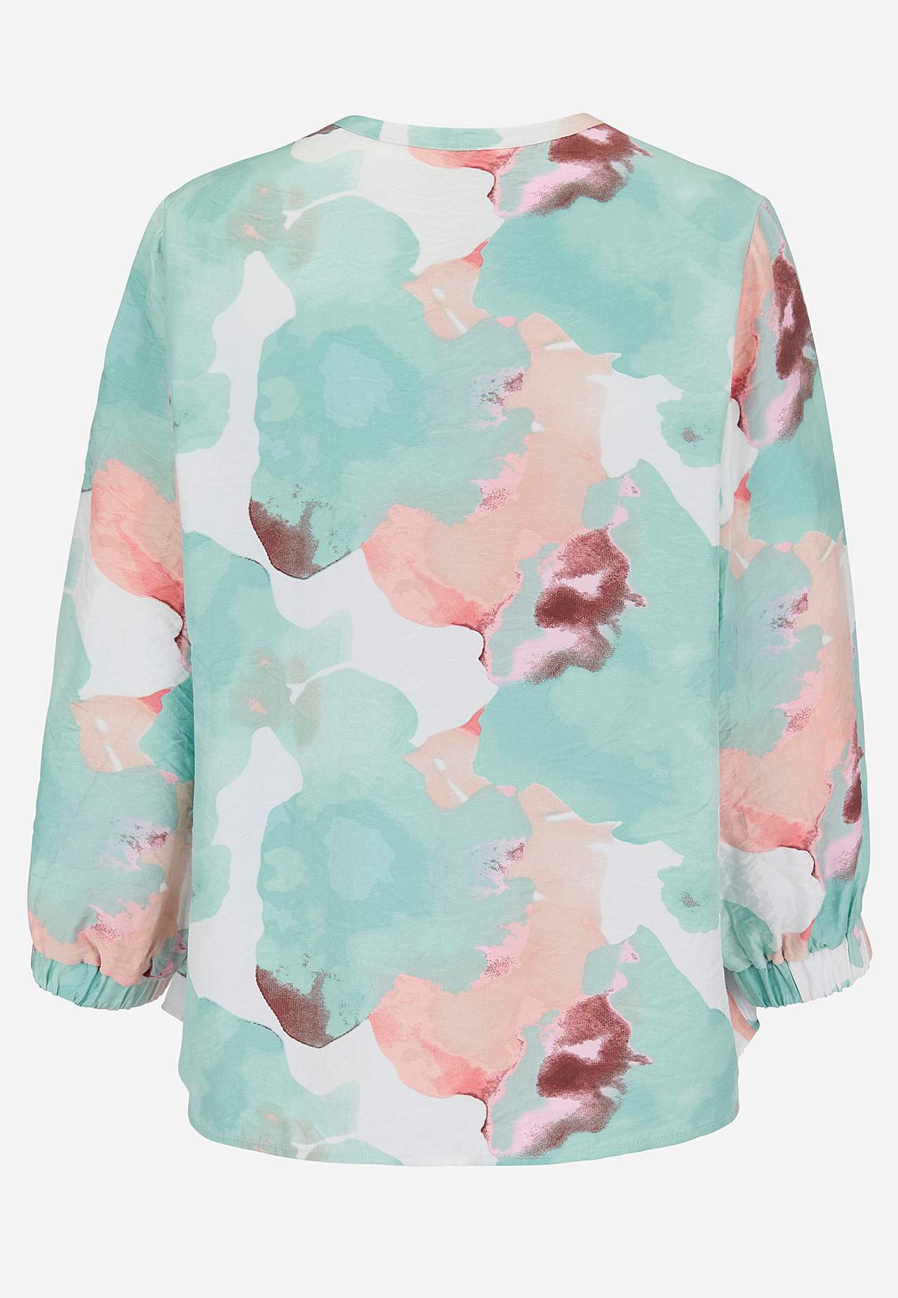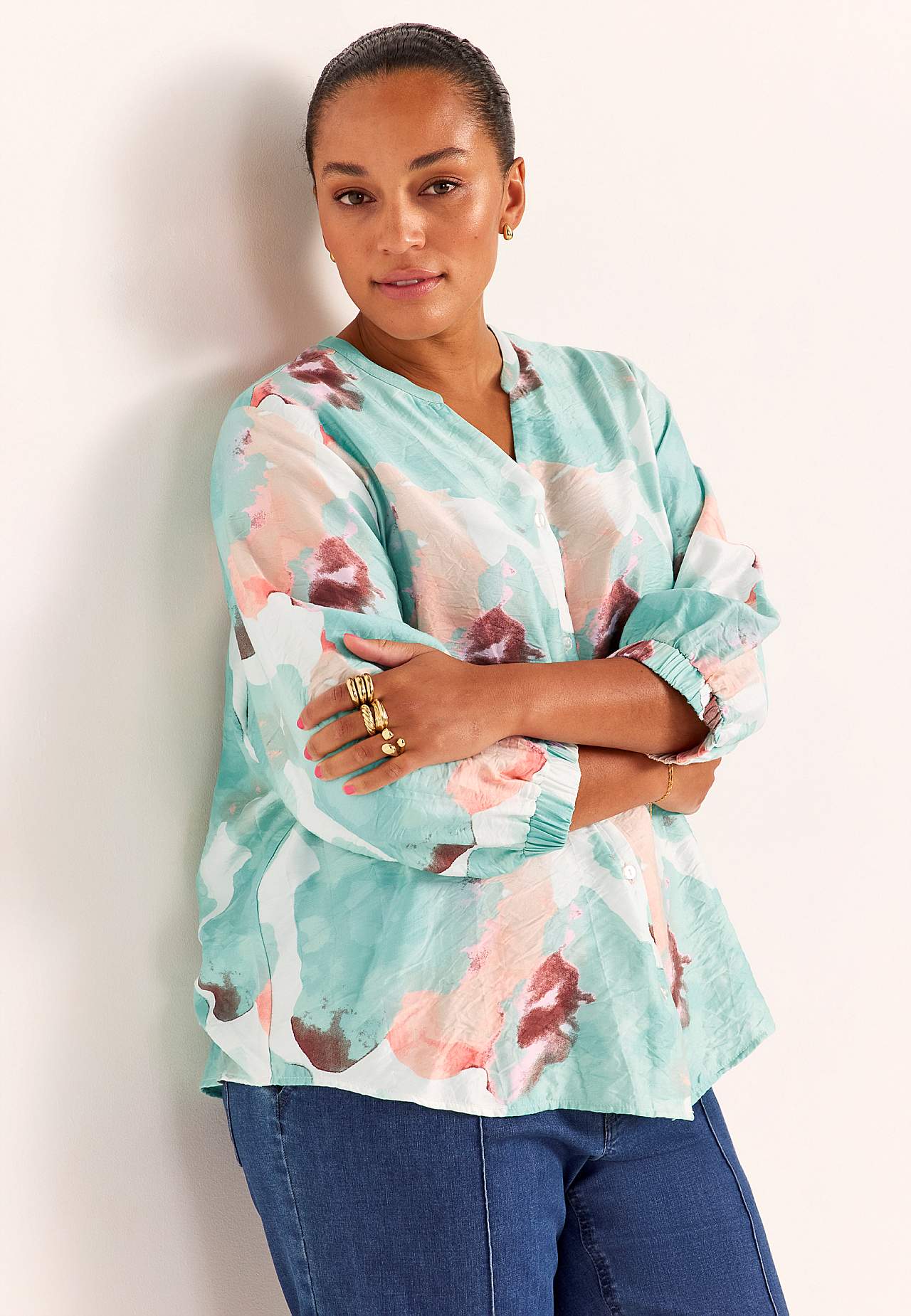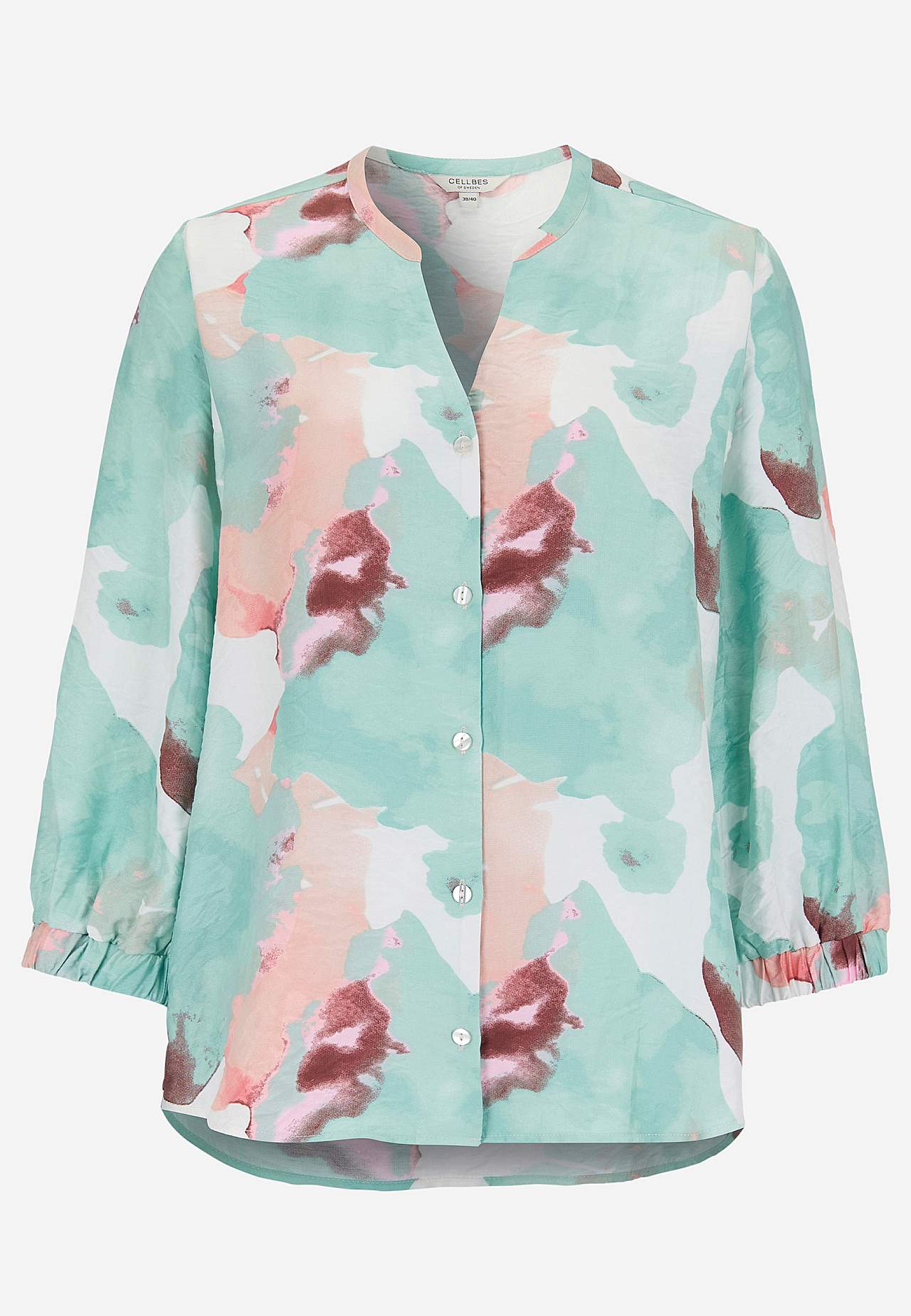 Bloes van viscose met licht glanzend getextureerd gevlochten stof. Mooie val en verkoelend gevoel. Regular pasvorm. Afgeronde nek met v-cut aan de voorkant. Sluitknoop met vijf mooie knoppen. Lichtjes afgeronde zoom. De lengte varieert afhankelijk van de maat: ongeveer 62-76 cm vanaf de schouder.