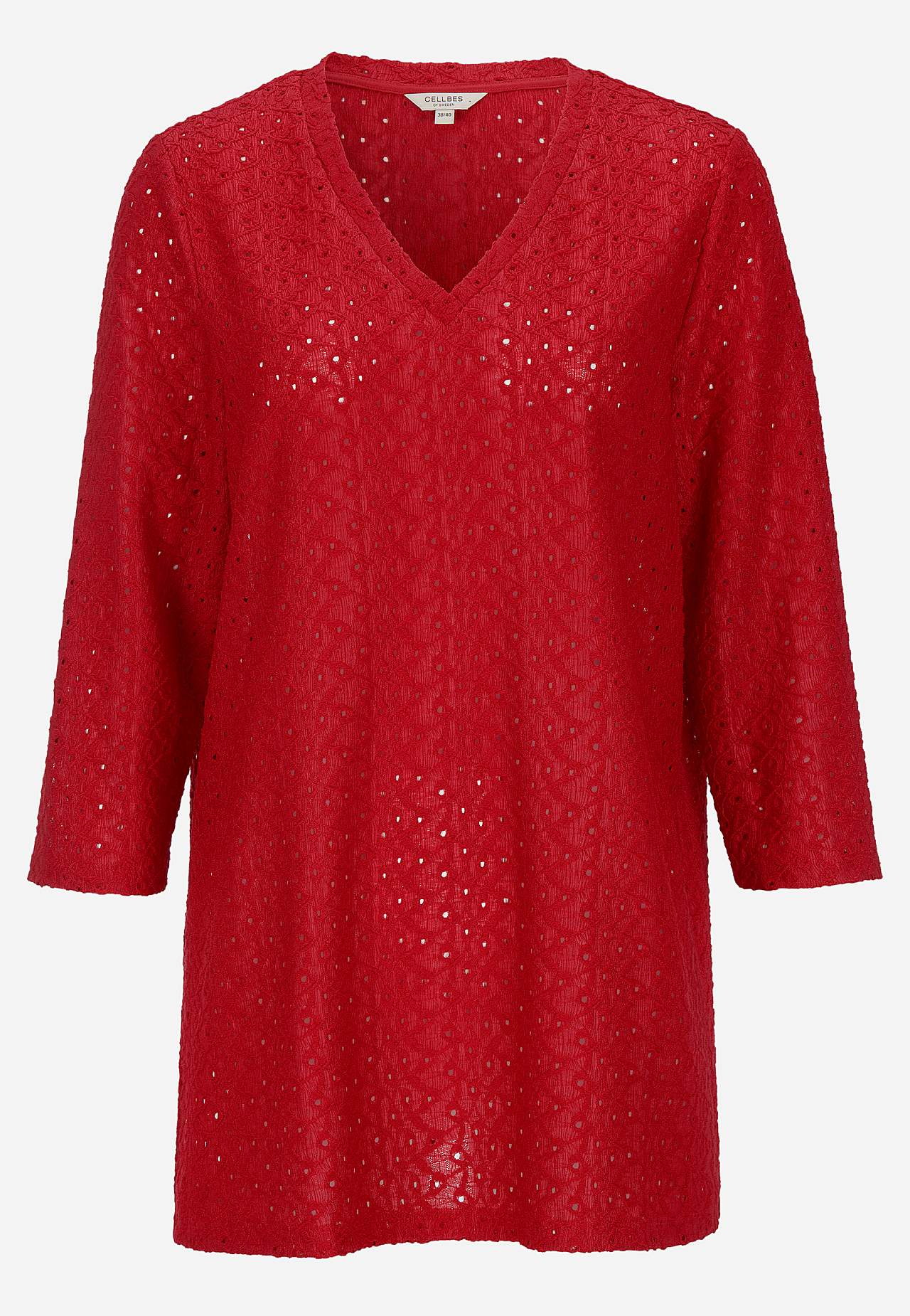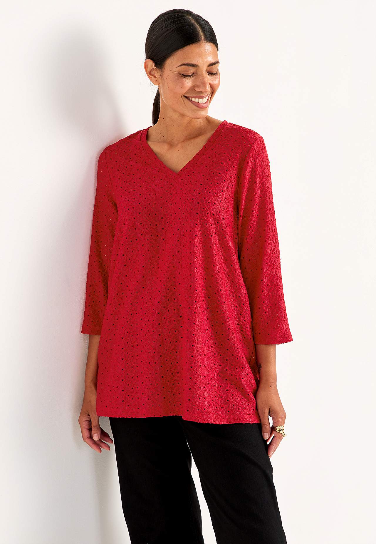 Jersey-topje met mooi gatenpatroon. Lichtjes aangepast model. Nek met v-necksnit. 3/4 lengte en wijde mouwen. Lichtjes afgeronde zoom. De lengte varieert afhankelijk van de maat: ongeveer 74-86 cm vanaf de schouder.