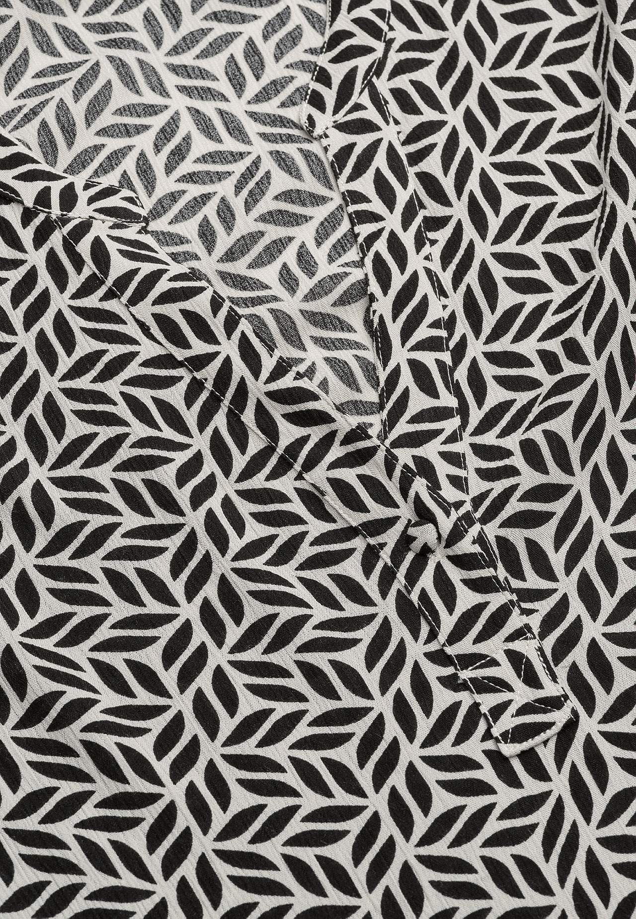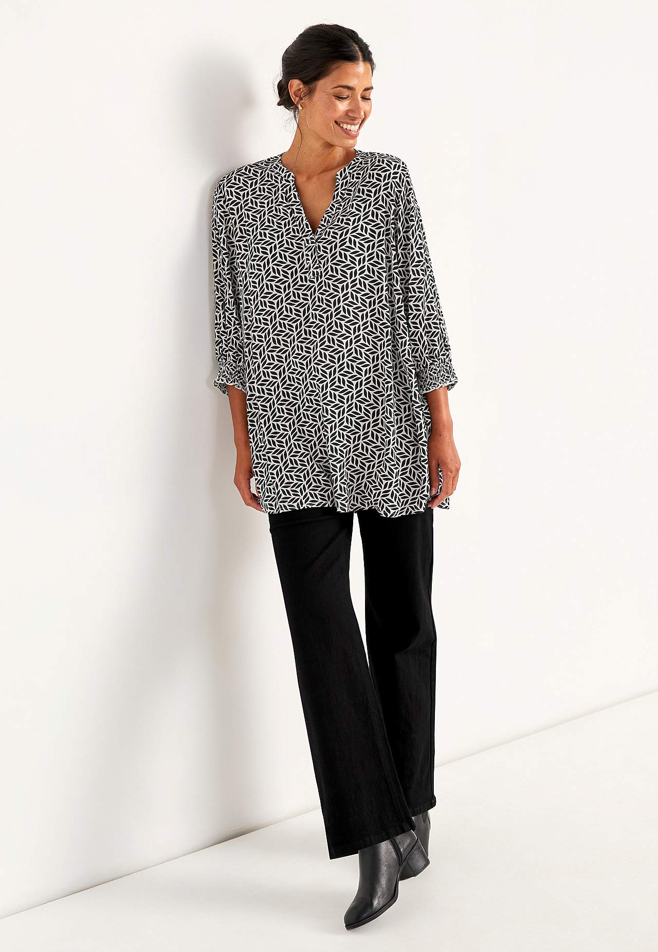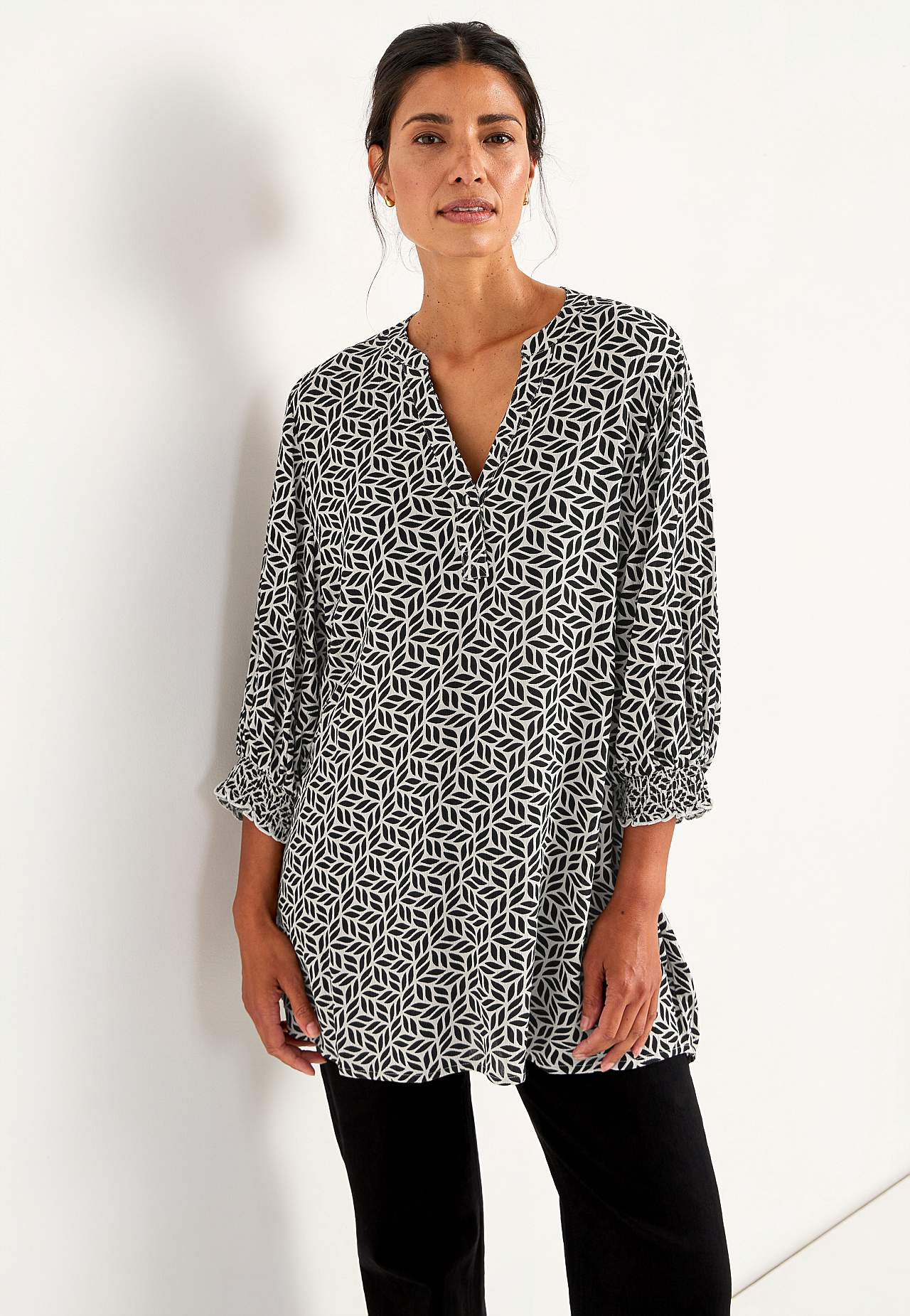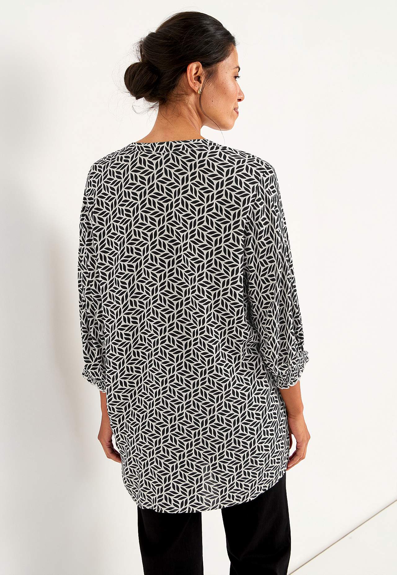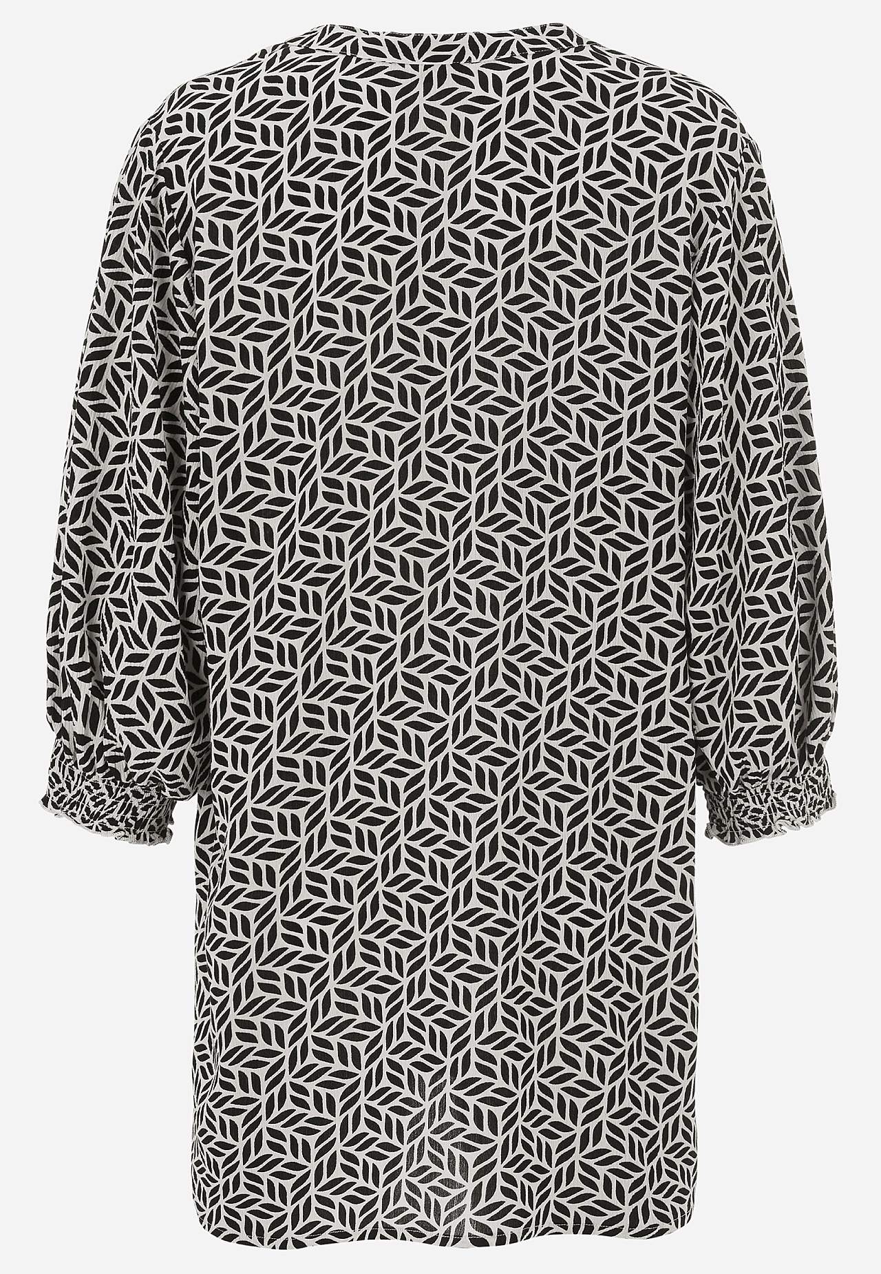 Gevlochten en van crèpe tuniek. Ruime pasvorm. 3/4 lengte mouwen met smokwerk aan de uiteinden van de mouwen. De lengte varieert afhankelijk van de maat: ongeveer 78-88 cm vanaf de schouder.
