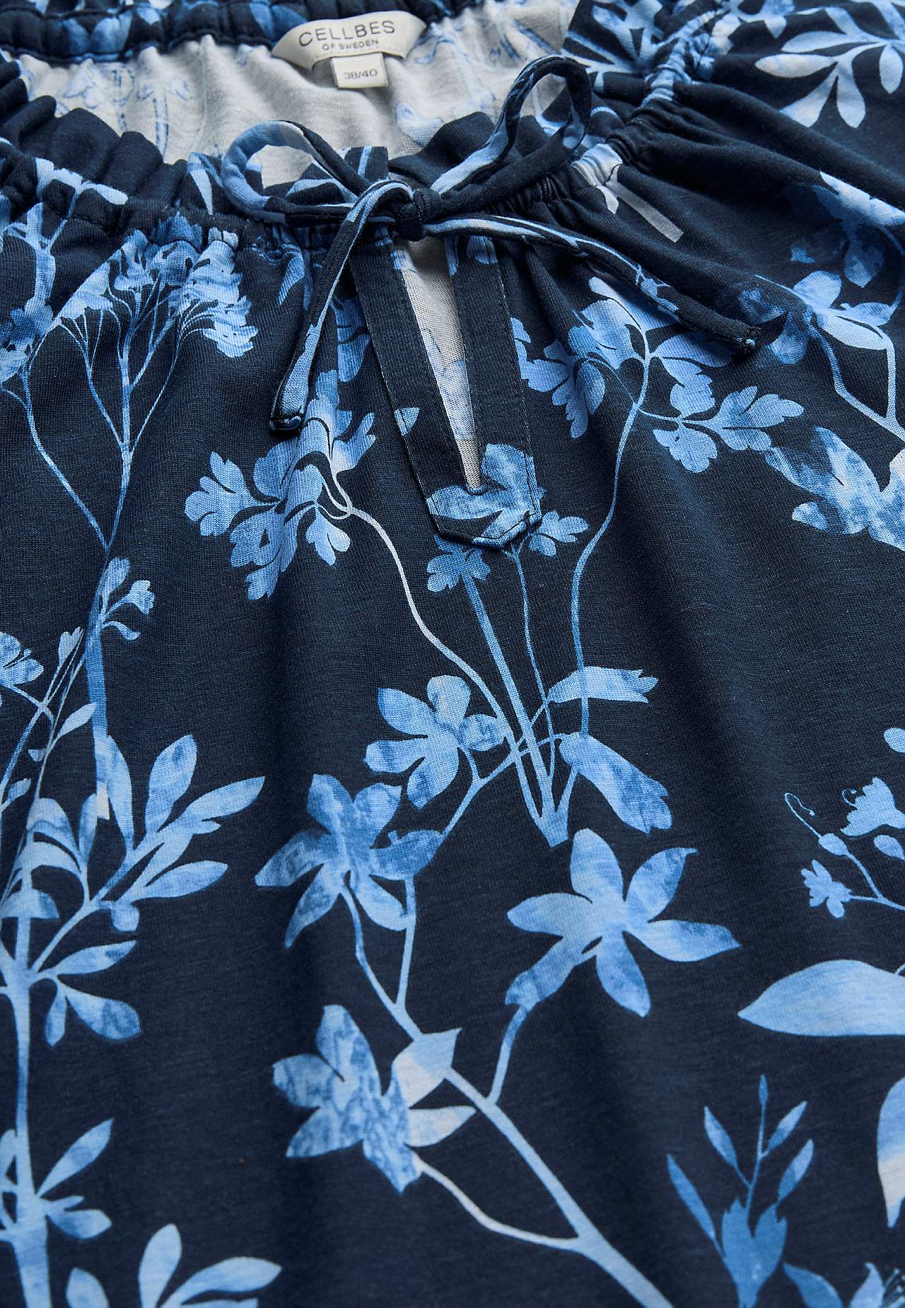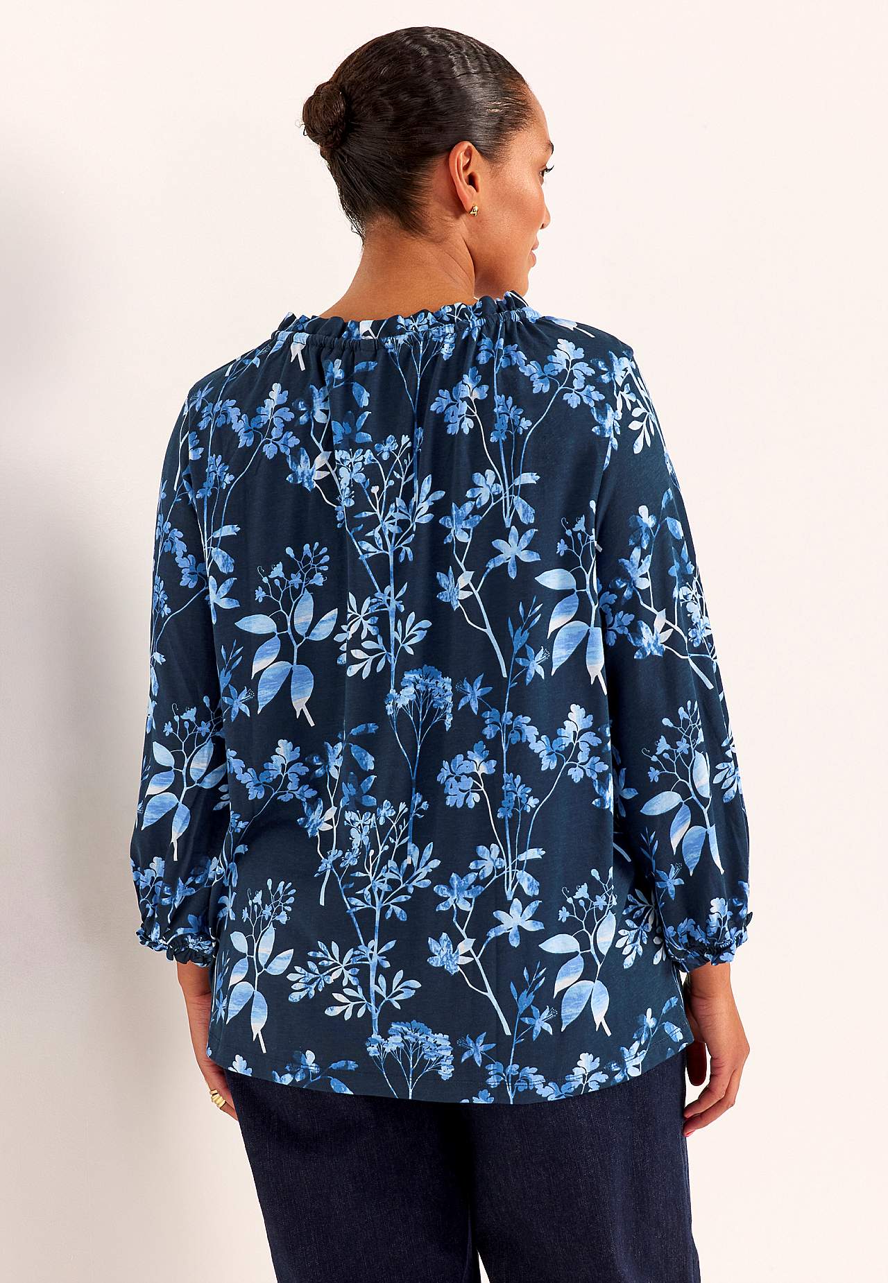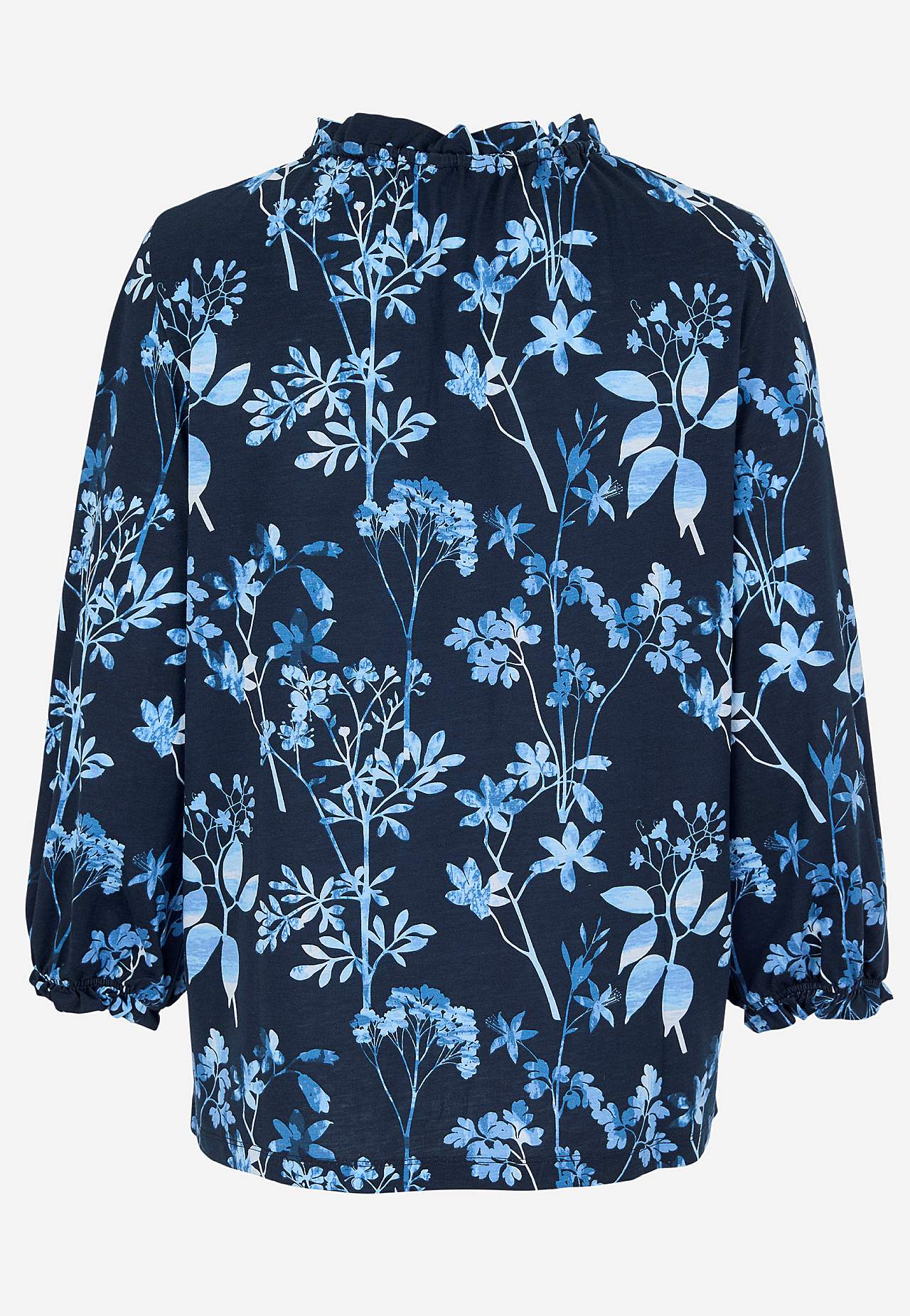 Vrouwelijke en losse pasvorm. Afgeronde nek met zelfbindend trekkoord en rand met ruches. 3/4 lengte en wijde mouwen met elastiek en smalle ruche bij de manchetten. De ruglengte varieert per maat: ca. 62-74 cm cm.
