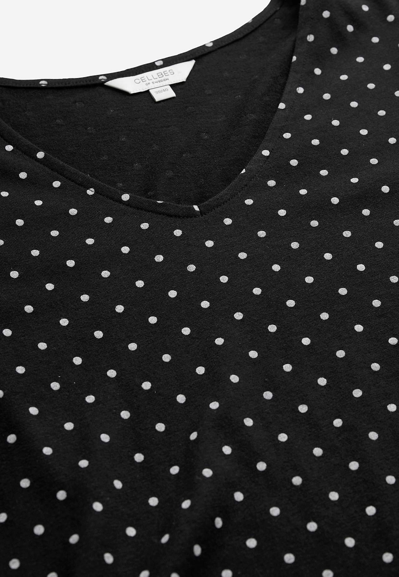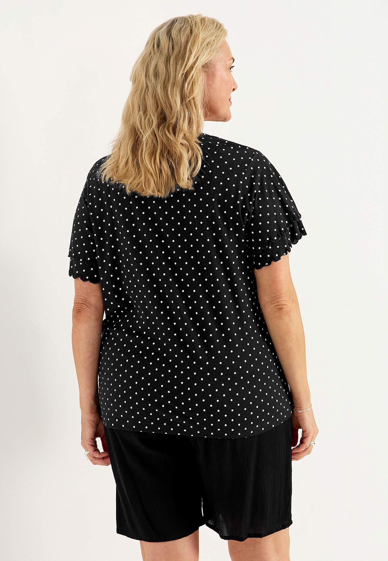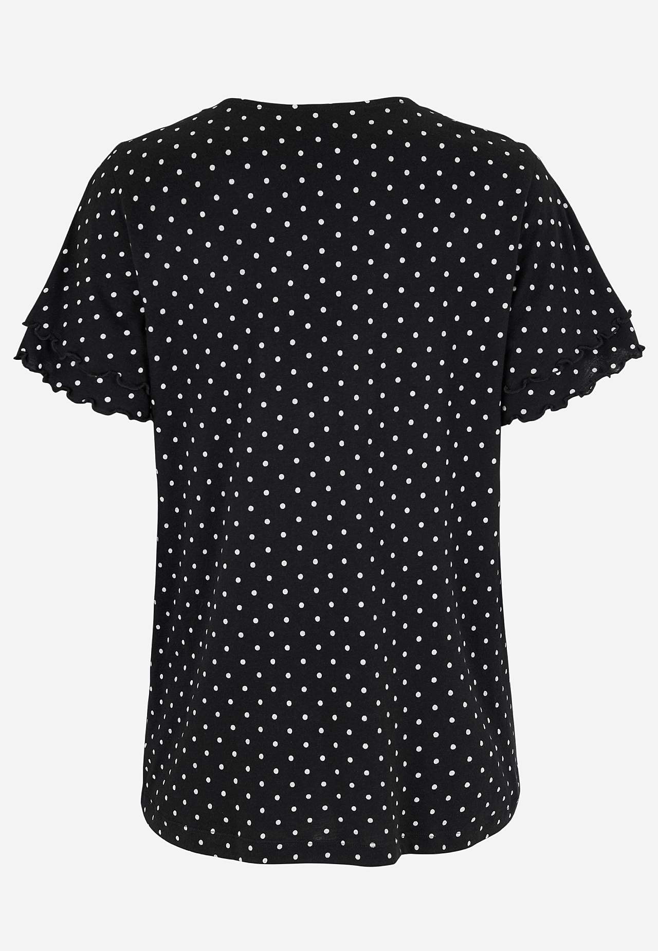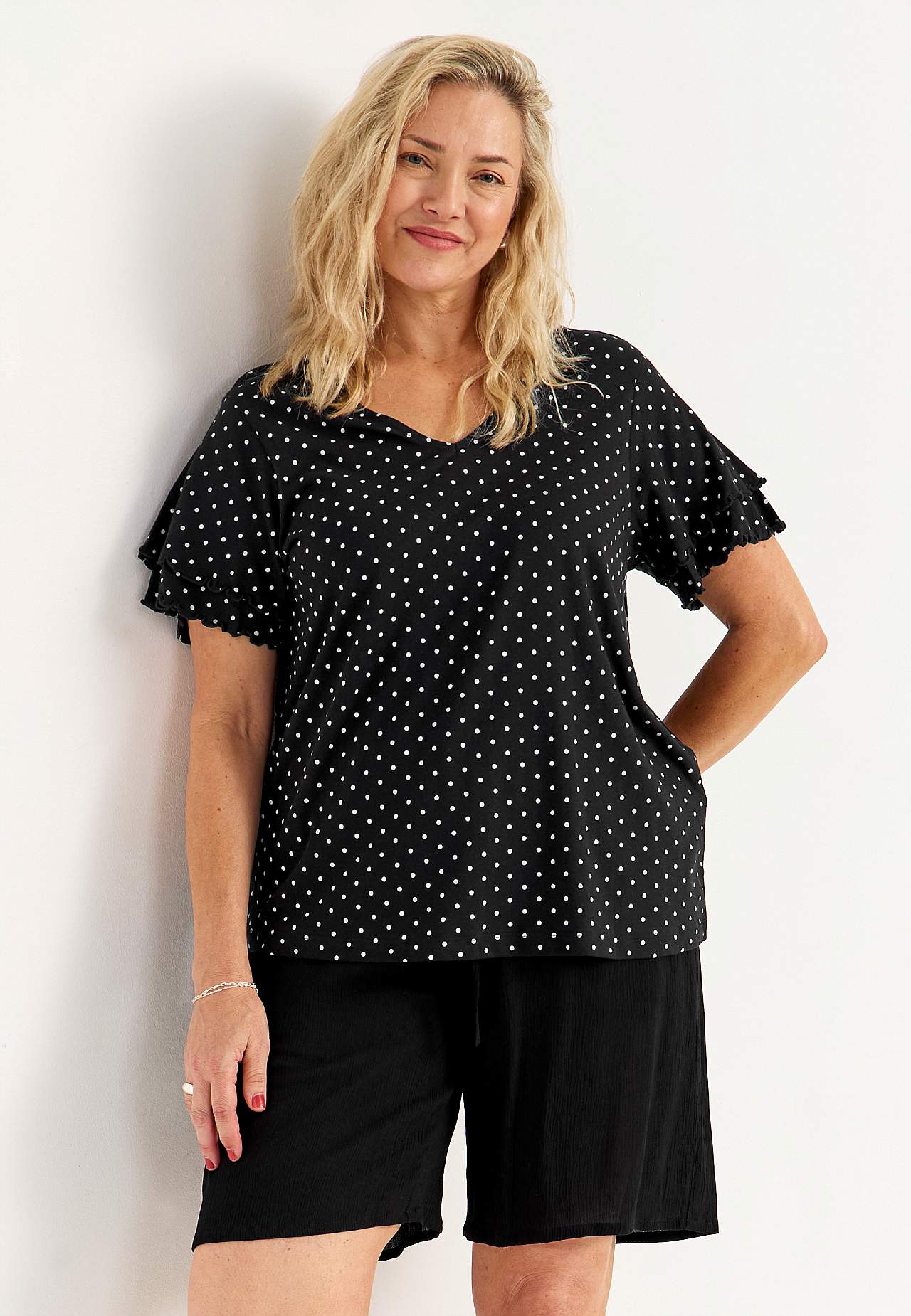 Topje met vrouwelijke vlinder mouwen. Zachte jersey van katoen-viscose mix. Licht a-lijnvormige pasvorm. Neklijn met een v-hals. Korte vlinder mouwen met dubbele laag en doorgestikte en decoratieve naaien. Lichtjes afgeronde zoom. De ruglengte varieert per maat: ca. 65-73 cm.