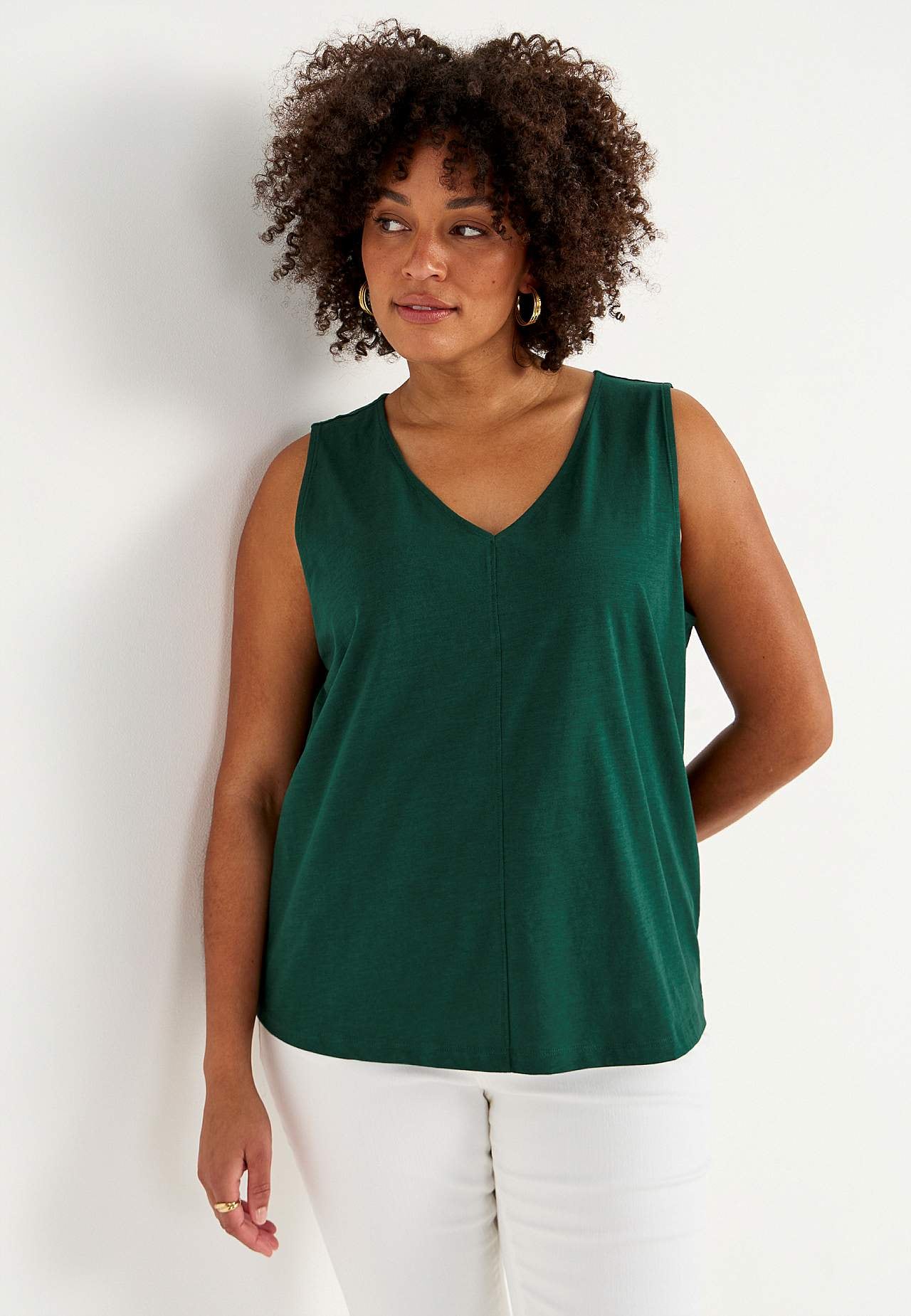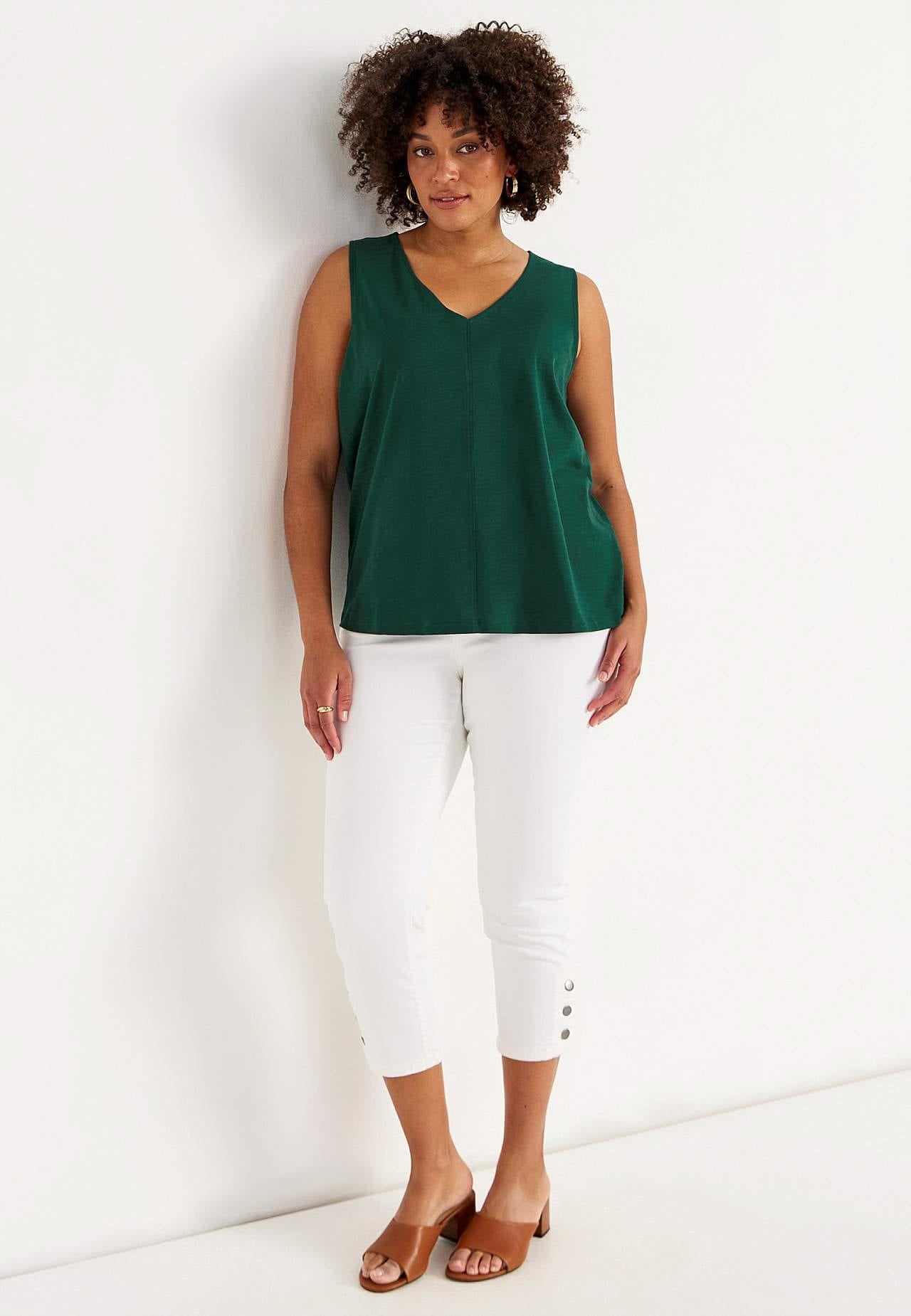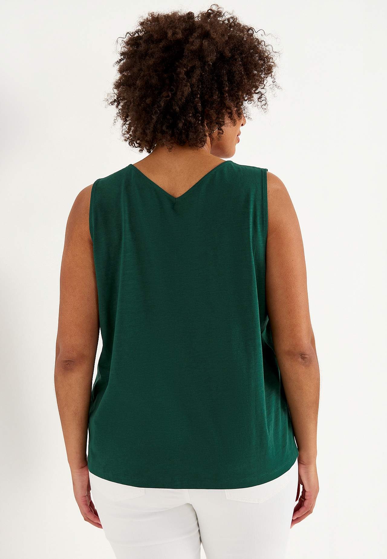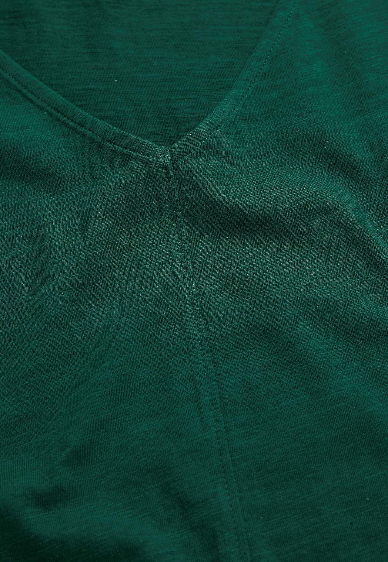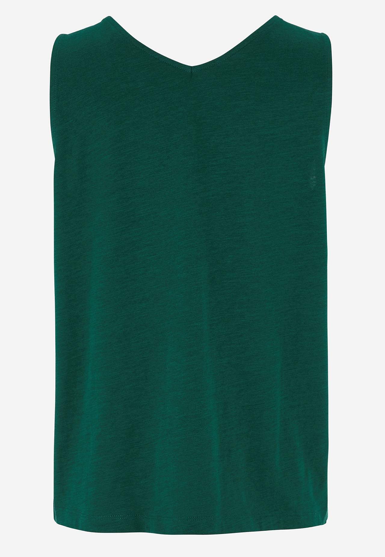 Luchtige slubkwaliteit met lichte structuur. Licht a-lijnvormige pasvorm. V-halslijn zowel aan de voor- als achterkant. Decoratieve steek middenvoor. De ruglengte varieert per maat: ca. 60-72 cm.