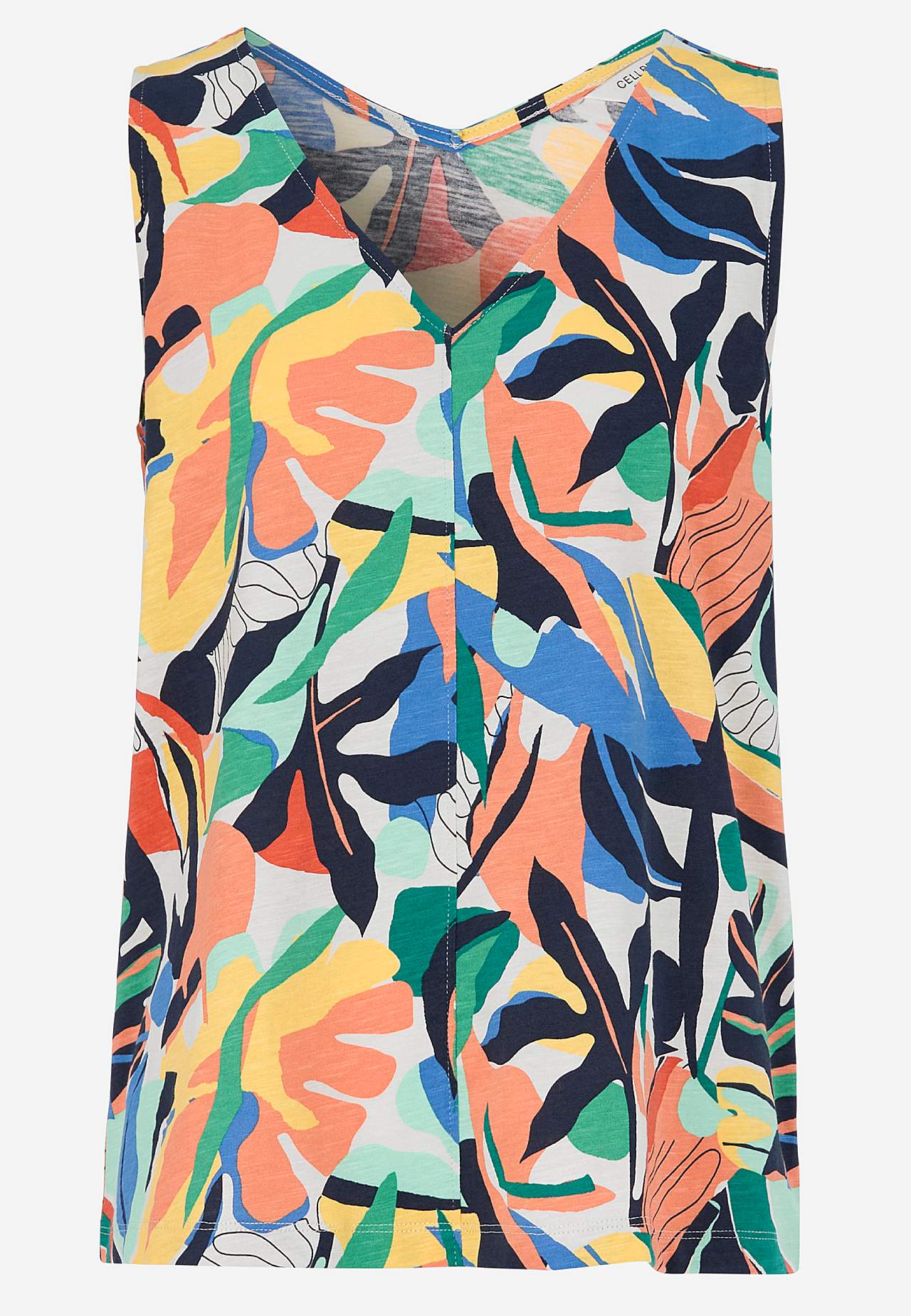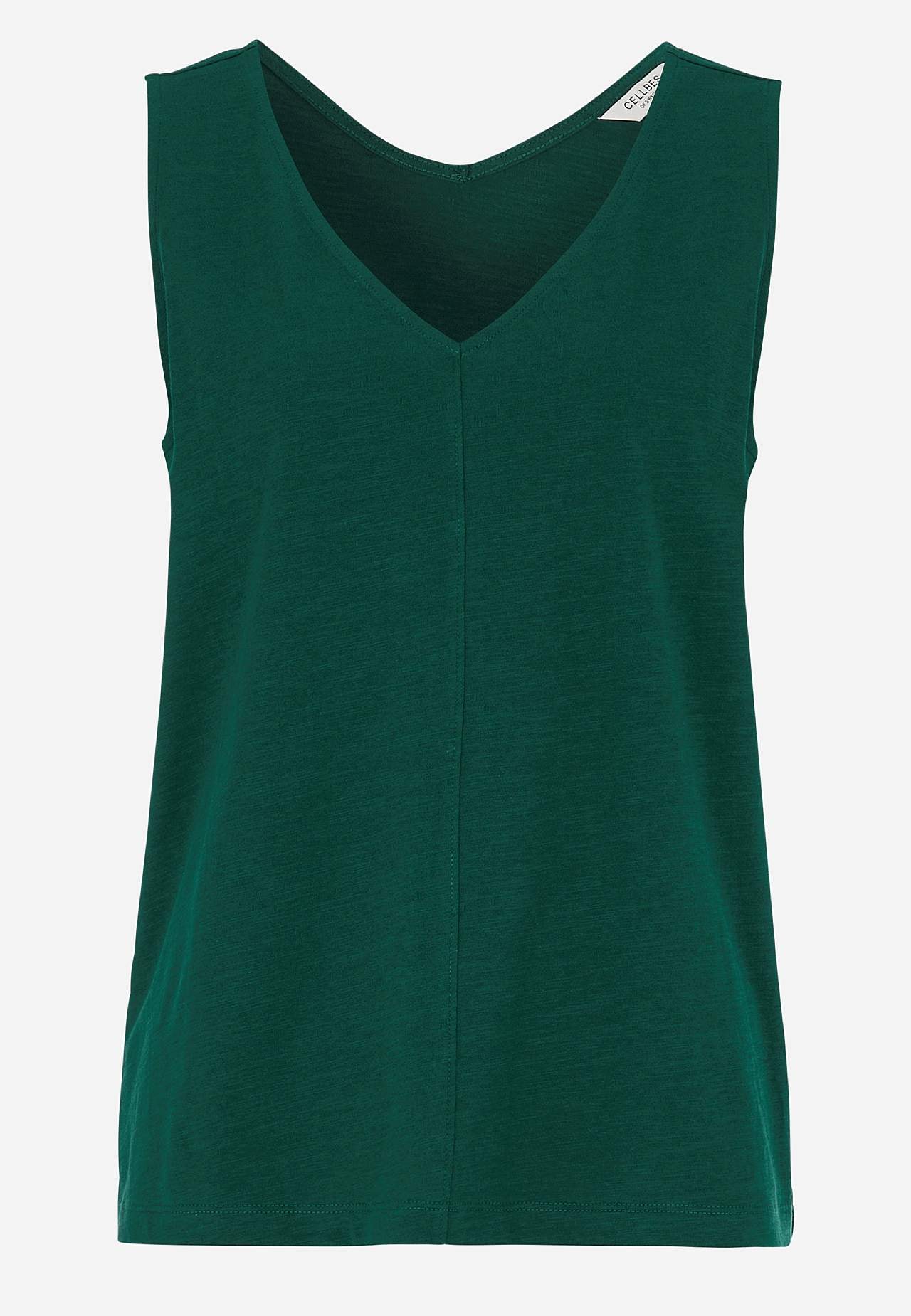 Luchtige slubkwaliteit met lichte structuur. Licht a-lijnvormige pasvorm. V-halslijn zowel aan de voor- als achterkant. Decoratieve steek middenvoor. De ruglengte varieert per maat: ca. 60-72 cm.