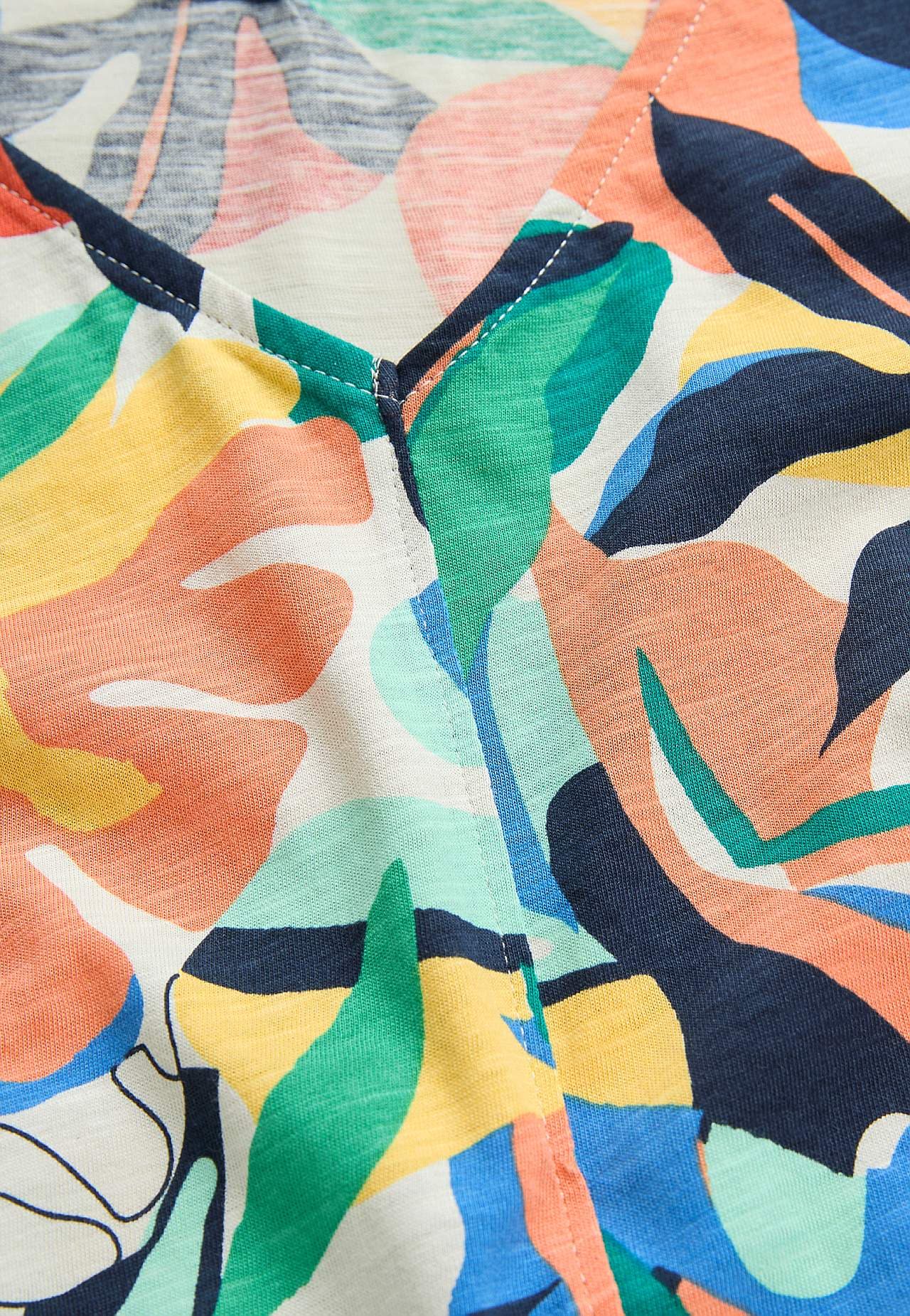 Luchtige slubkwaliteit met lichte structuur. Licht a-lijnvormige pasvorm. V-halslijn zowel aan de voor- als achterkant. Decoratieve steek middenvoor. De ruglengte varieert per maat: ca. 60-72 cm.