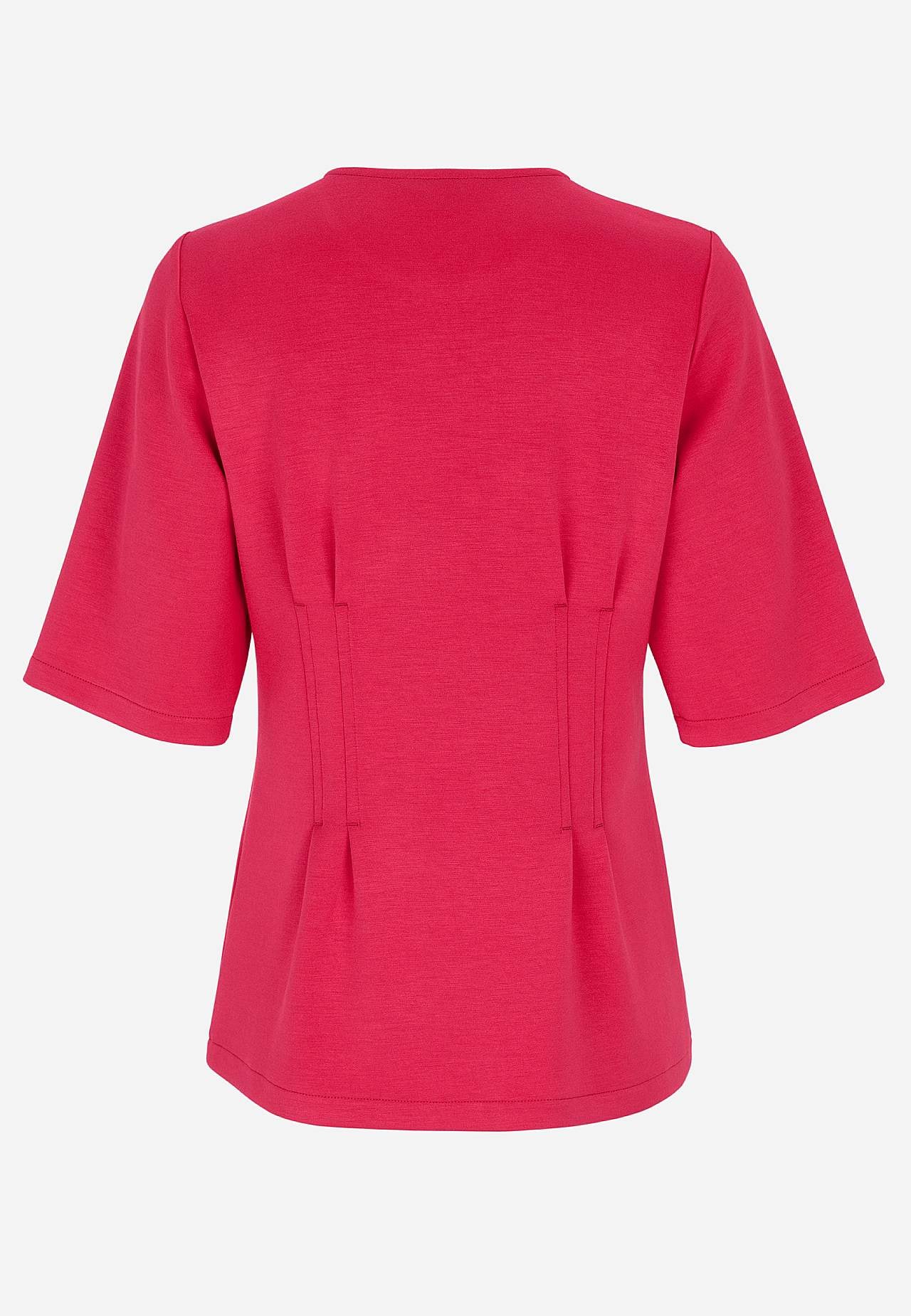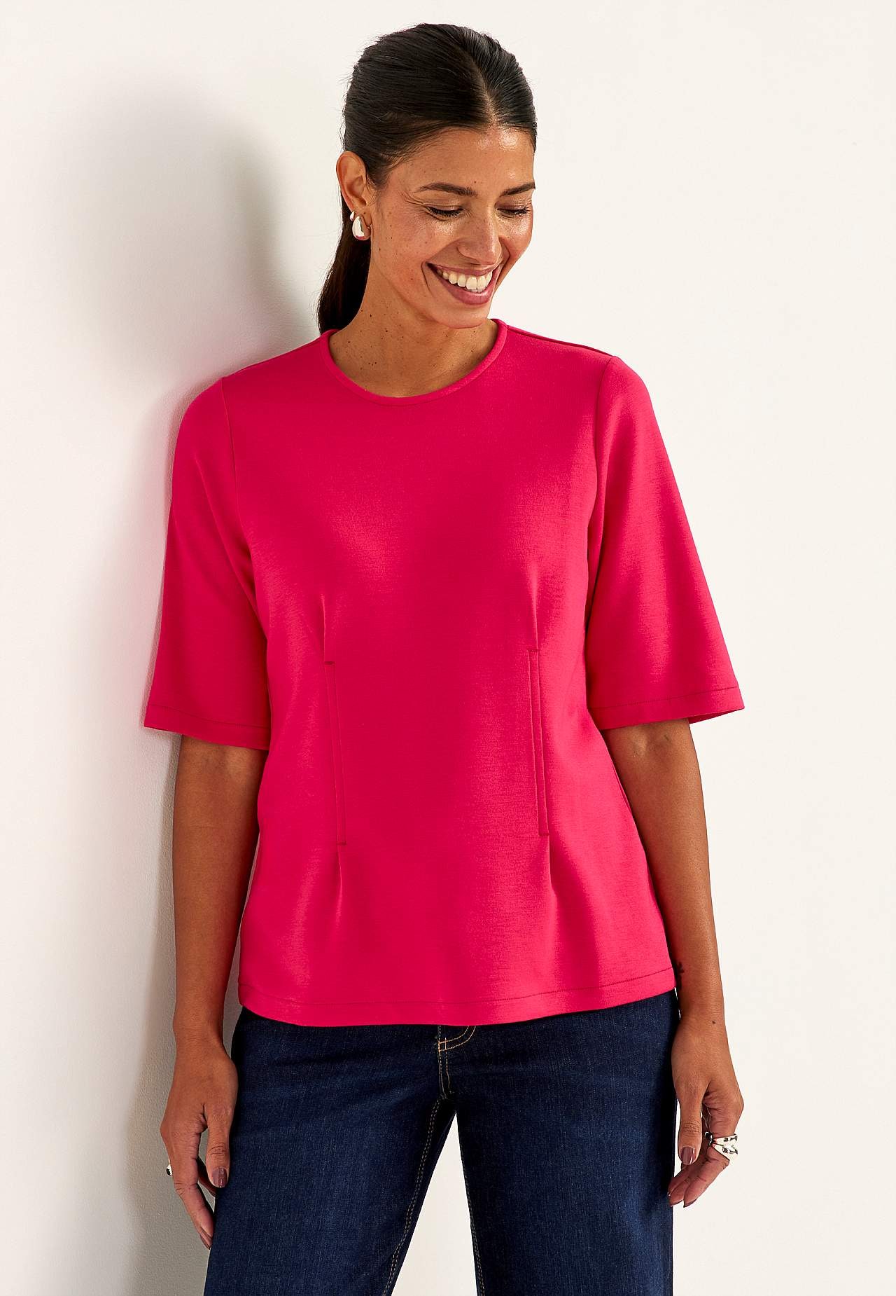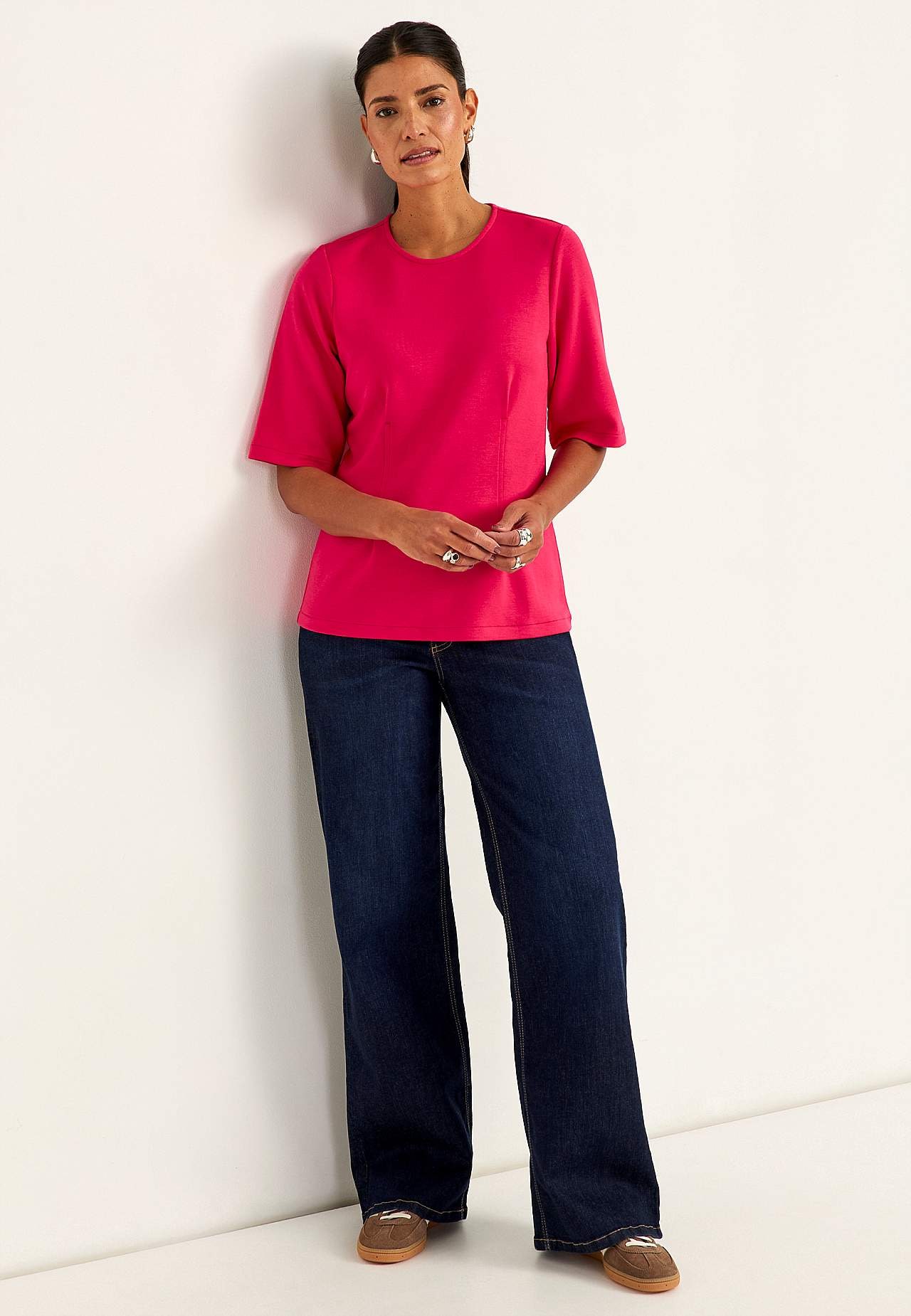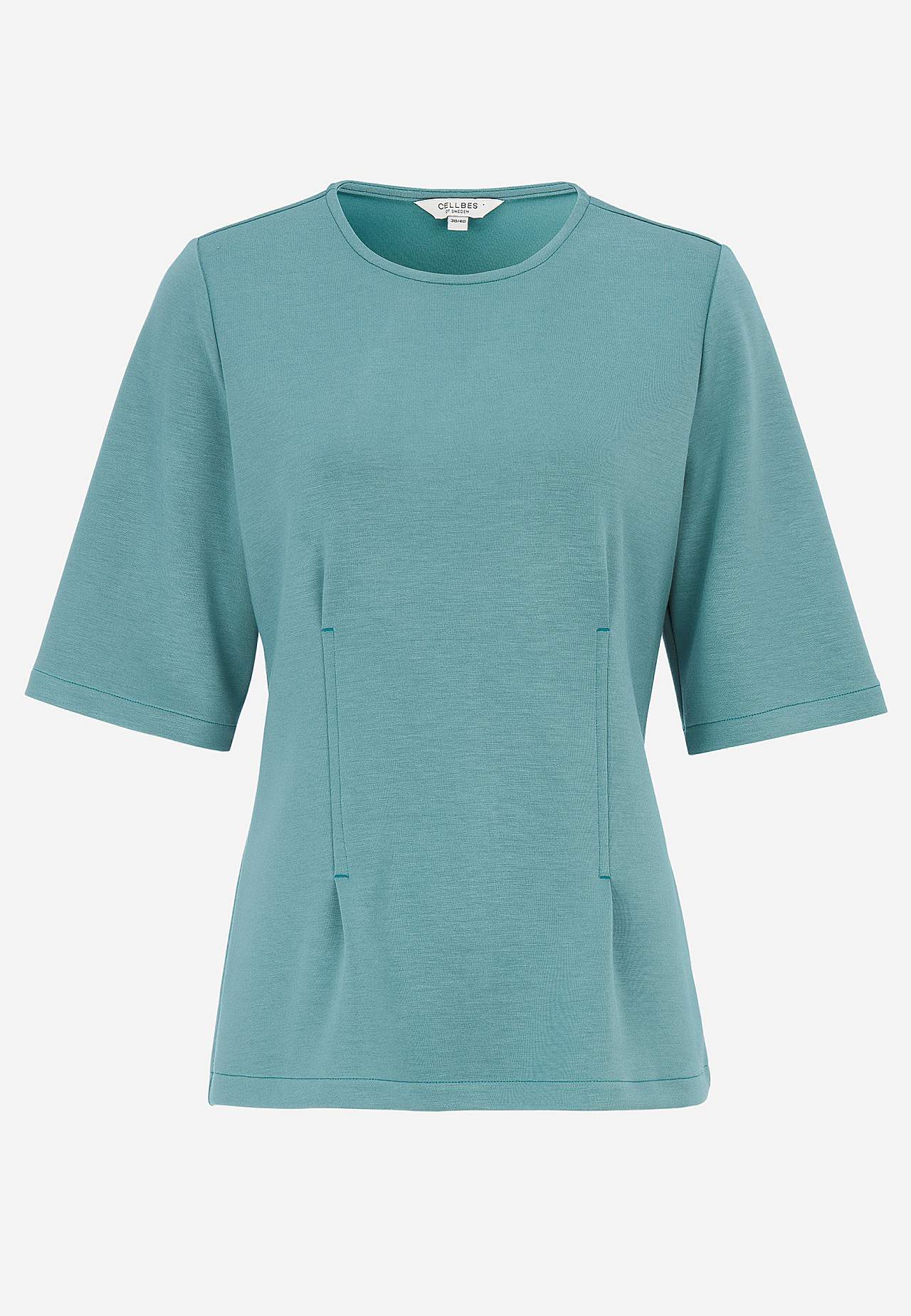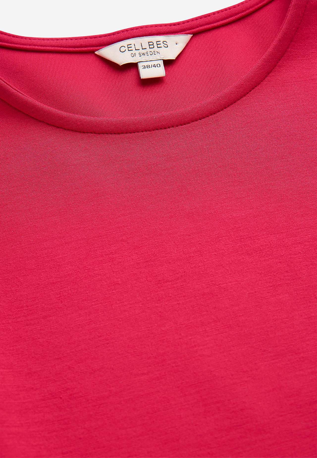 Zijdezacht topje van iets zwaardere modal-mix. Regular pasvorm met flaterende coupenaad zowel aan de voor- als achterkant. Ronde halslijn. Wijde en ellebooglengte mouwen. Rechte zoom. De lengte varieert afhankelijk van de maat: ongeveer 62-77 cm vanaf de schouder.