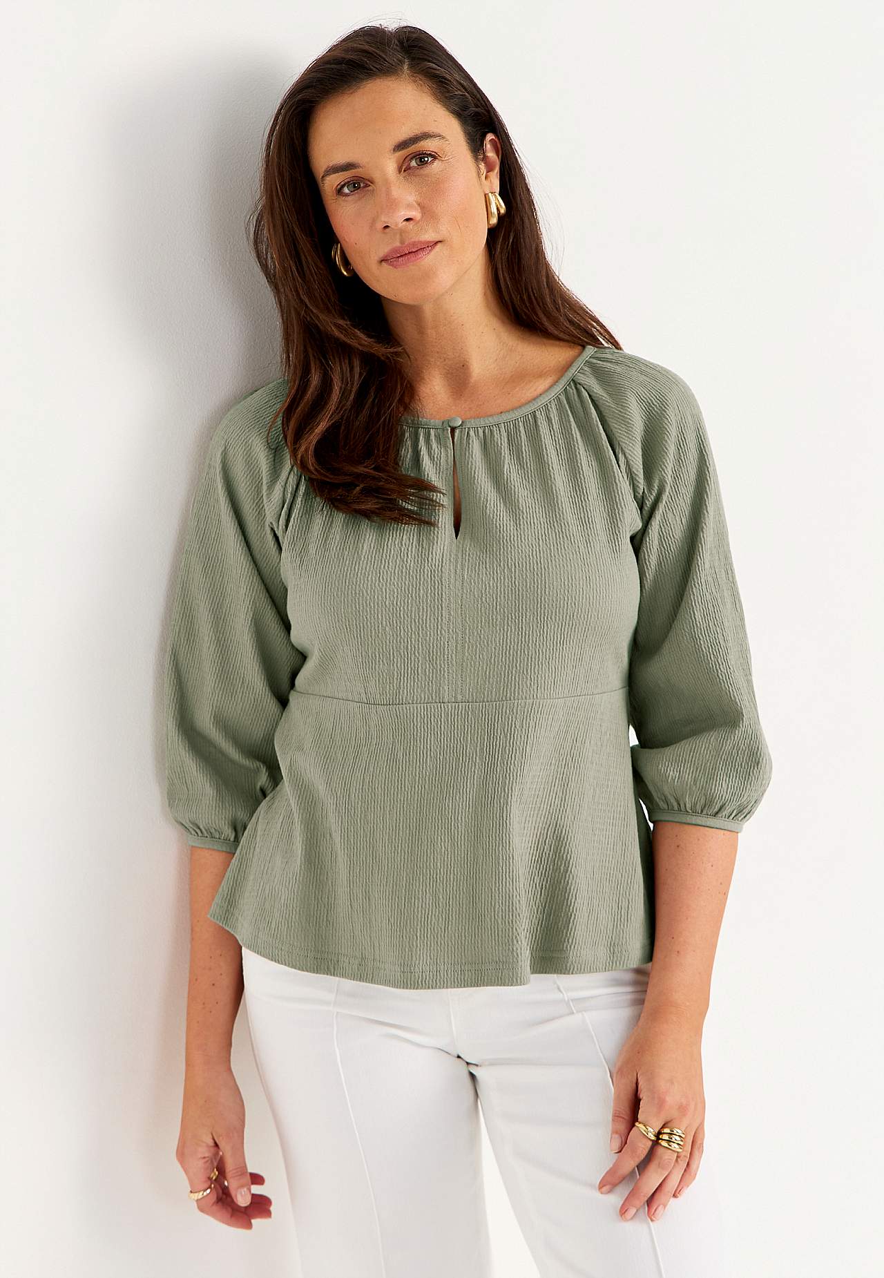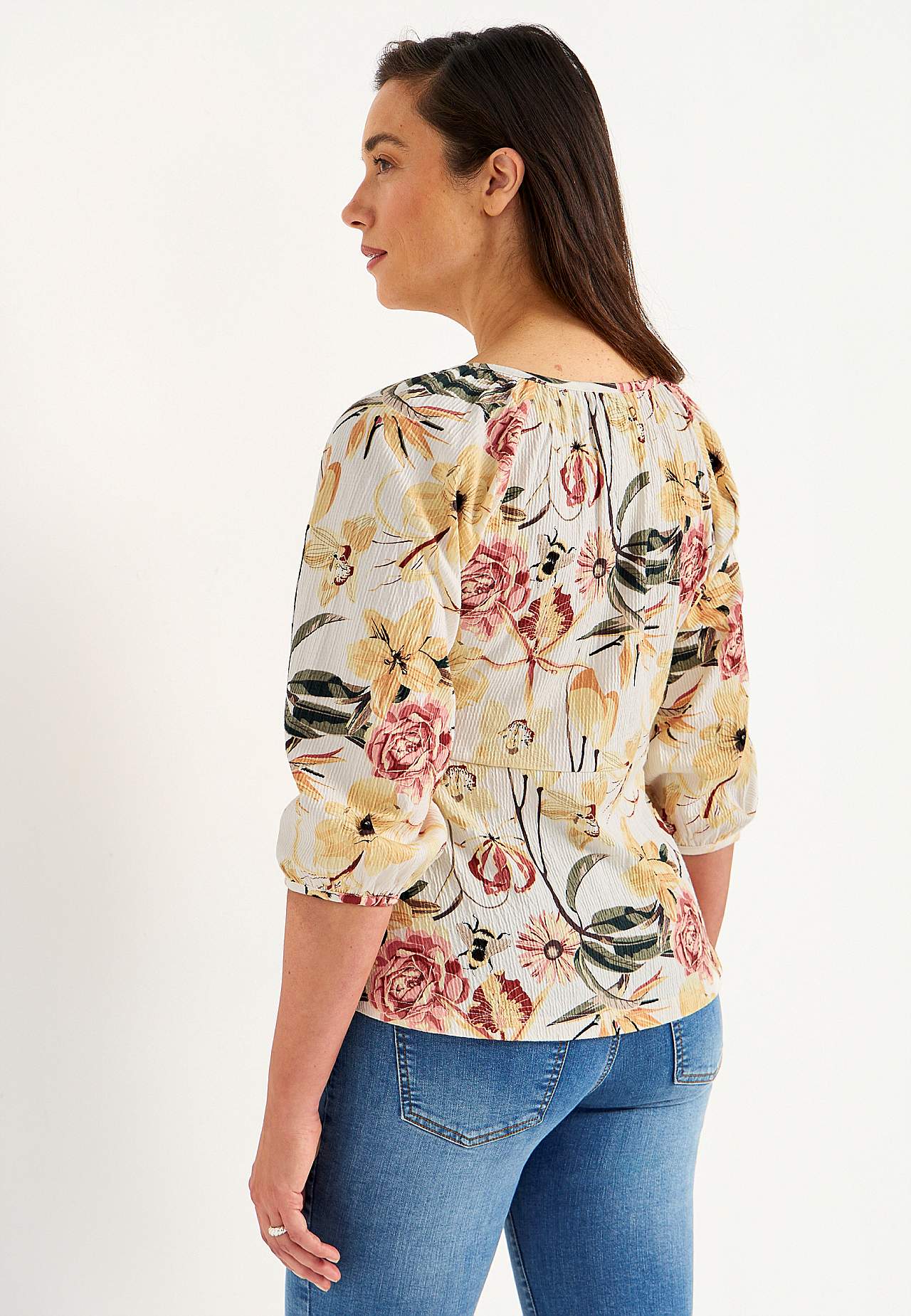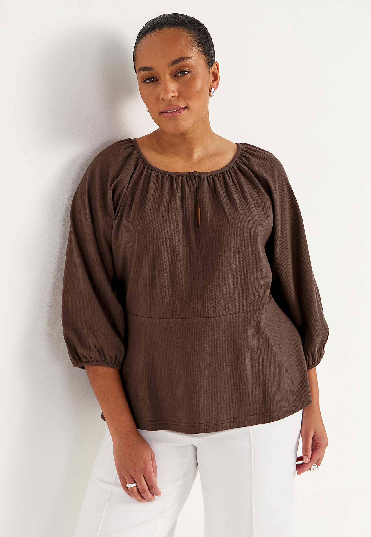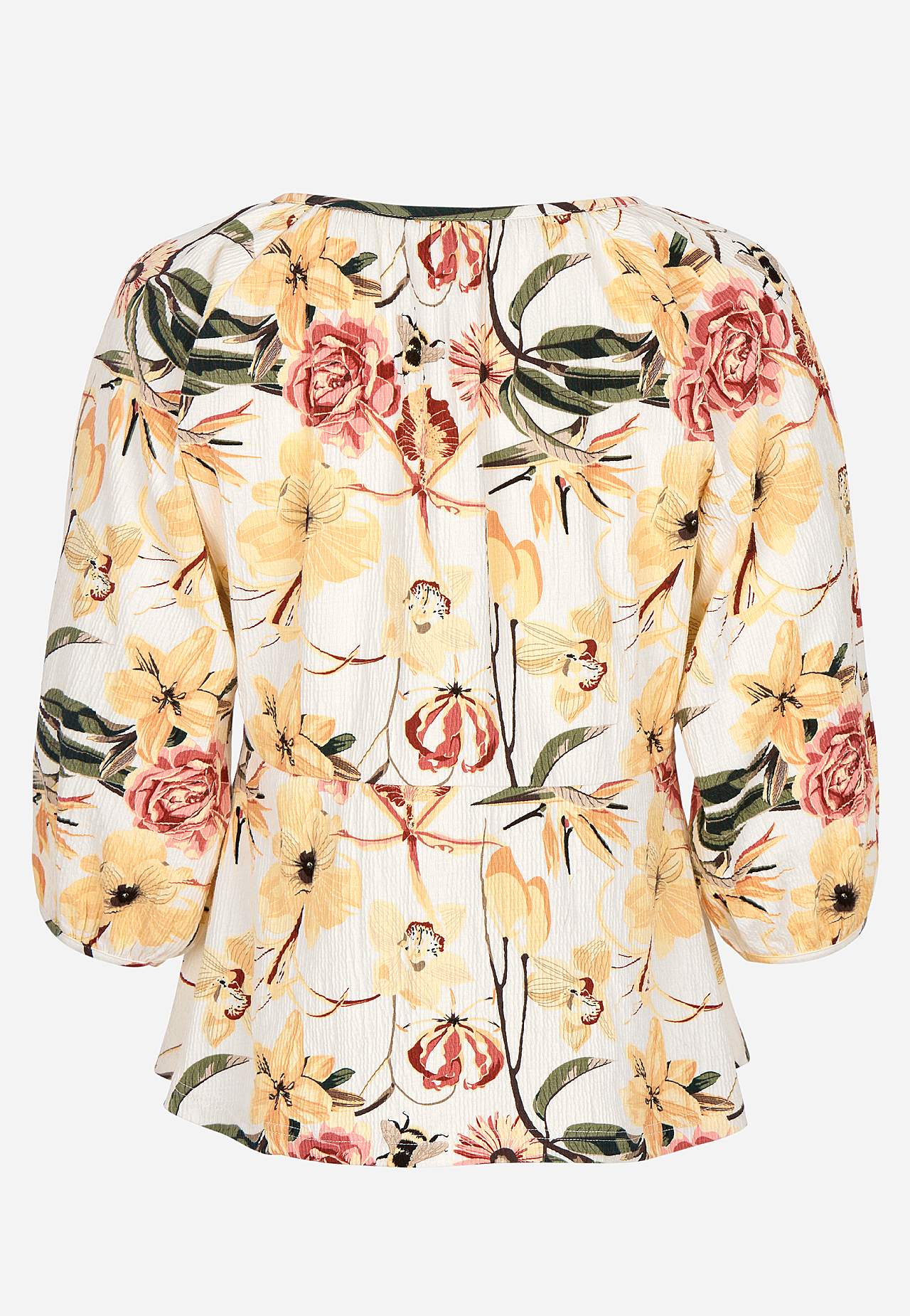 Elastisch en zacht topje met golvende structuur en peplum-ontwerp. Nauwsluitende pasvorm aan de bovenkant met bepaalde taille en flared onderkant. Afgeronde nek met smalle en bedekte knop en spleet. 3/4 lengte en wijde raglanmouwen met verborgen elastiek bij de manchetten. Afgeronde zoom. De ruglengte varieert per maat: ca.... Meer lezen