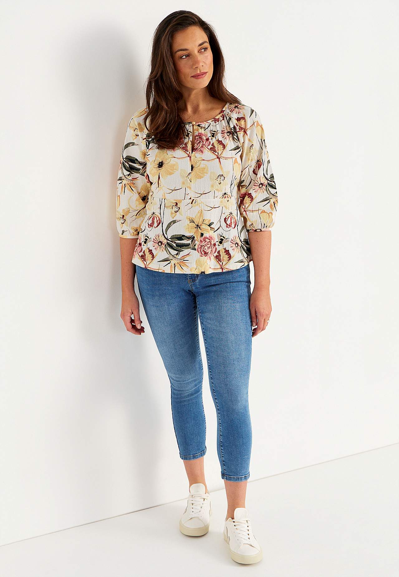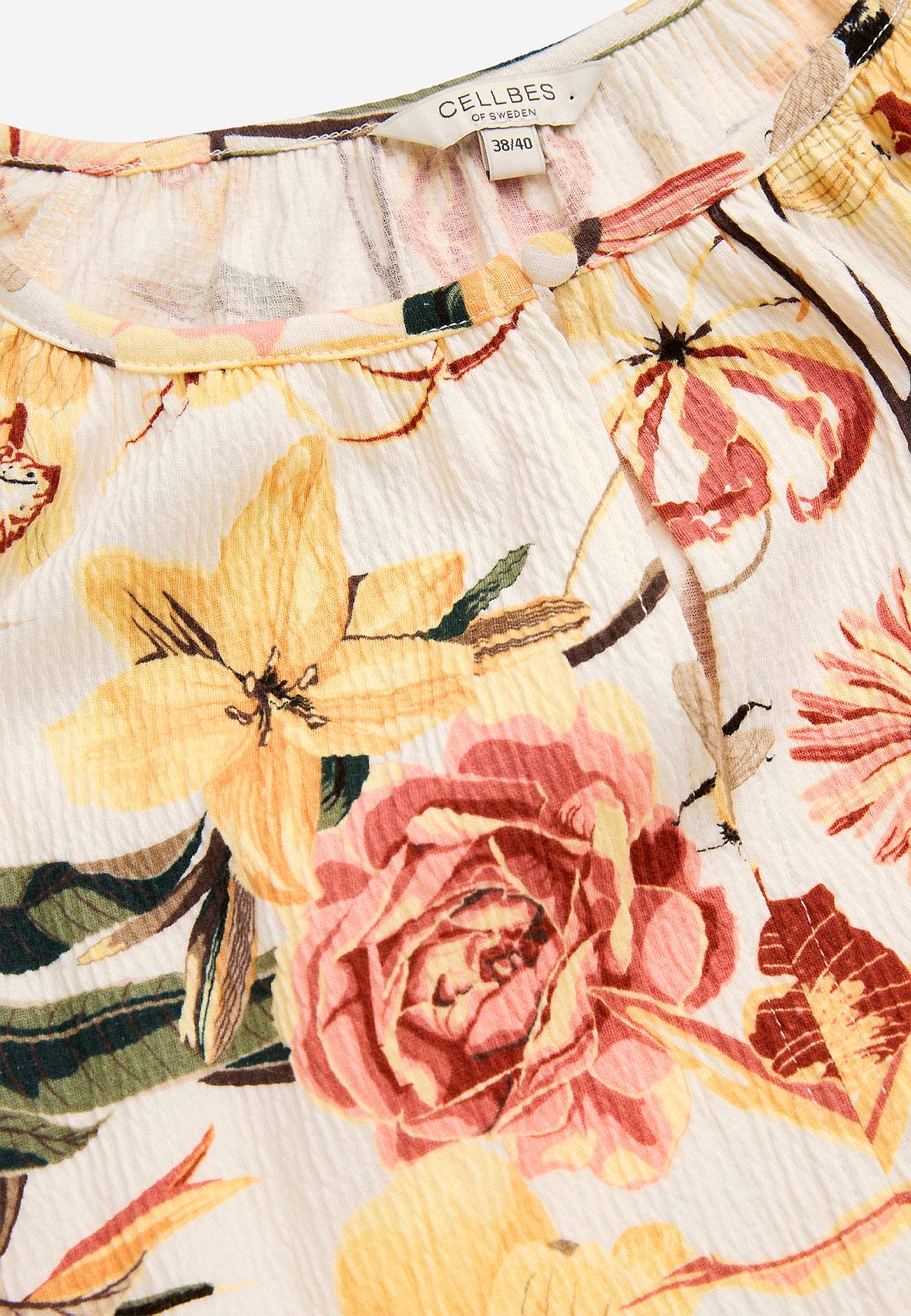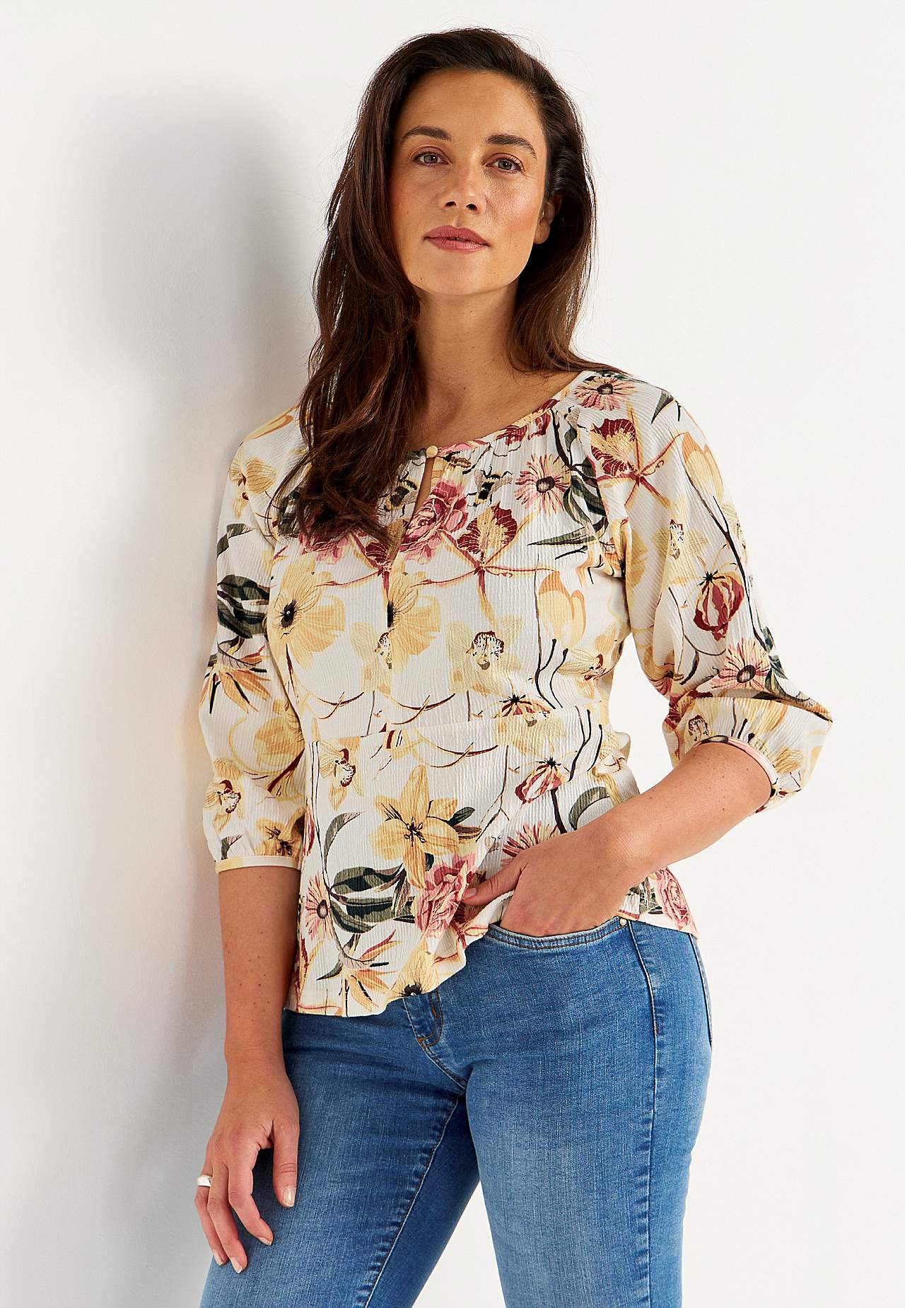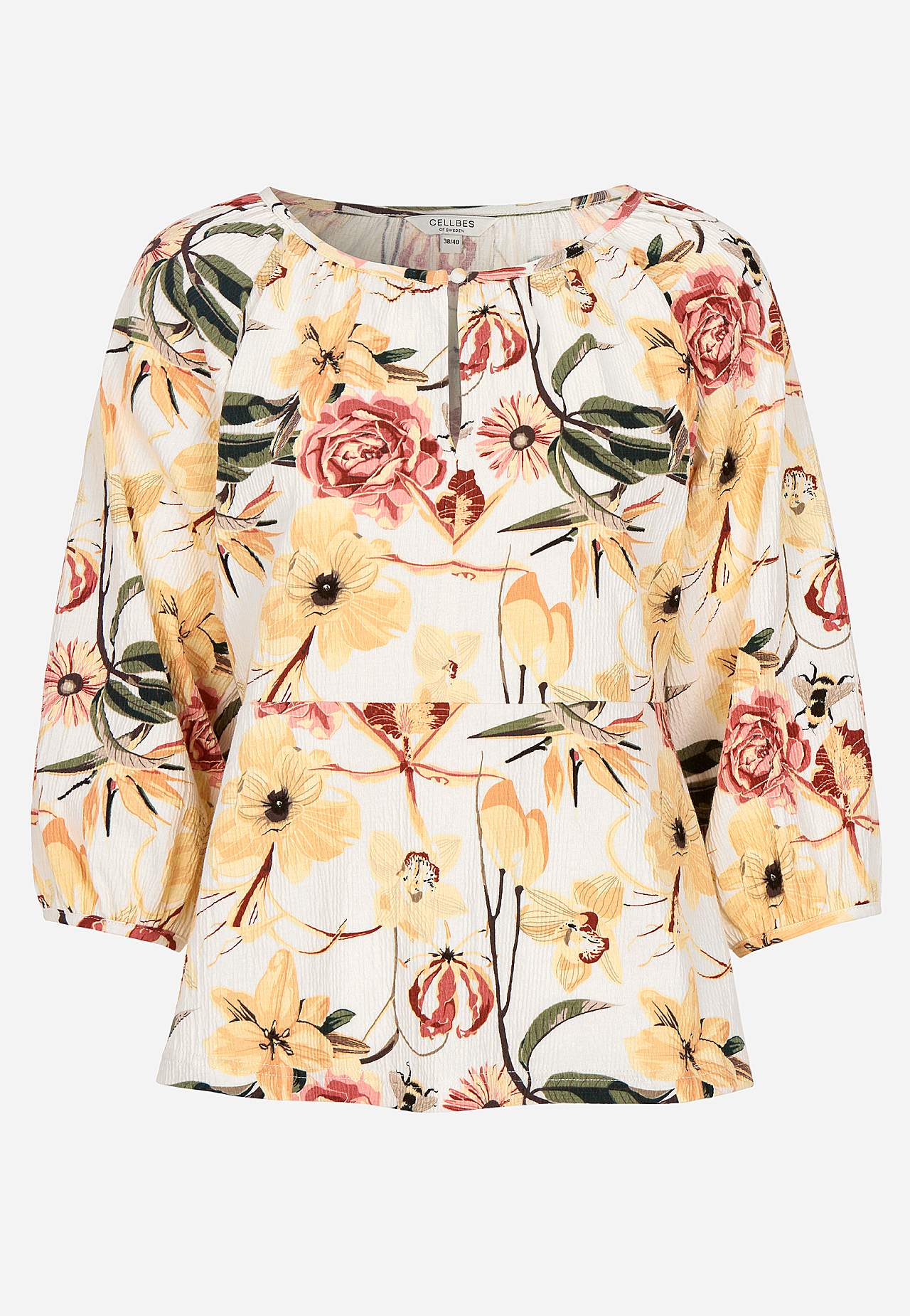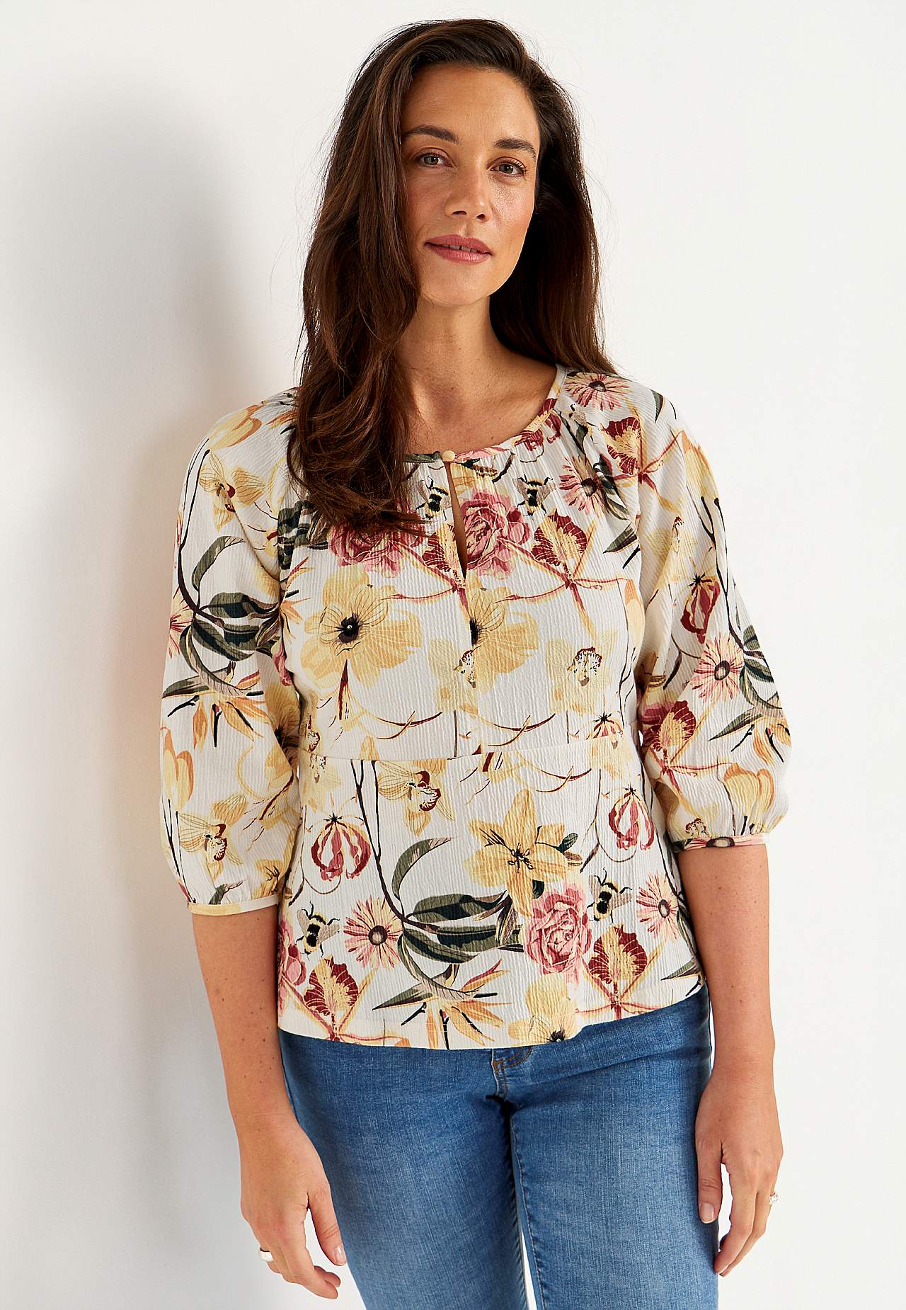 Elastisch en zacht topje met golvende structuur en peplum-ontwerp. Nauwsluitende pasvorm aan de bovenkant met bepaalde taille en flared onderkant. Afgeronde nek met smalle en bedekte knop en spleet. 3/4 lengte en wijde raglanmouwen met verborgen elastiek bij de manchetten. Afgeronde zoom. De ruglengte varieert per maat: ca.... Meer lezen