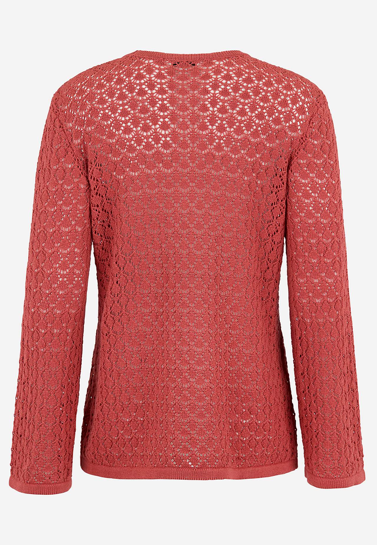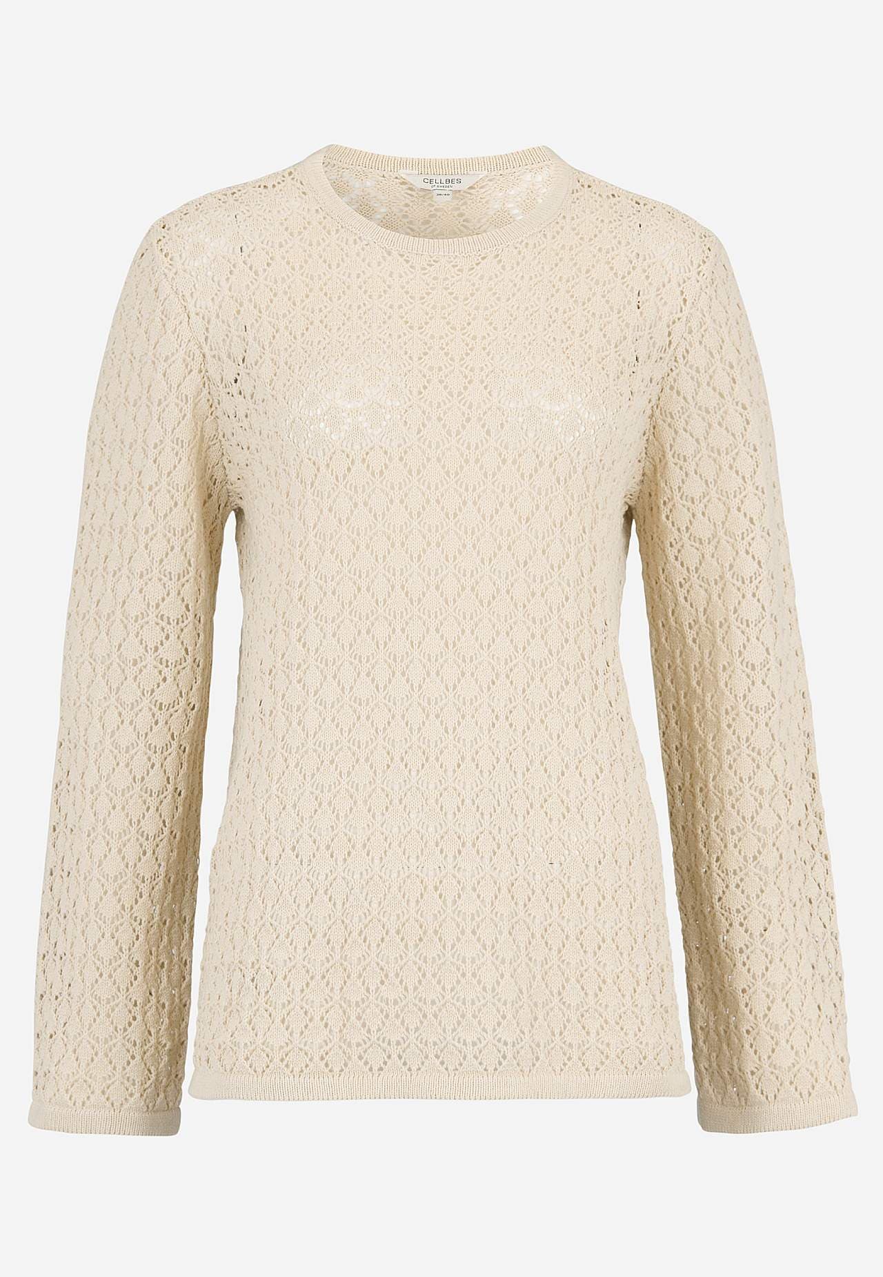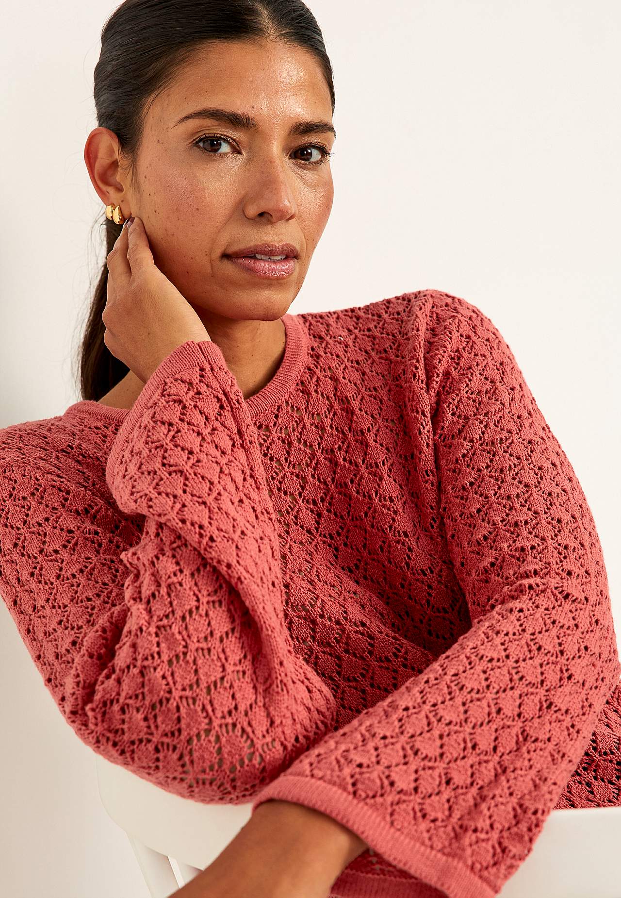 Zachte en luchtige sweater met kantachtig fijn gebreide. Een aangename mix van katoen en gerecycled polyester. Leuk om over een topje of tanktop te dragen. Rechte pasvorm. Ronde halslijn met geribbelde afwerking. Lange mouwen met zachtjes afgefakkelde mouwuiteinden met ribgebreide rand. De lengte varieert afhankelijk van de... Meer lezen