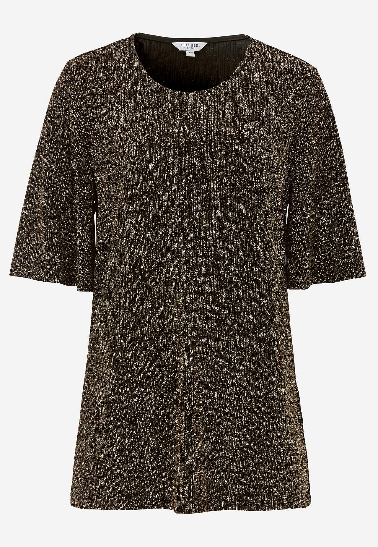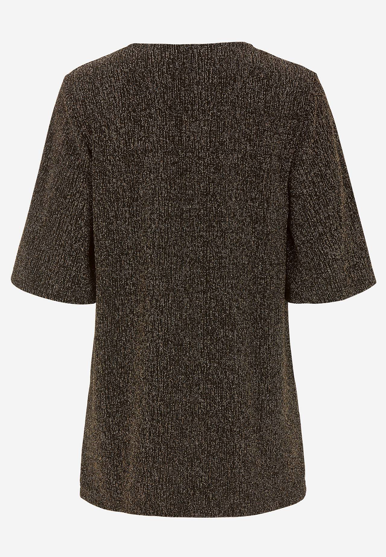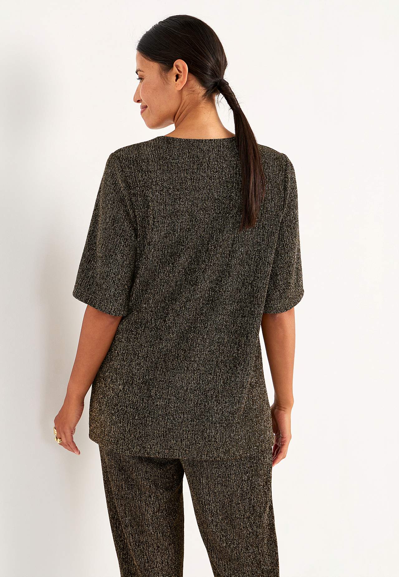 Glanzende jersey tuniek perfect voor de feestelijkheden. A-gevormde pasvorm. Zacht en elastisch materiaal met glitterdraden. Ronde halslijn. 3/4 lengte raglanmouwen met aardige breedte. Licht afgeronde zoom. De lengte varieert met de maat: ongeveer 71-88 cm.