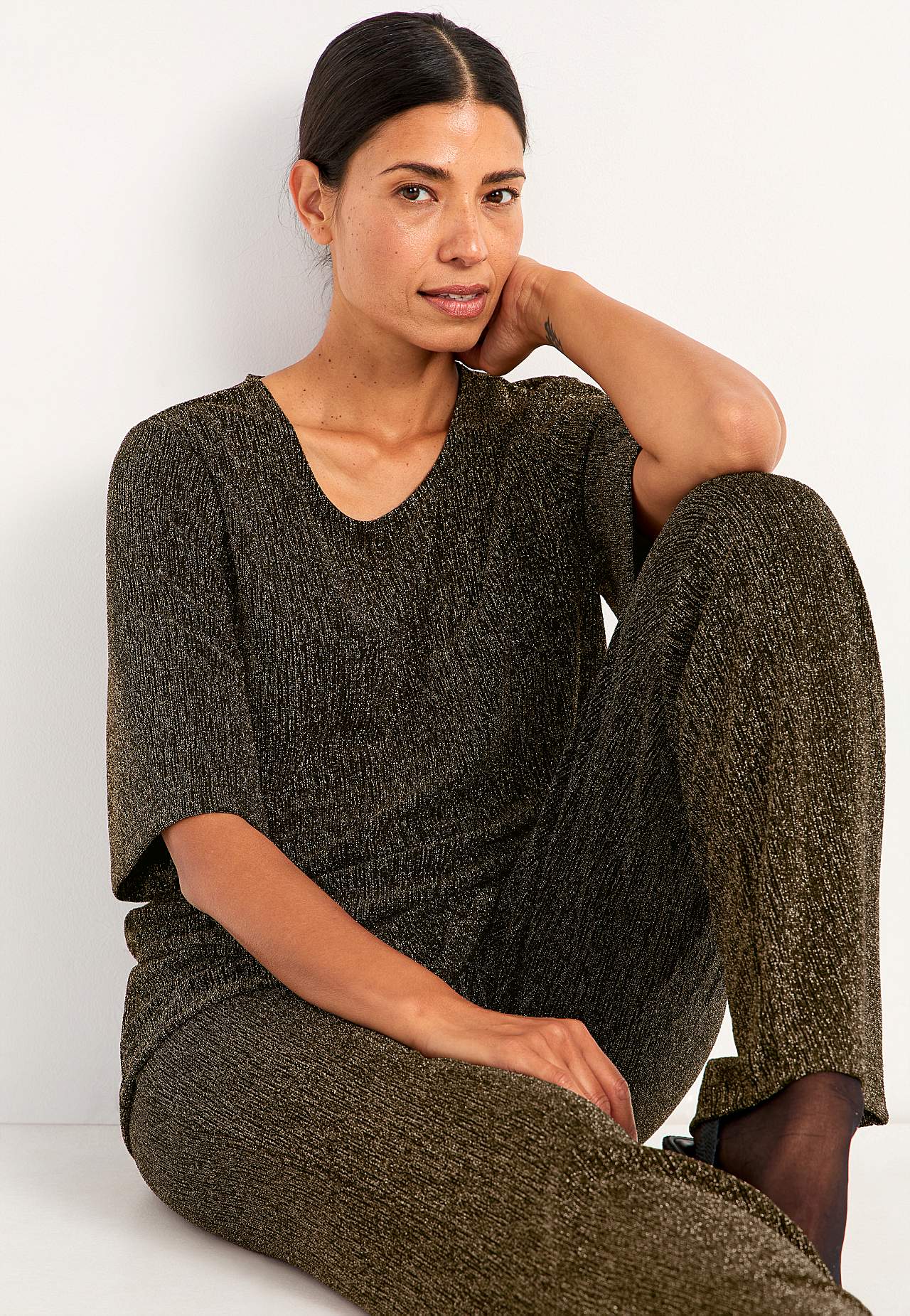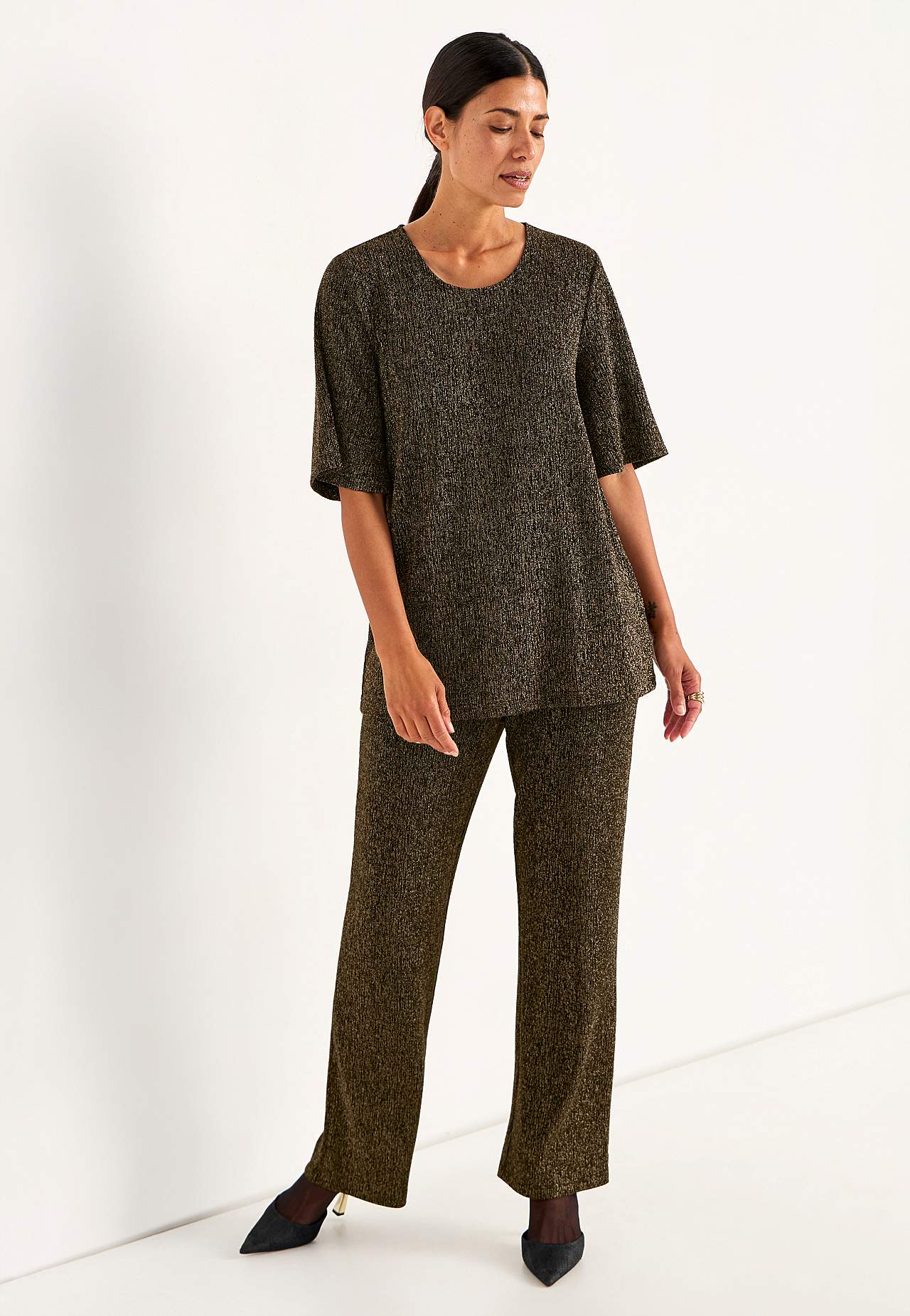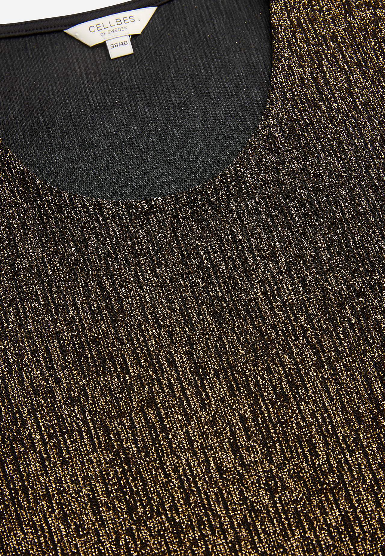 Glanzende jersey tuniek perfect voor de feestelijkheden. A-gevormde pasvorm. Zacht en elastisch materiaal met glitterdraden. Ronde halslijn. 3/4 lengte raglanmouwen met aardige breedte. Licht afgeronde zoom. De lengte varieert met de maat: ongeveer 71-88 cm.
