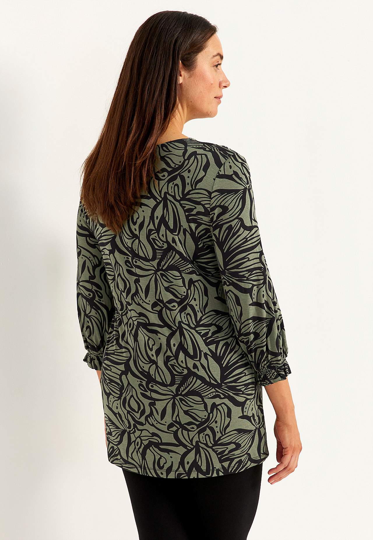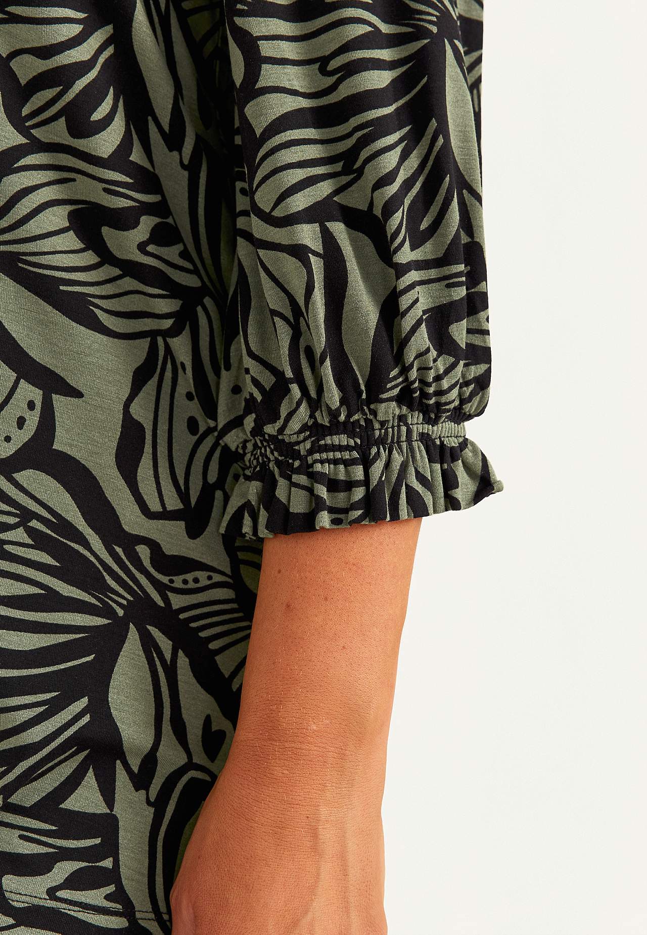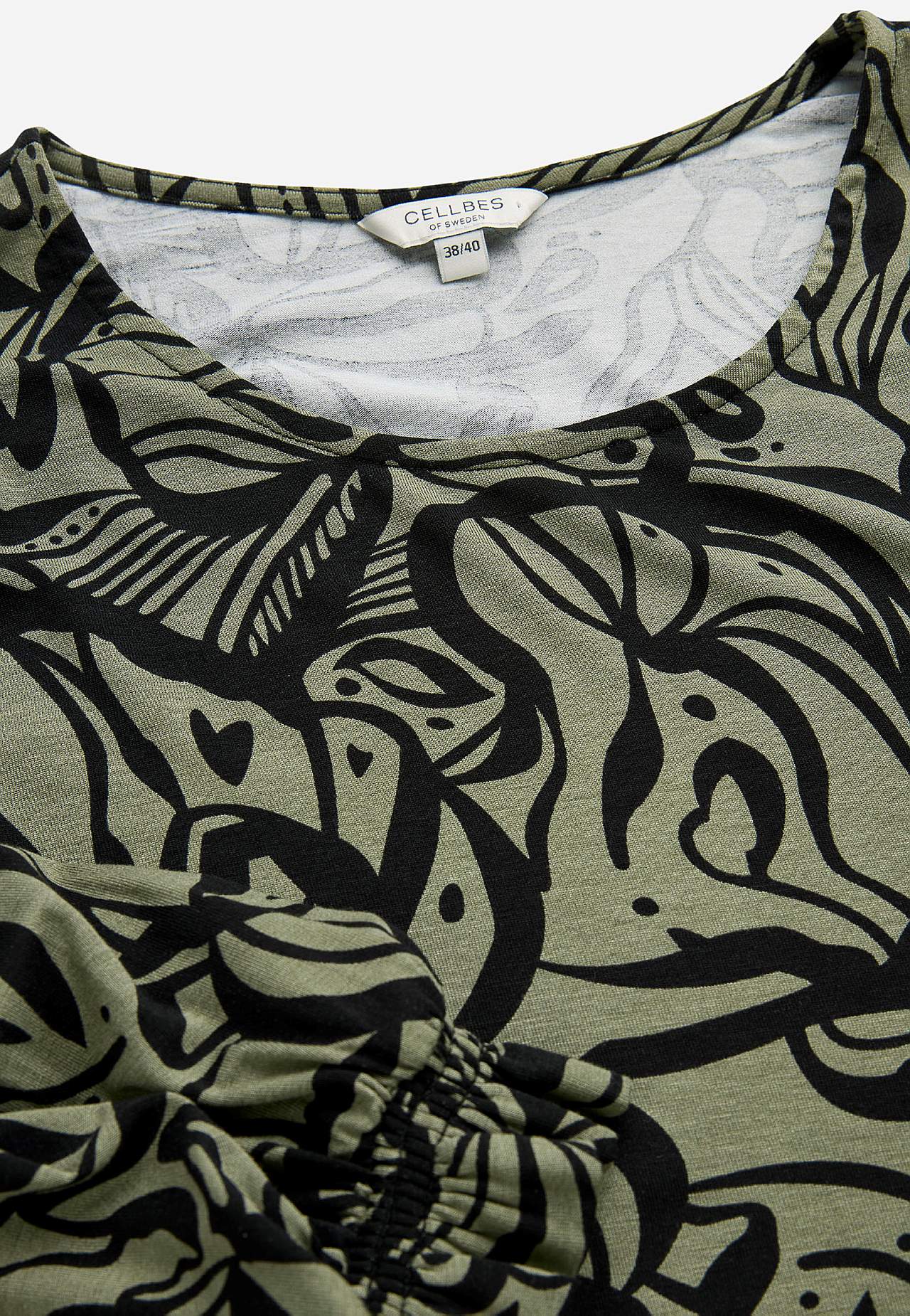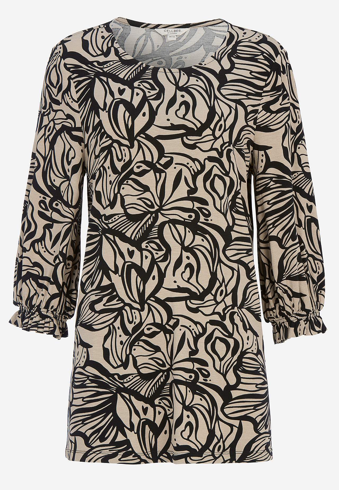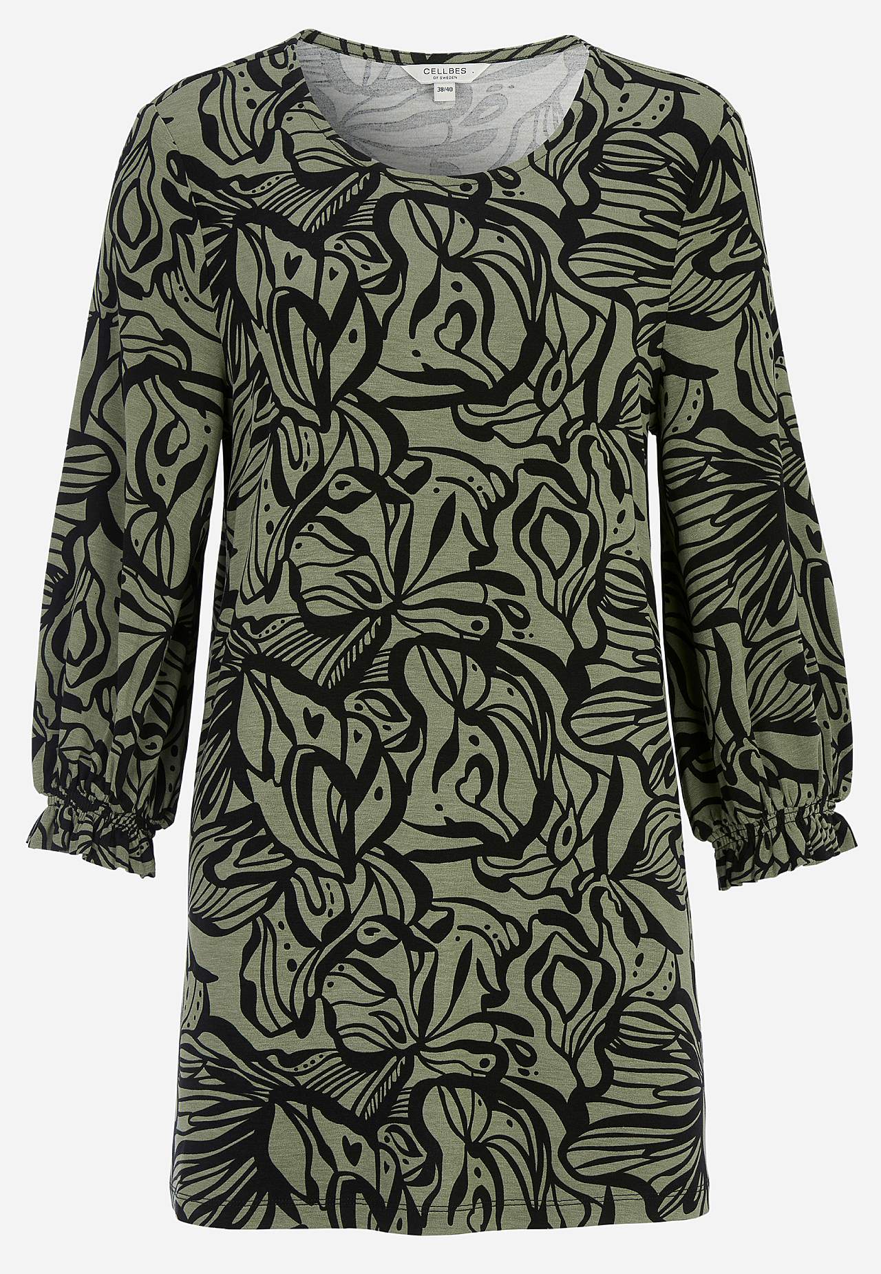 Aardige en zware val. Regular pasvorm. Afgeronde nek. 3/4 lengte en wijde mouwen en smokwerk bij de manchetten. De lengte varieert afhankelijk van de maat: ongeveer 73-80 cm vanaf de schouder.