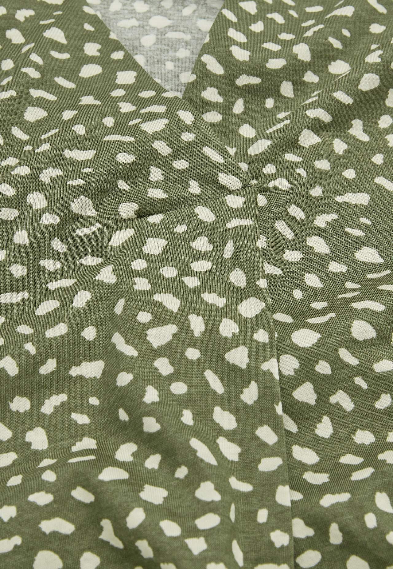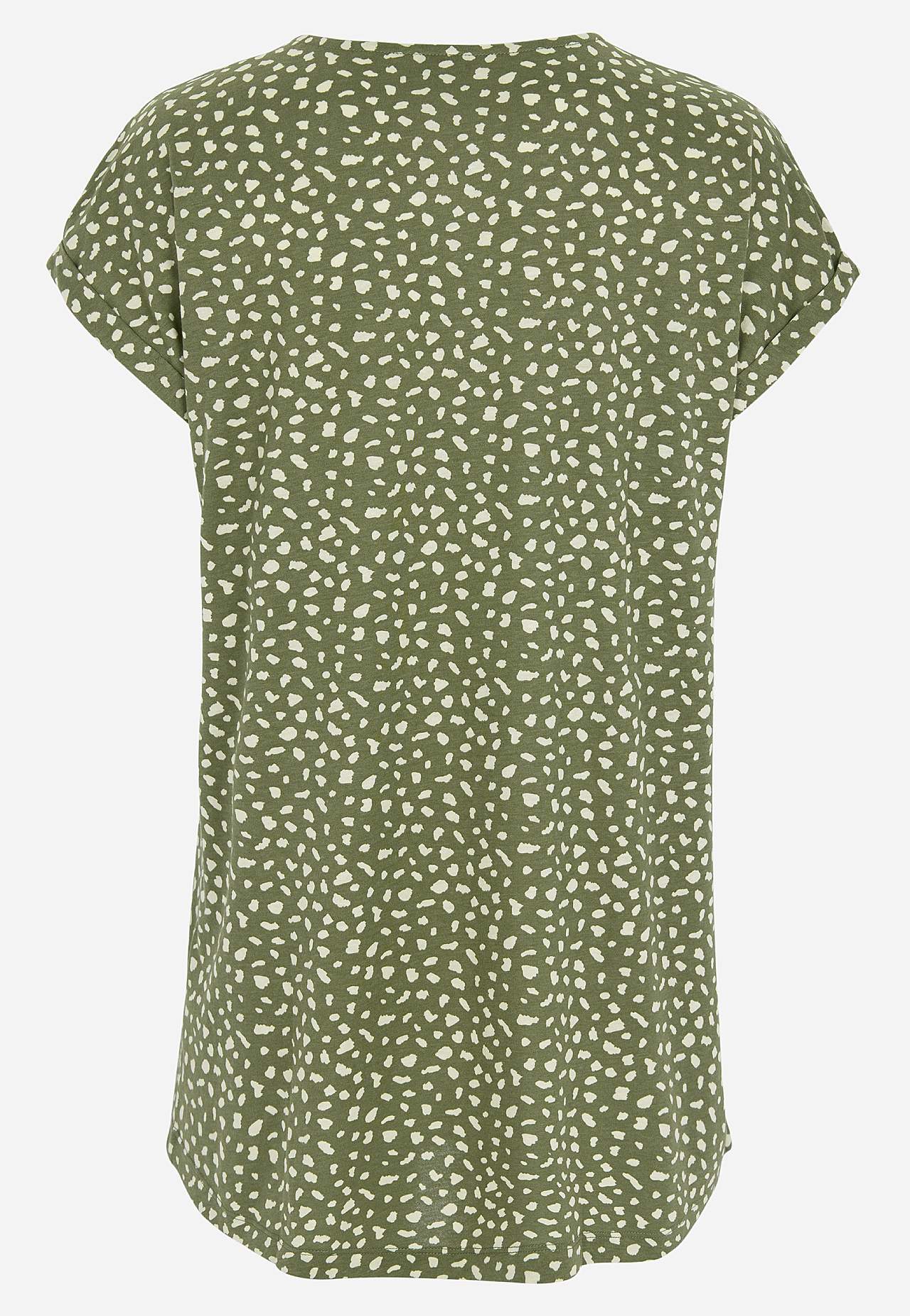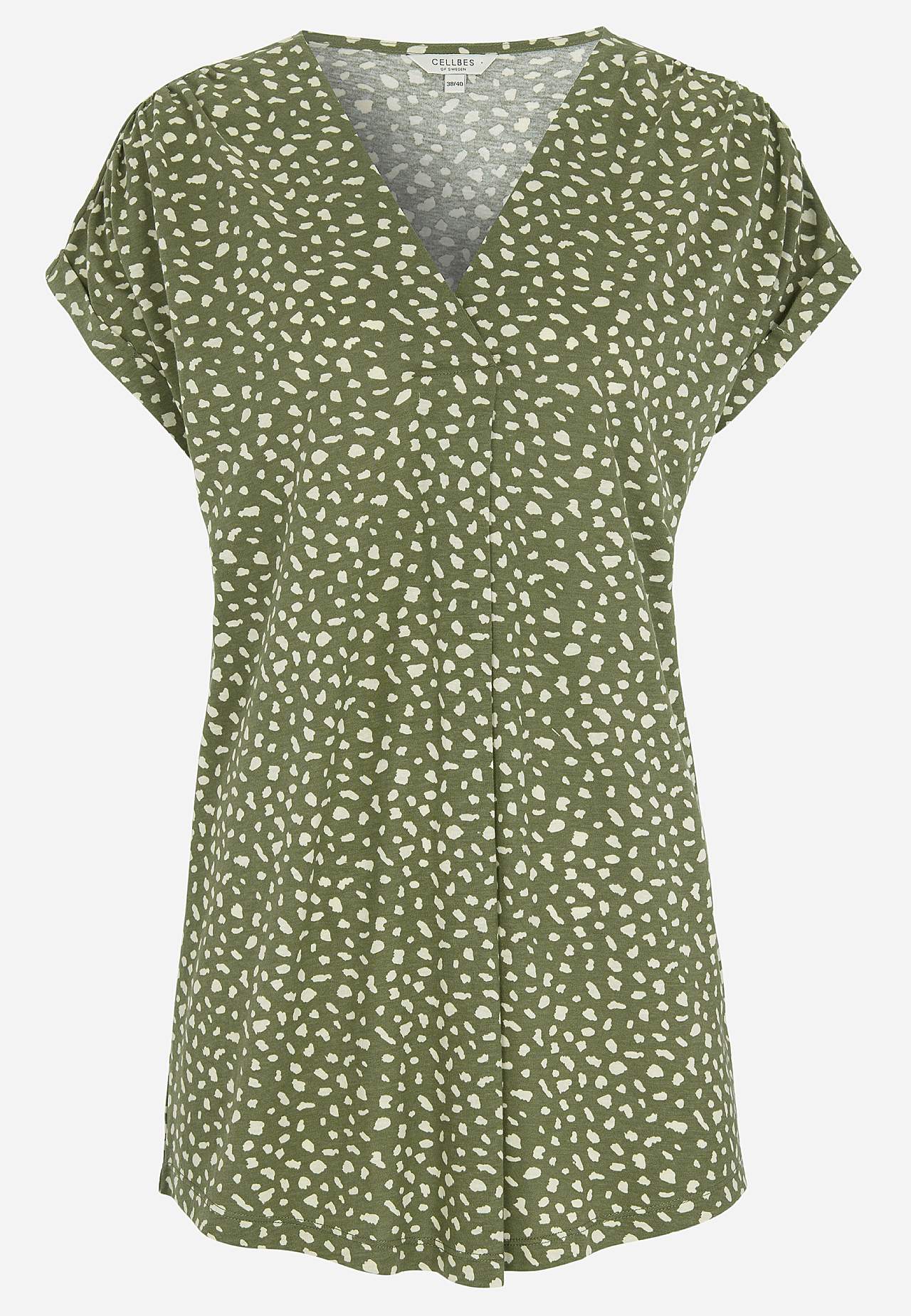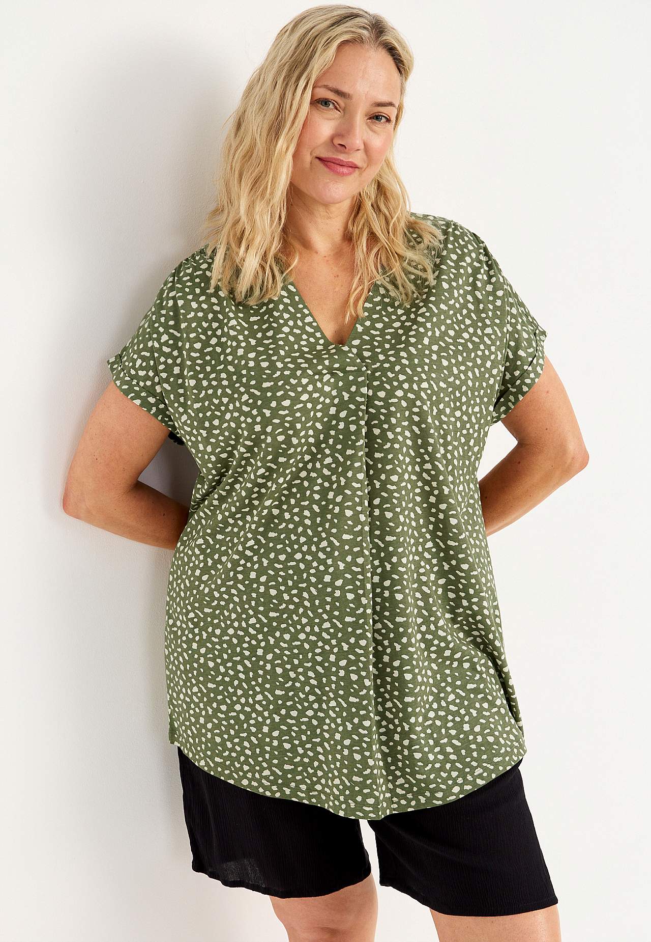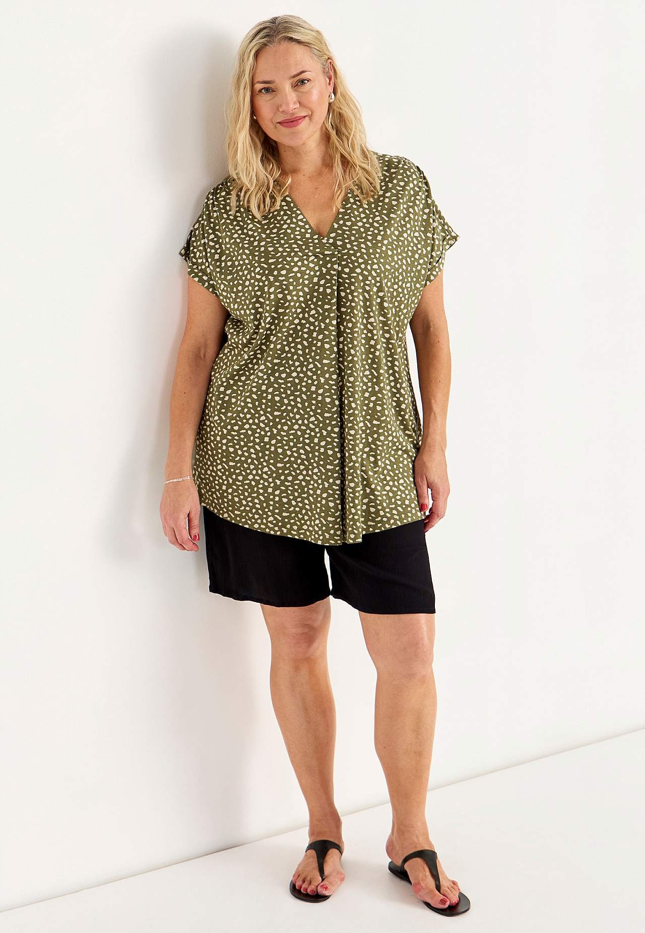 Jersey-topje van heerlijk zachte katoen en modal mix. Rechte snitte pasvorm met afgeronde zoom. Model met grote plooi aan de voorkant en een v-hals. Korte kapmouwen met opgerolde mouw. Decoratieve kreuk details aan de schouders. De lengte varieert afhankelijk van de maat: ongeveer 76-87 cm vanaf de schouder.
