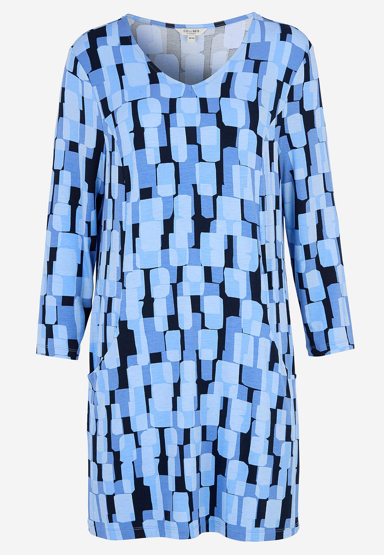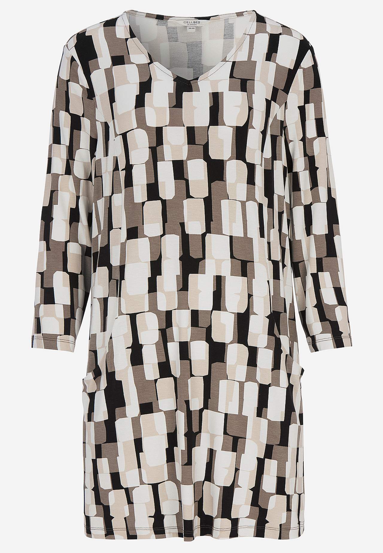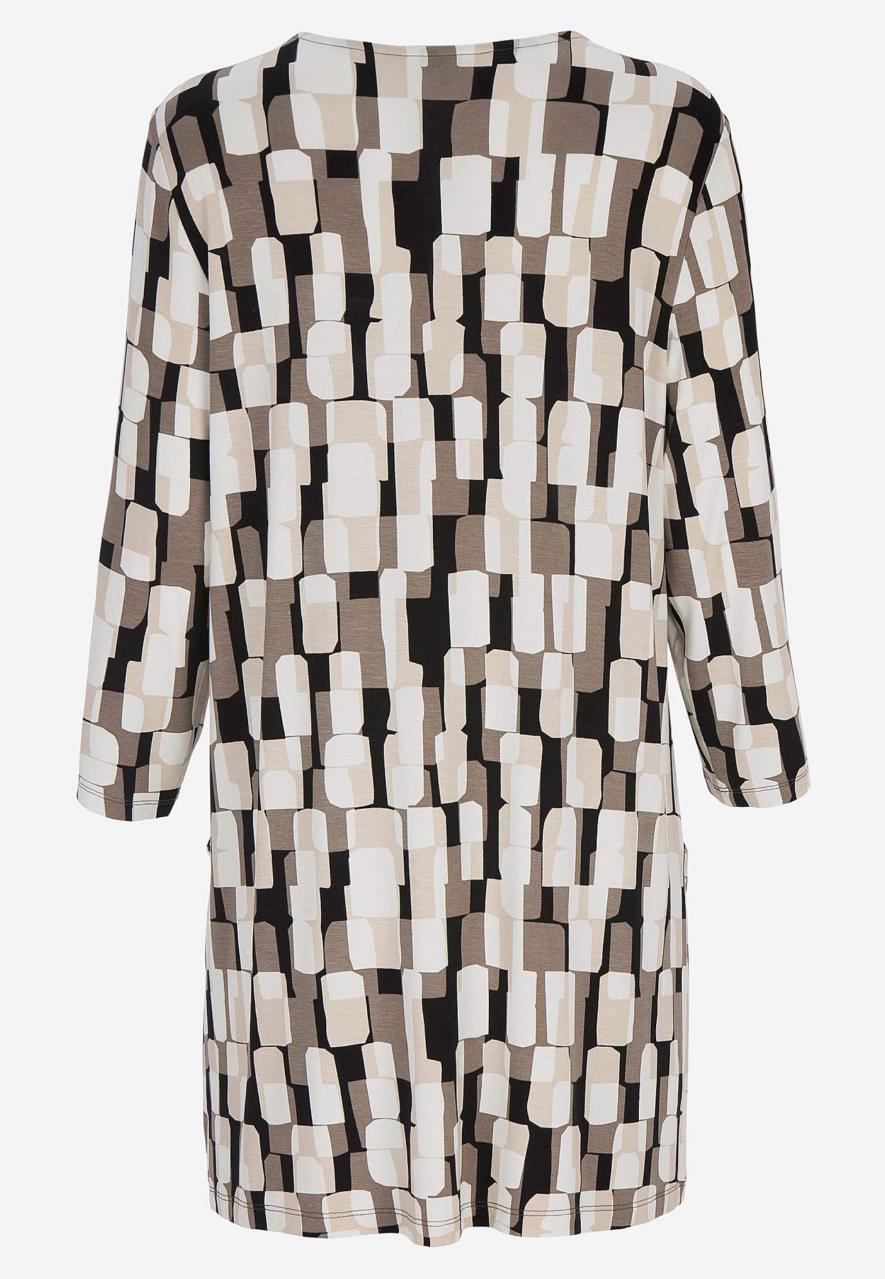 Tuniek van wonderbaarlijk zacht en elastisch viscose. Verkoelend materiaal met mooie val. Regular pasvorm. V-vormige nek. Paneelnaden aan de voorkant. Zakken aan de voorkant. Rechte 3/4 mouwen. Rechte zoom. De lengte varieert afhankelijk van de maat: ongeveer 82-89 cm vanaf de schouder.