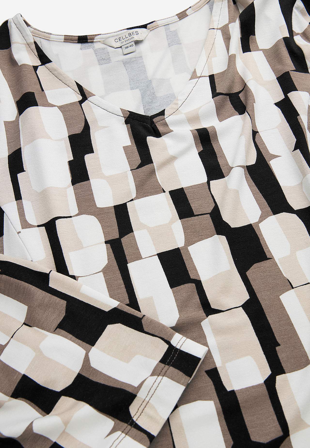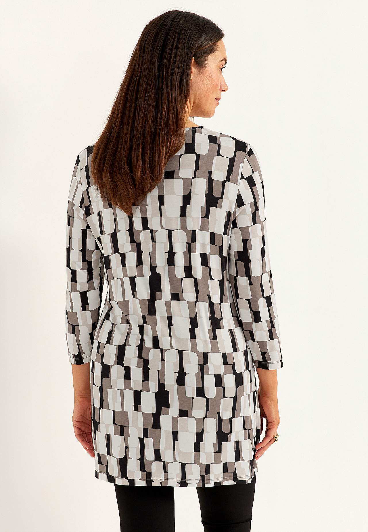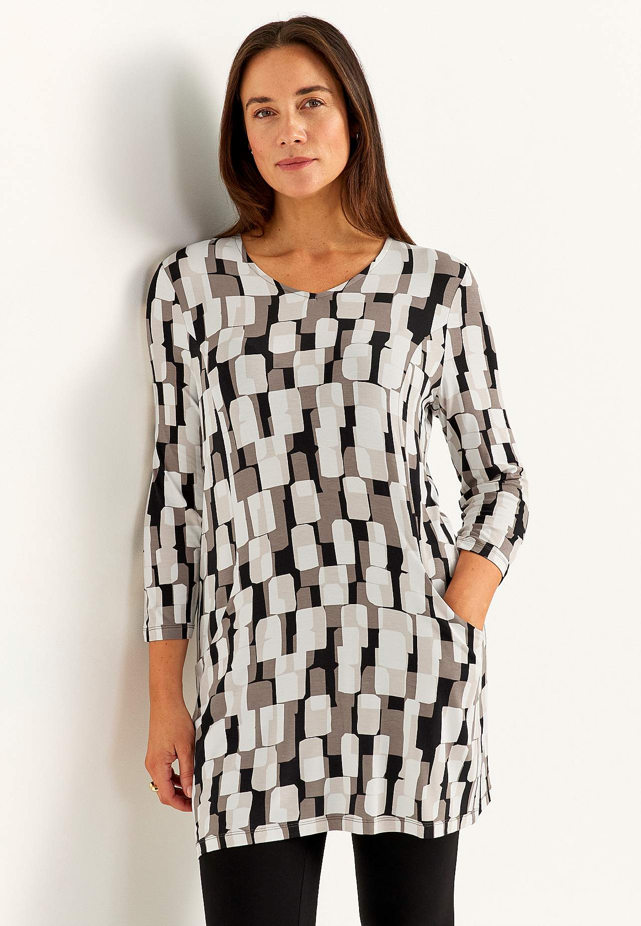 Tuniek van wonderbaarlijk zacht en elastisch viscose. Verkoelend materiaal met mooie val. Regular pasvorm. V-vormige nek. Paneelnaden aan de voorkant. Zakken aan de voorkant. Rechte 3/4 mouwen. Rechte zoom. De lengte varieert afhankelijk van de maat: ongeveer 82-89 cm vanaf de schouder.
